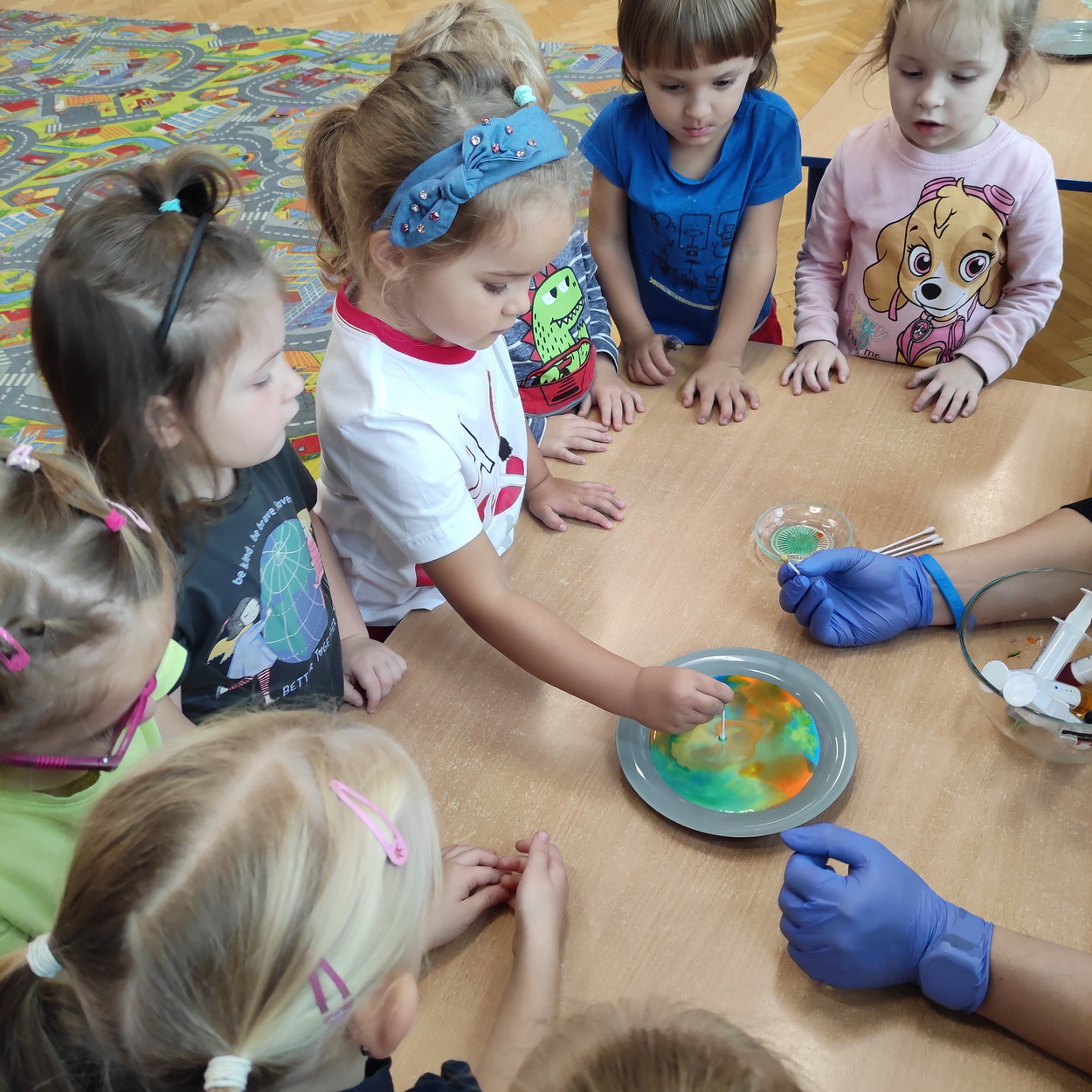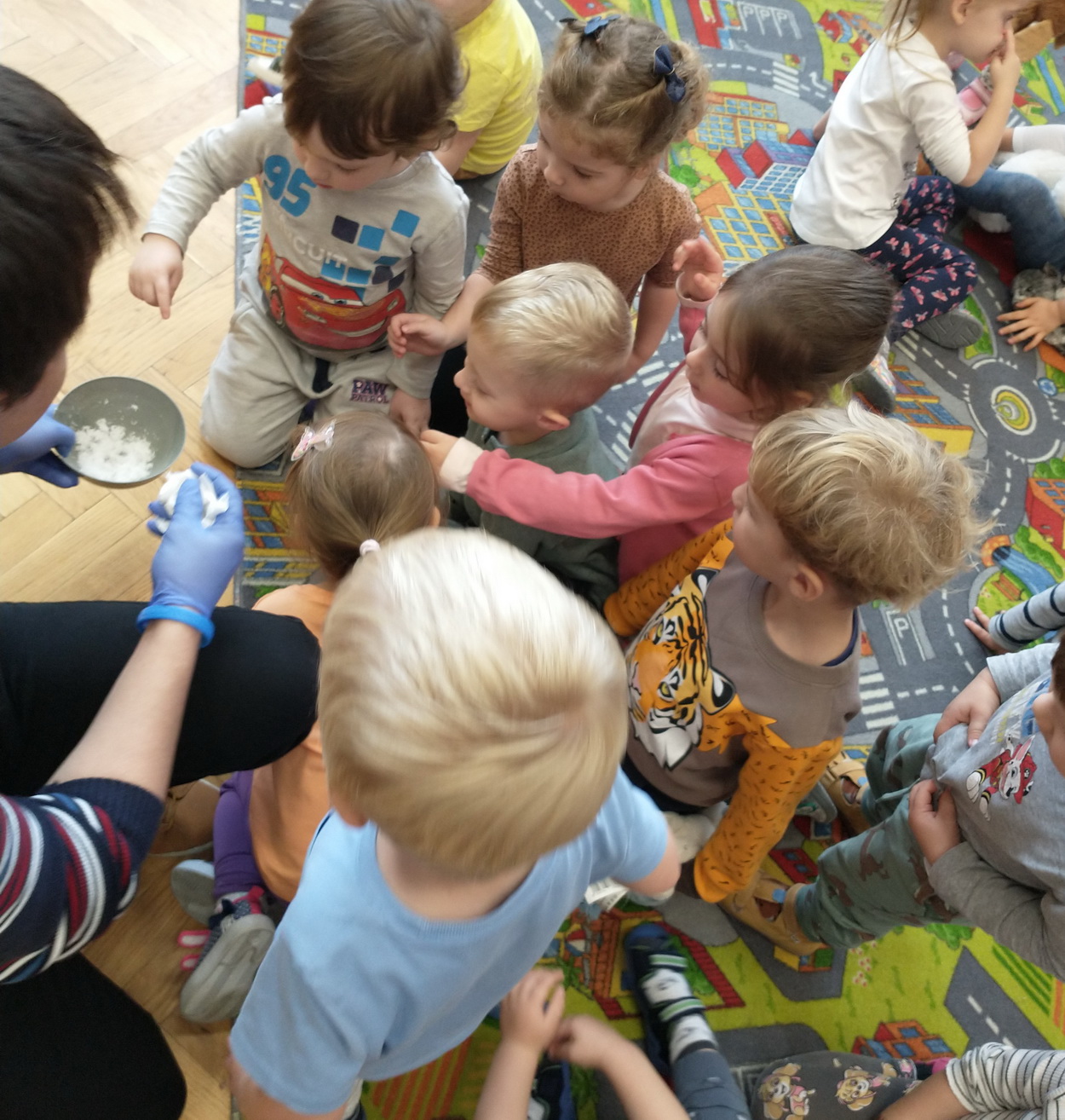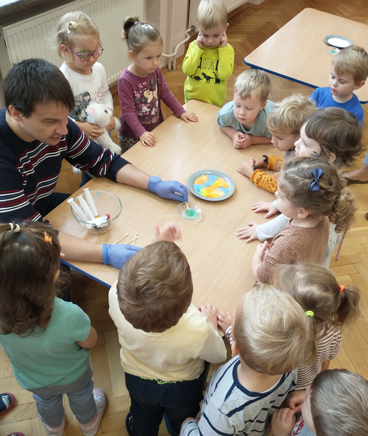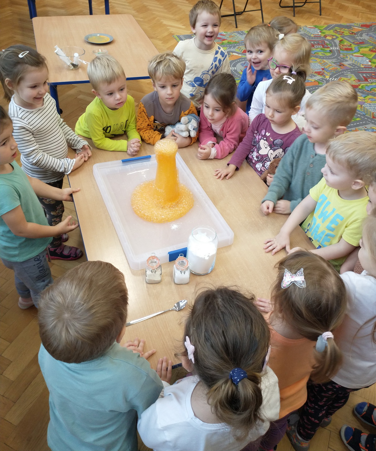 Dzieci z grup: Misie, Żabki oraz Słoneczka miały możliwość poczuć się jak prawdziwi naukowcy. Wspólnie z prowadzącym warsztaty “Świat eksperymentów” odkrywały i wyjaśniały zjawiska, które zachodzą obok nas. Przedszkolaki zobaczyły, na jakich zasadach działa silnik odrzutowca, poznały m.in. moc wulkanu, jak reaguje płomień i woda na brak tlenu. Mali badacze byli zgodni, że eksperymentowanie oraz przeprowadzanie doświadczeń jest niezwykle ciekawe i pouczające. Kto wie, może już w niejednej głowie tworzy się coś niezwykłego i odkrywczego?