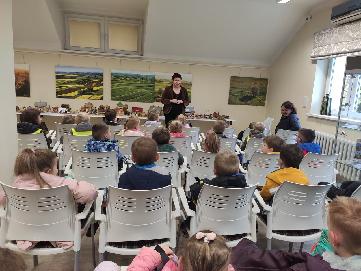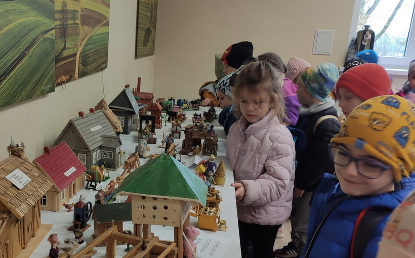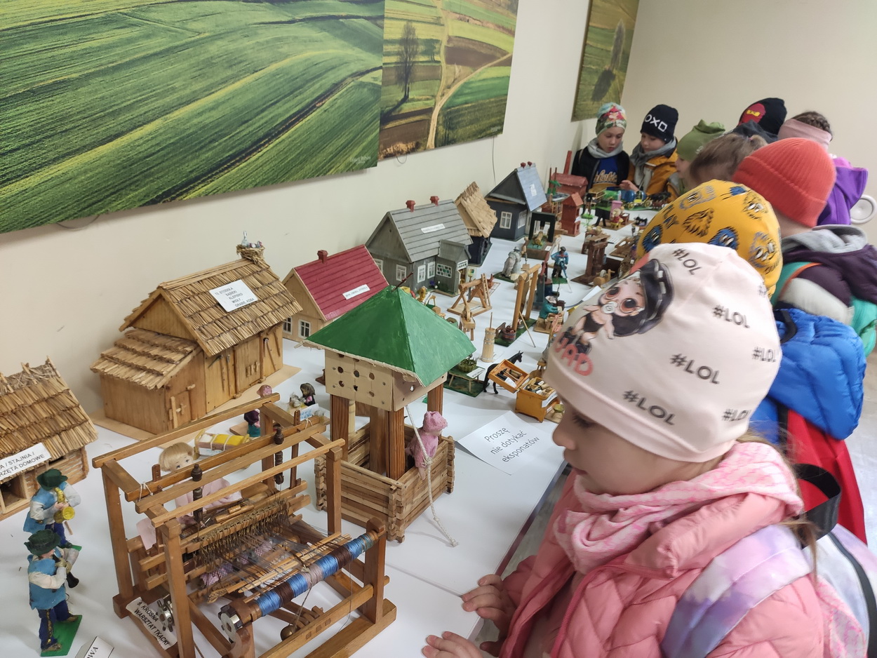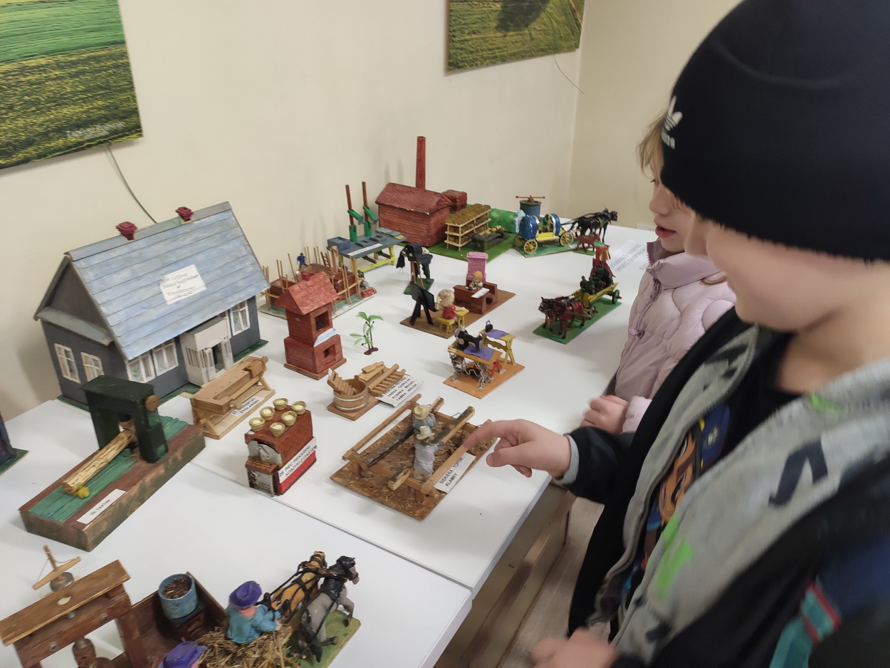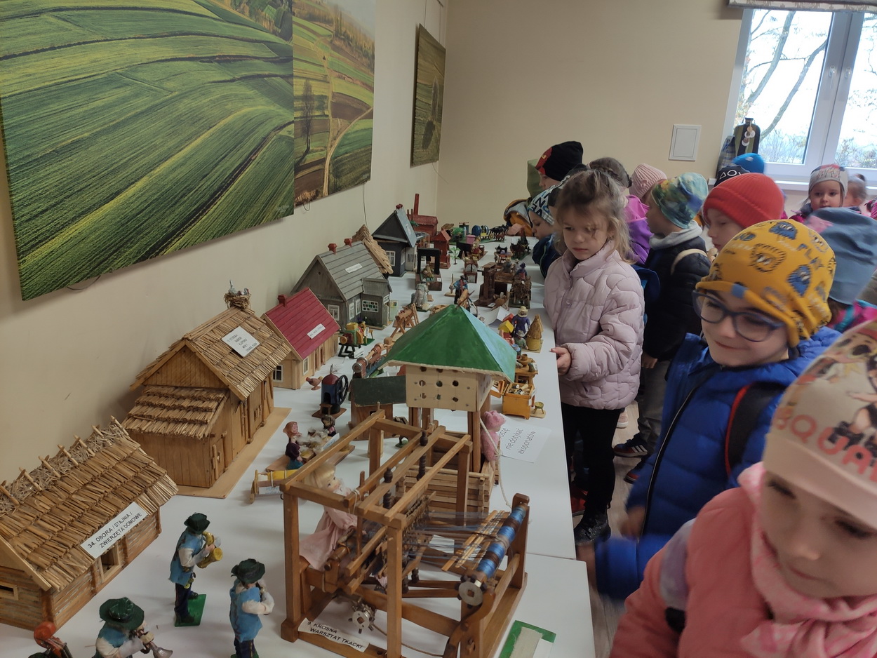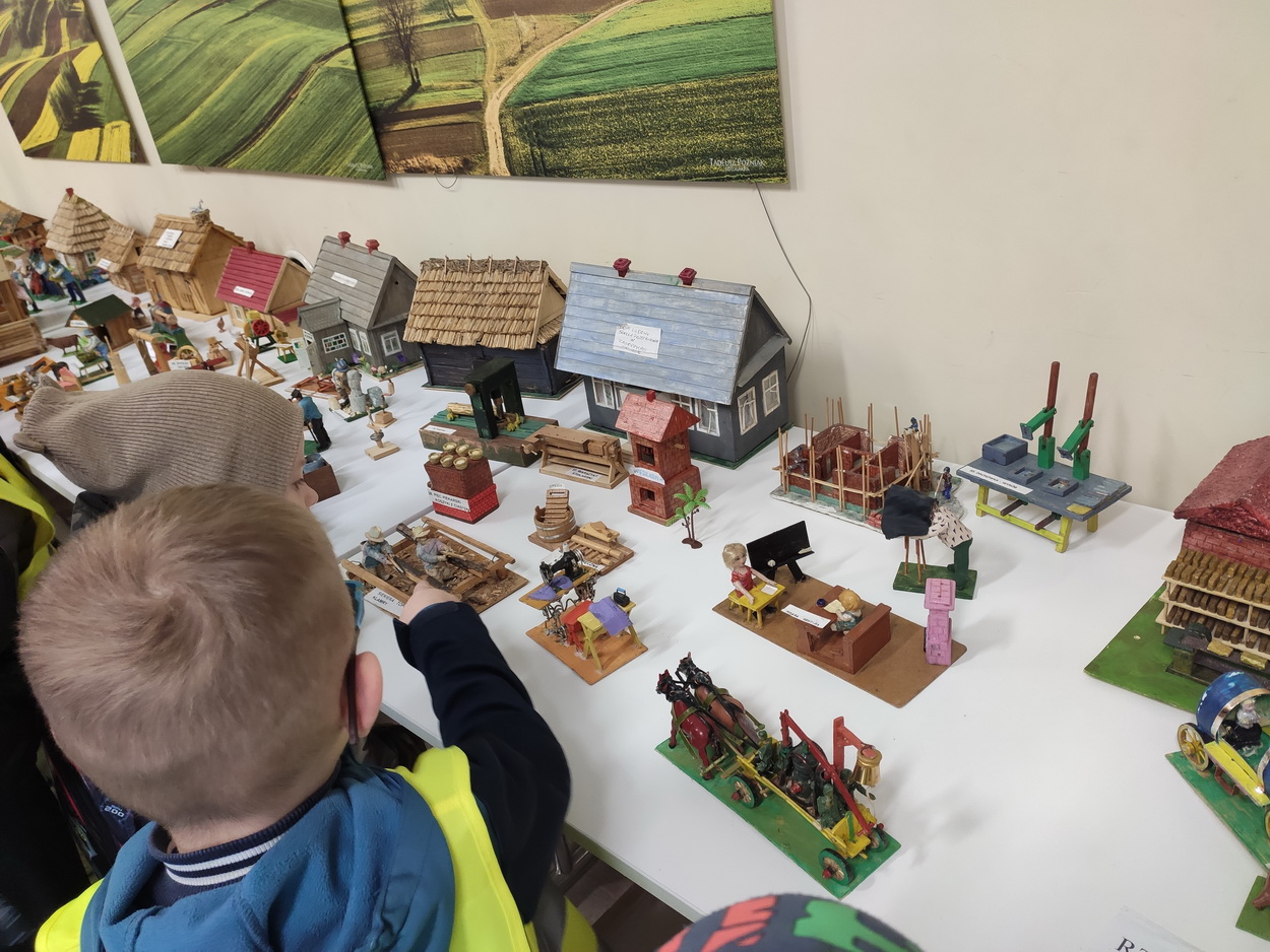 25 października dzieci z grup Biedronki i Tygryski wybrały się na wycieczkę do Gminnej Biblioteki Publicznej i parku w Boguchwale. Na miejscu czekała na nich niesamowita wystawa miniatur, zatytułowana „Ocalić od zapomnienia”. Miniskansen przedstawiał wszystkie urządzenia, jakie były potrzebne do pracy w domu, na polu oraz w warsztatach rzemieślników. Pan Józef Woźnik, czyli autor wystawy, wykonał miniatury własnoręcznie z drewna, sklejek, z opakowań, gwoździ i naturalnych surowców, m.in. słomy czy sznurka. Chciał w ten sposób starszemu pokoleniu przypomnieć czasy dzieciństwa, szczególnie spędzonego na wsi, a młodemu – pokazać, ile trudu wymagała praca dawniej.
