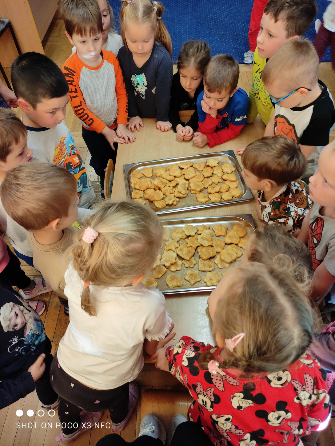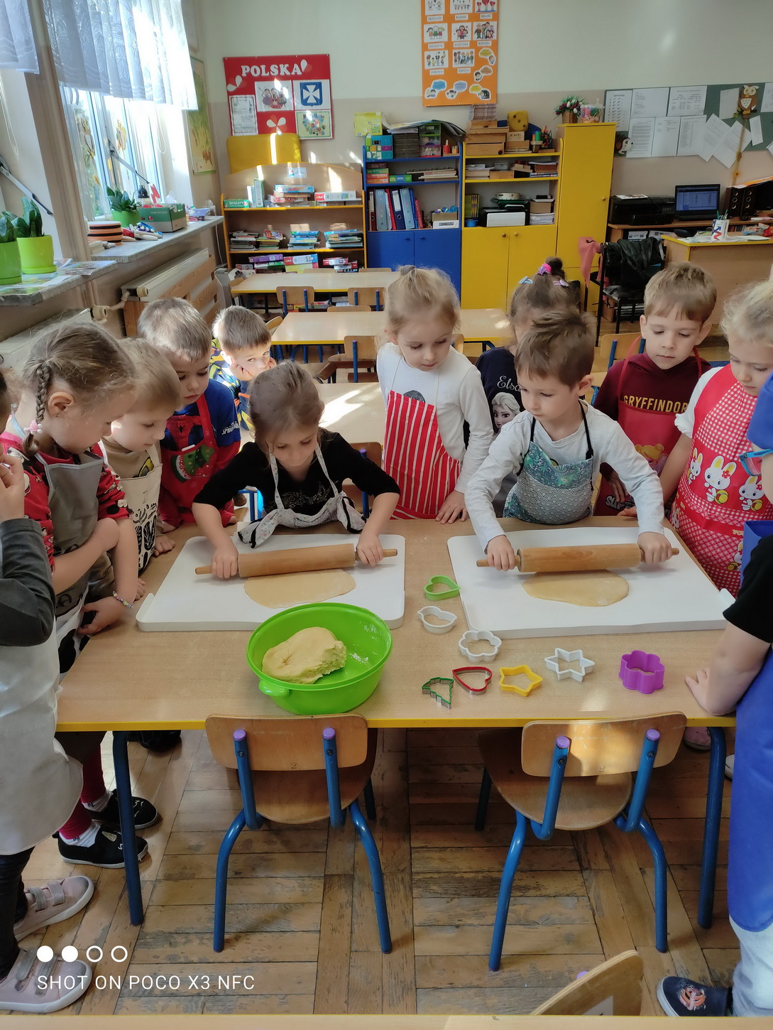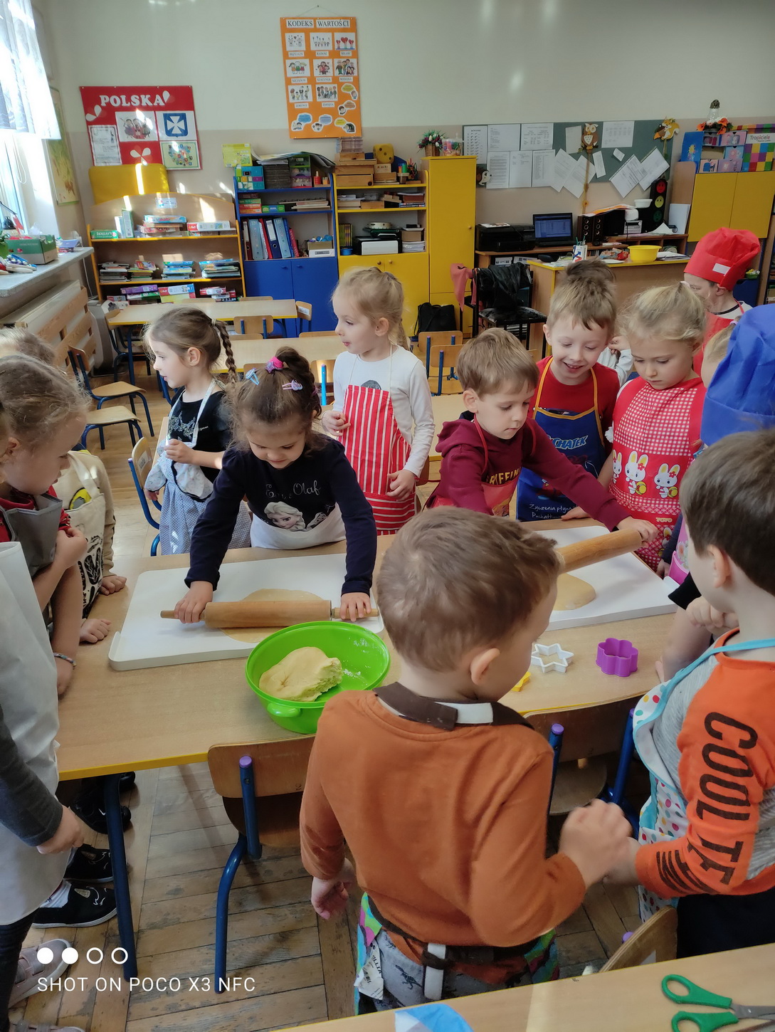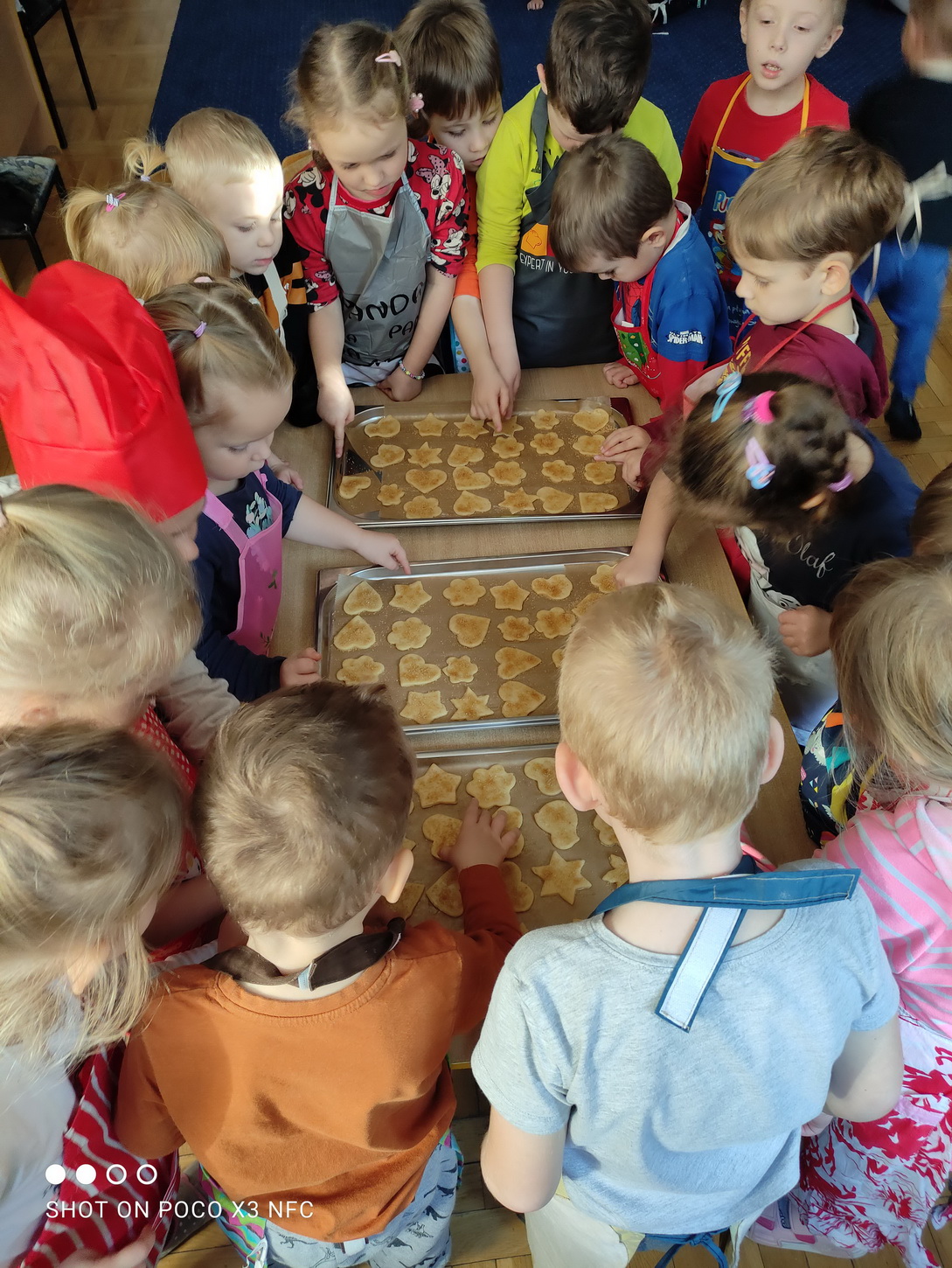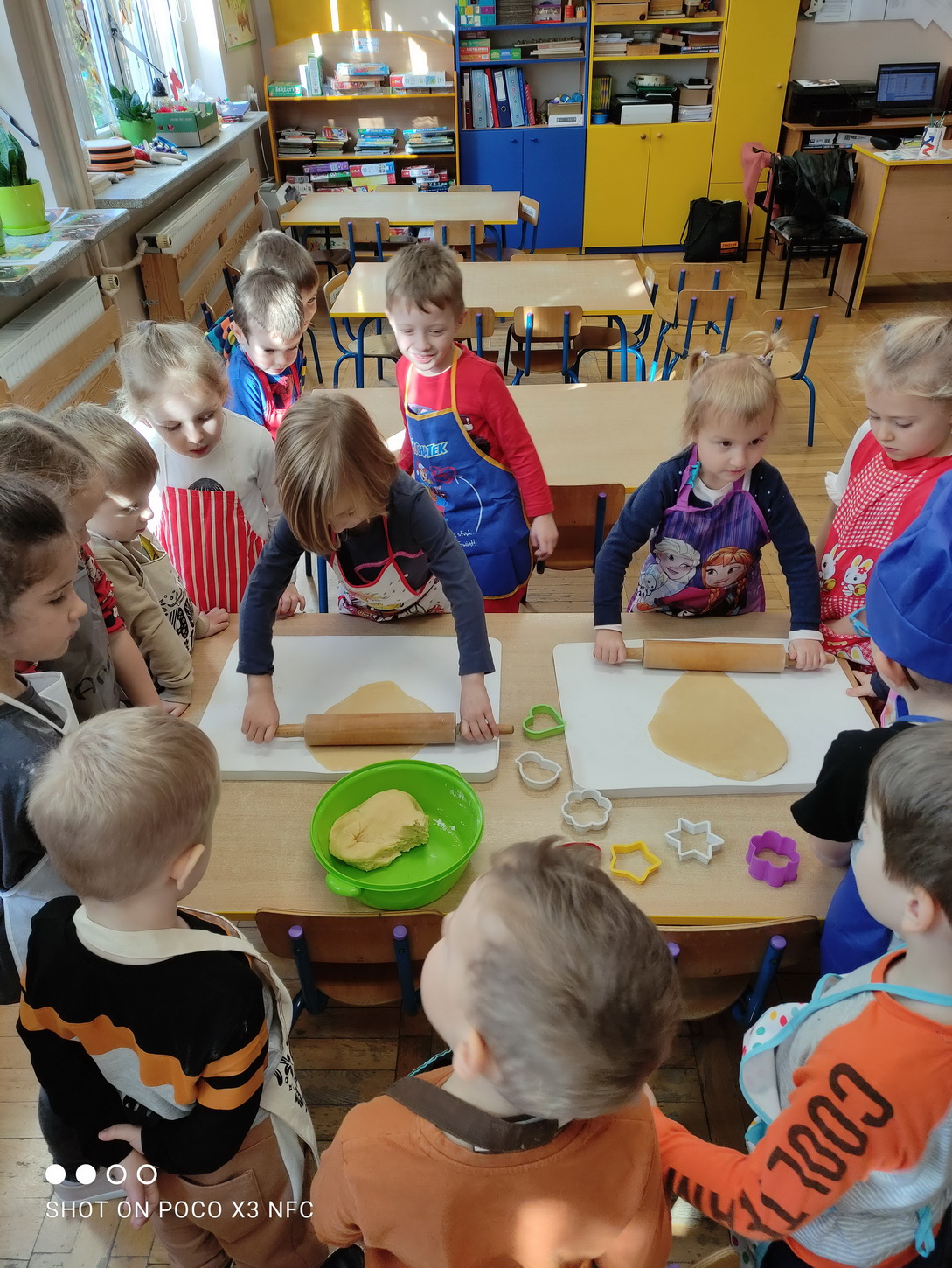 Ostatnie środowe przedpołudnie przedszkolaki z grupy Biedronki spędziły niezwykle pracowicie. Motywem przewodnim tego dnia było pieczenie ciasteczek. Wszystkie dzieci ochoczo i z wielkim zaangażowaniem rozgniatały i wałkowały ciasto. Największą radość sprawiło dzieciom wykrawanie ciasteczek przy użyciu foremek. Były między innymi serduszka, gwiazdeczki czy kwiatuszki. Następnie ciasteczka zostały upieczone w przedszkolnej kuchni, a dookoła rozchodził się aromatyczny zapach…