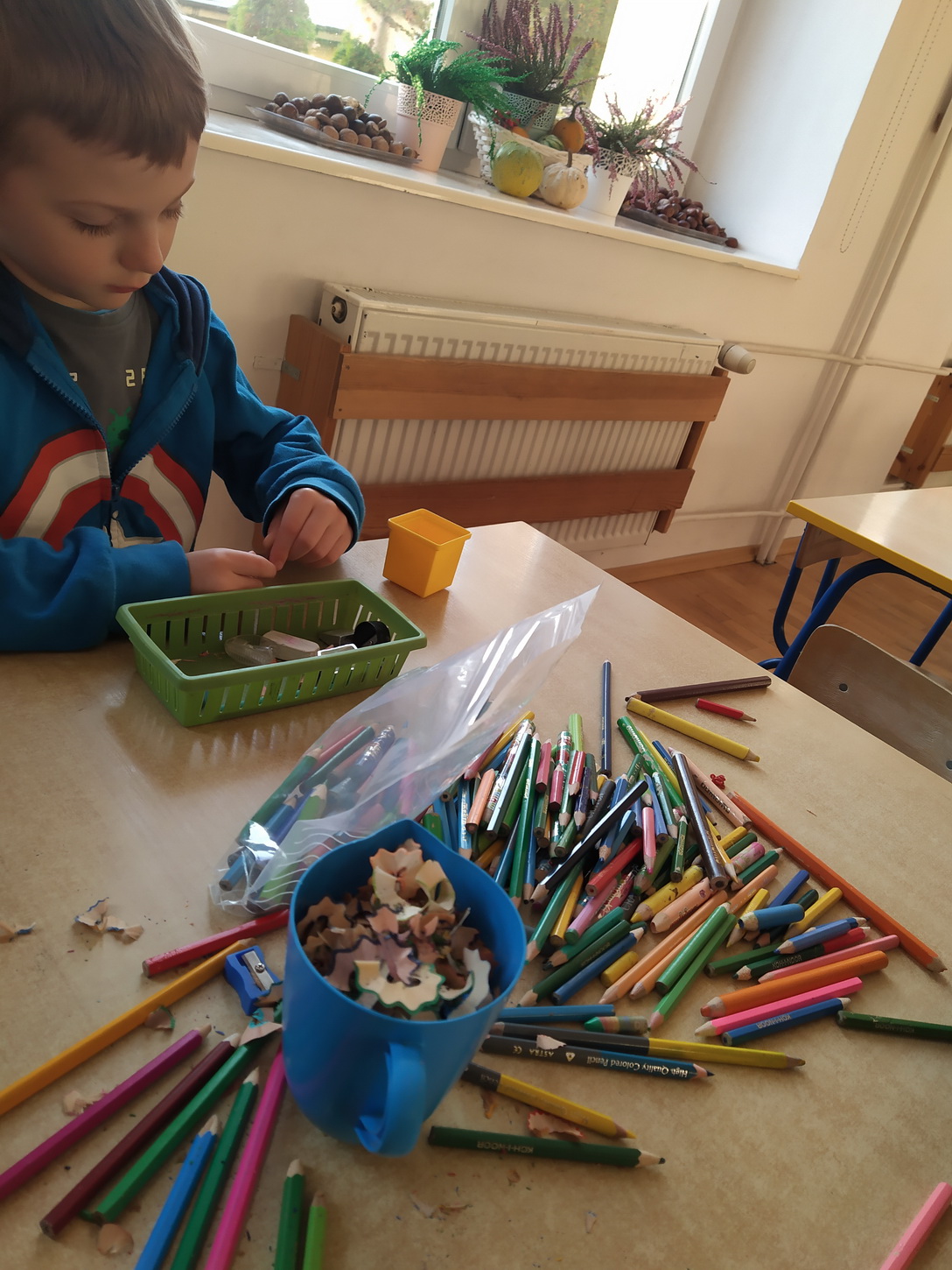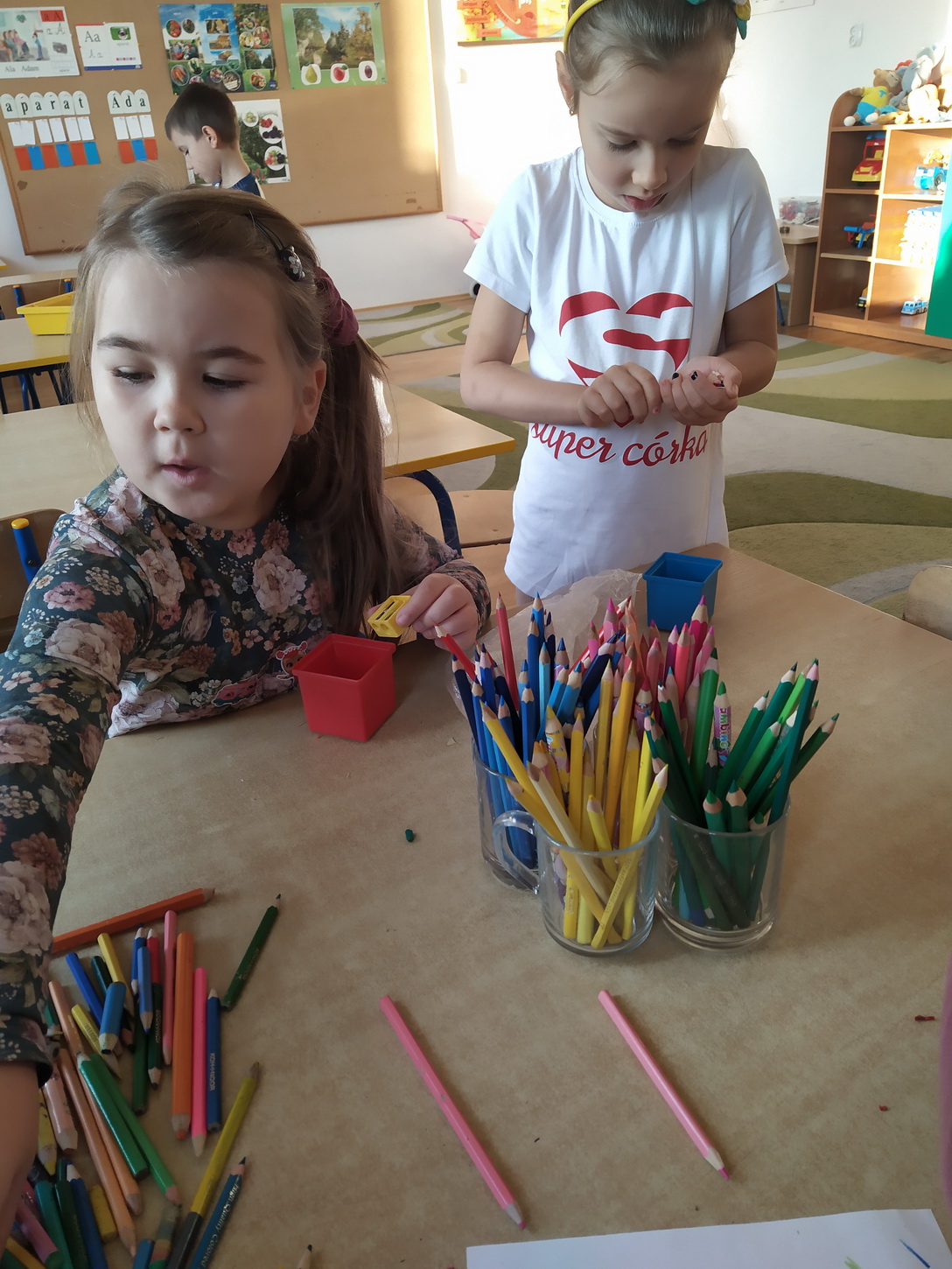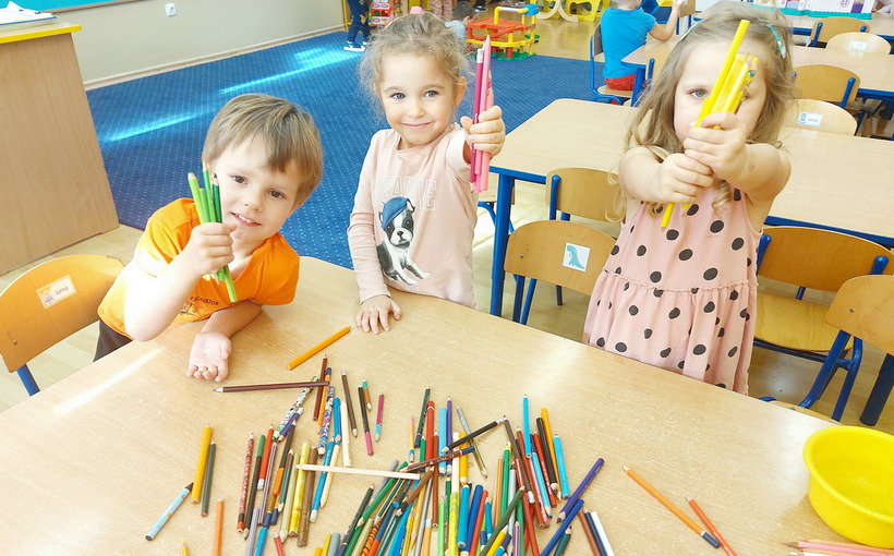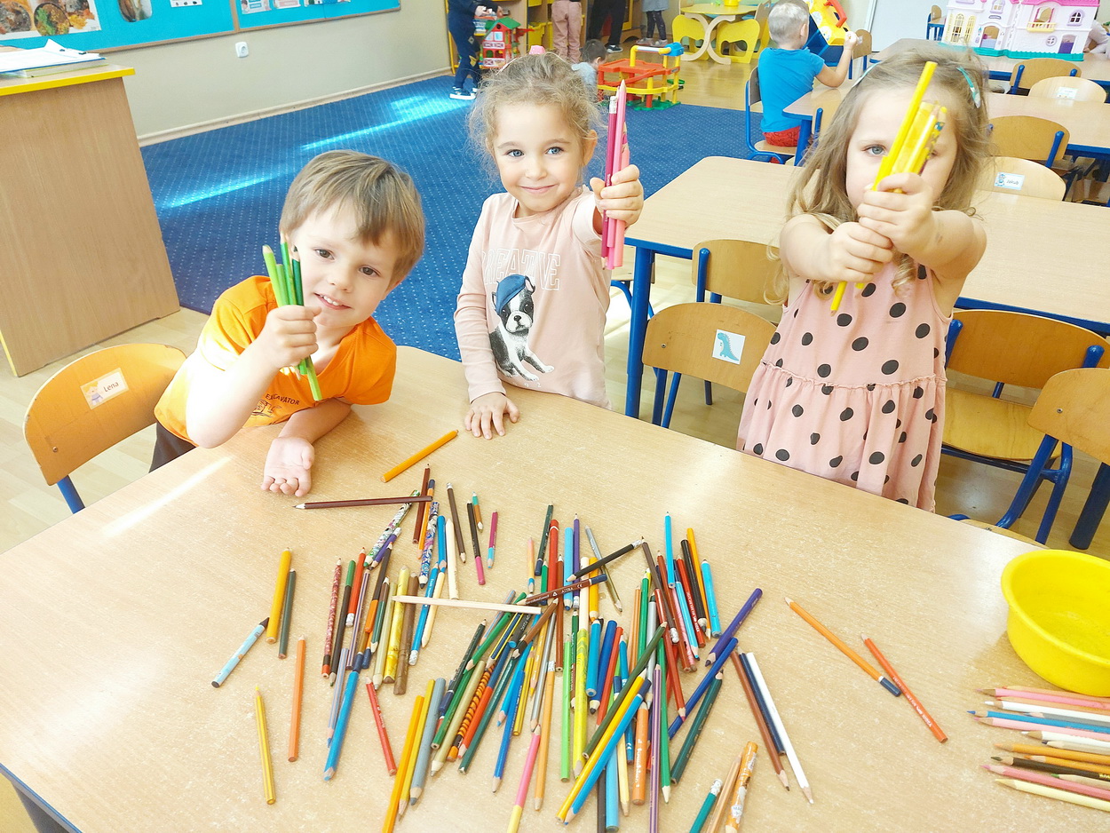 Końcem września nasze przedszkole włączyło się do akcji „Kolorowe kredki”, której celem było zbieranie niekompletnych, częściowo zużytych kredek. Przez ponad miesiąc rodzice wraz z dziećmi przynosili je z domu i wrzucali do przygotowanego wcześniej pudełka. Wspólnymi siłami udało się nam zebrać 8 kg kredek. Następnie przedszkolaki dzielnie pomagały w ich ostrzeniu i segregacji. Paczkę wysłaliśmy na adres organizatora zbiórki. Zebrane i odrestaurowane kredki zostaną przekazane do szpitali, szkół przyszpitalnych i innych organizacji związanych z dziećmi. Pozostałe, bardziej zniszczone kredki będą poddawane recyklingowi i przerabiane na kredkową biżuterię, która zostanie przekazana na aukcje charytatywne.