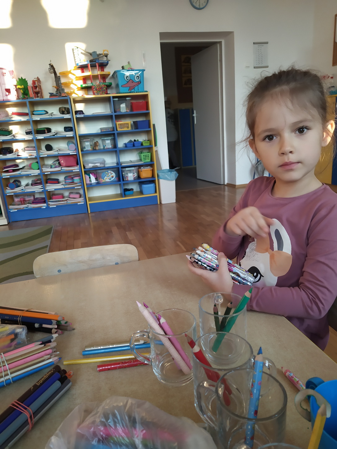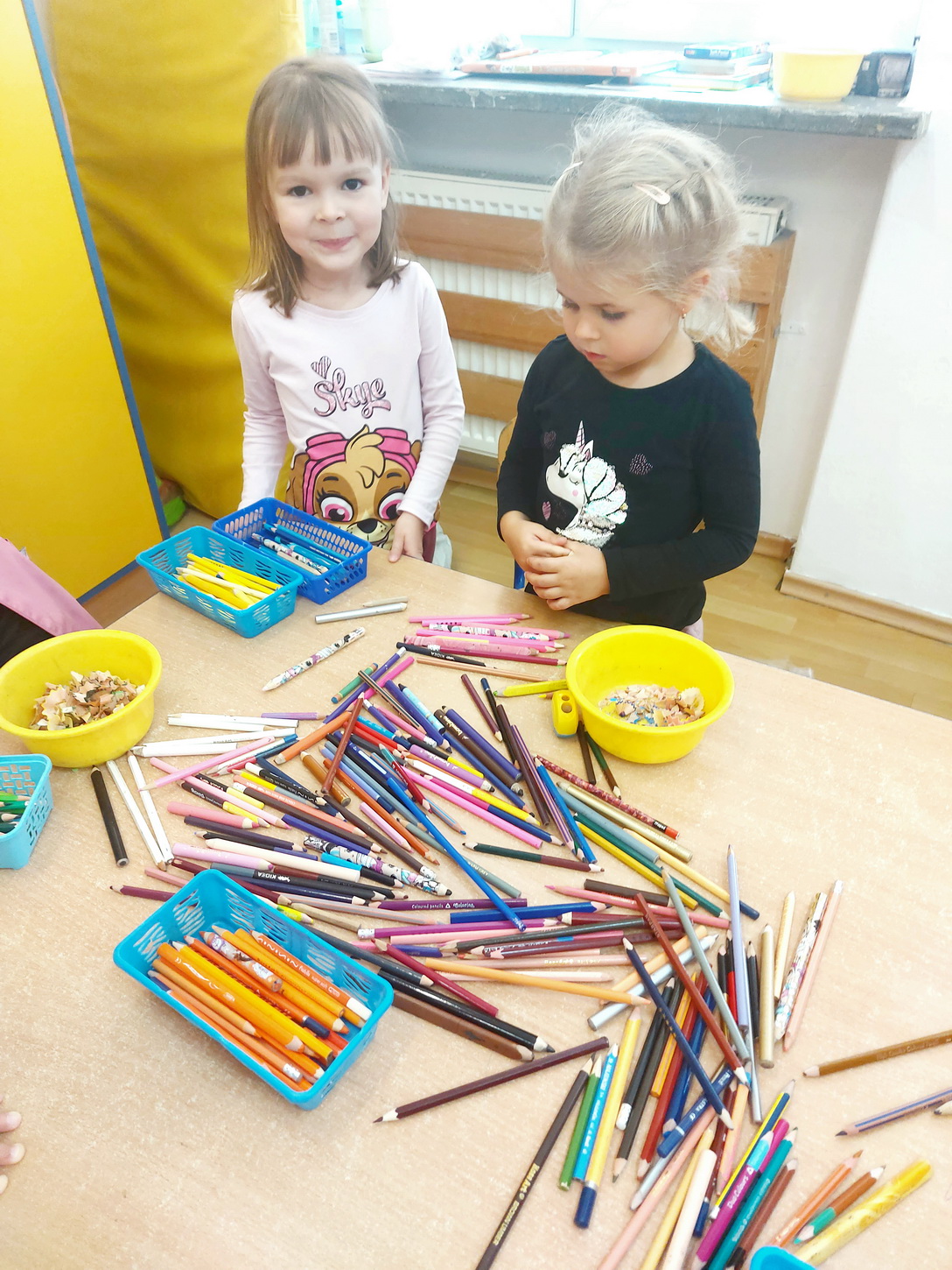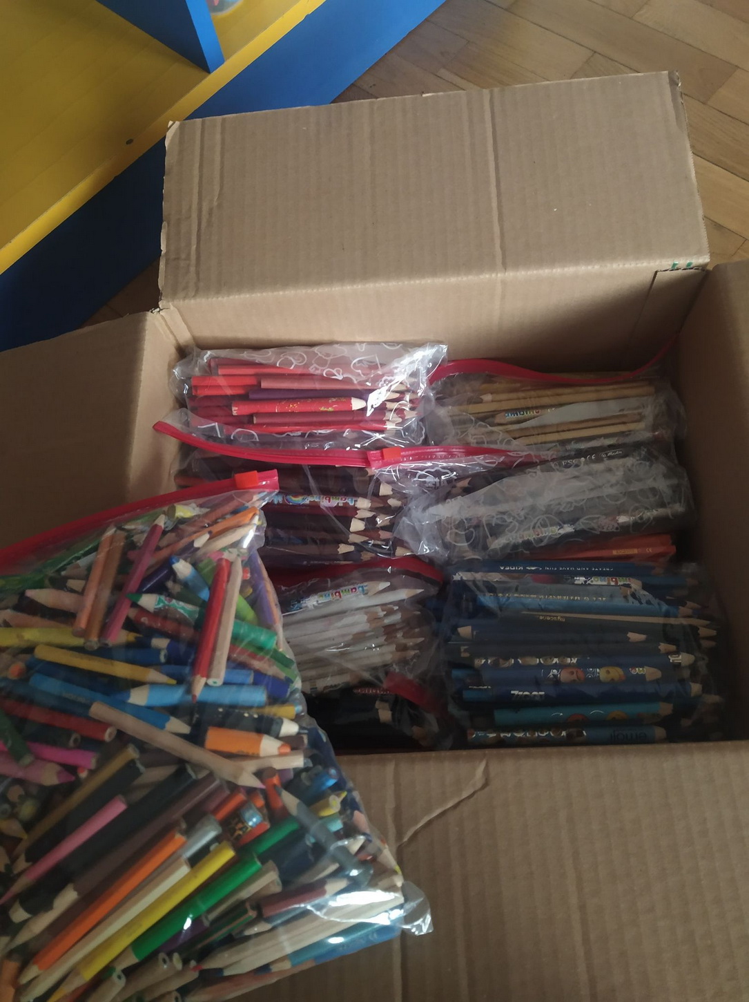 Końcem września nasze przedszkole włączyło się do akcji „Kolorowe kredki”, której celem było zbieranie niekompletnych, częściowo zużytych kredek. Przez ponad miesiąc rodzice wraz z dziećmi przynosili je z domu i wrzucali do przygotowanego wcześniej pudełka. Wspólnymi siłami udało się nam zebrać 8 kg kredek. Następnie przedszkolaki dzielnie pomagały w ich ostrzeniu i segregacji. Paczkę wysłaliśmy na adres organizatora zbiórki. Zebrane i odrestaurowane kredki zostaną przekazane do szpitali, szkół przyszpitalnych i innych organizacji związanych z dziećmi. Pozostałe, bardziej zniszczone kredki będą poddawane recyklingowi i przerabiane na kredkową biżuterię, która zostanie przekazana na aukcje charytatywne.