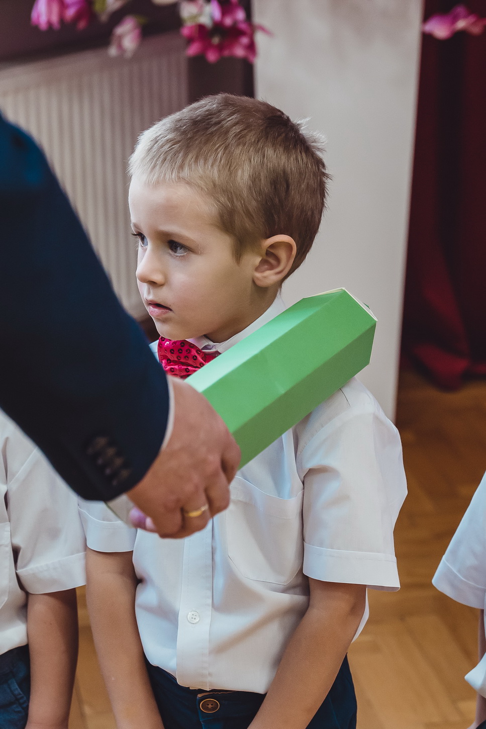 Pasowanie na przedszkolaka to wyjątkowa uroczystość, która w naszym przedszkolu odbyła się w listopadzie. Dla maluszków było to ogromne przeżycie, bowiem był to dla nich pierwszy występ na scenie. Mali artyści zaprezentowali przygotowane piosenki, tańce oraz wierszyki. Po części artystycznej, dzieci złożyły ślubowanie, potwierdzając, że zawsze będą miłe, koleżeńskie, dzielne, uśmiechnięte i kulturalne. Następnie pan dyrektor dokonał uroczystego pasowania.