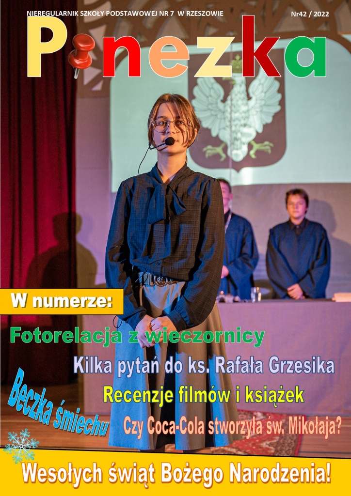 Dzisiaj ukazał się nowy, 42. już numer “Pinezki” – nieregularnika Szkoły Podstawowej nr 7. Redakcja, złożona z uczniów i uczennic klas 6-8, przygotowała w nim m.in.: fotorelację z wieczornicy, wywiad z ks. Rafałem Grzesikiem, recenzje polecanych książek i filmów, relację z wycieczek i wyjść klas 8, a także cieszącą się dużym zainteresowaniem Beczkę śmiechu. Poza tym czytelnicy znajdą informację na temat Laboratoriów Przyszłości, najciekawszych zwyczajów świątecznych oraz odpowiedź na pytanie: Czy Coca-Cola stworzyła św. Mikołaja?
