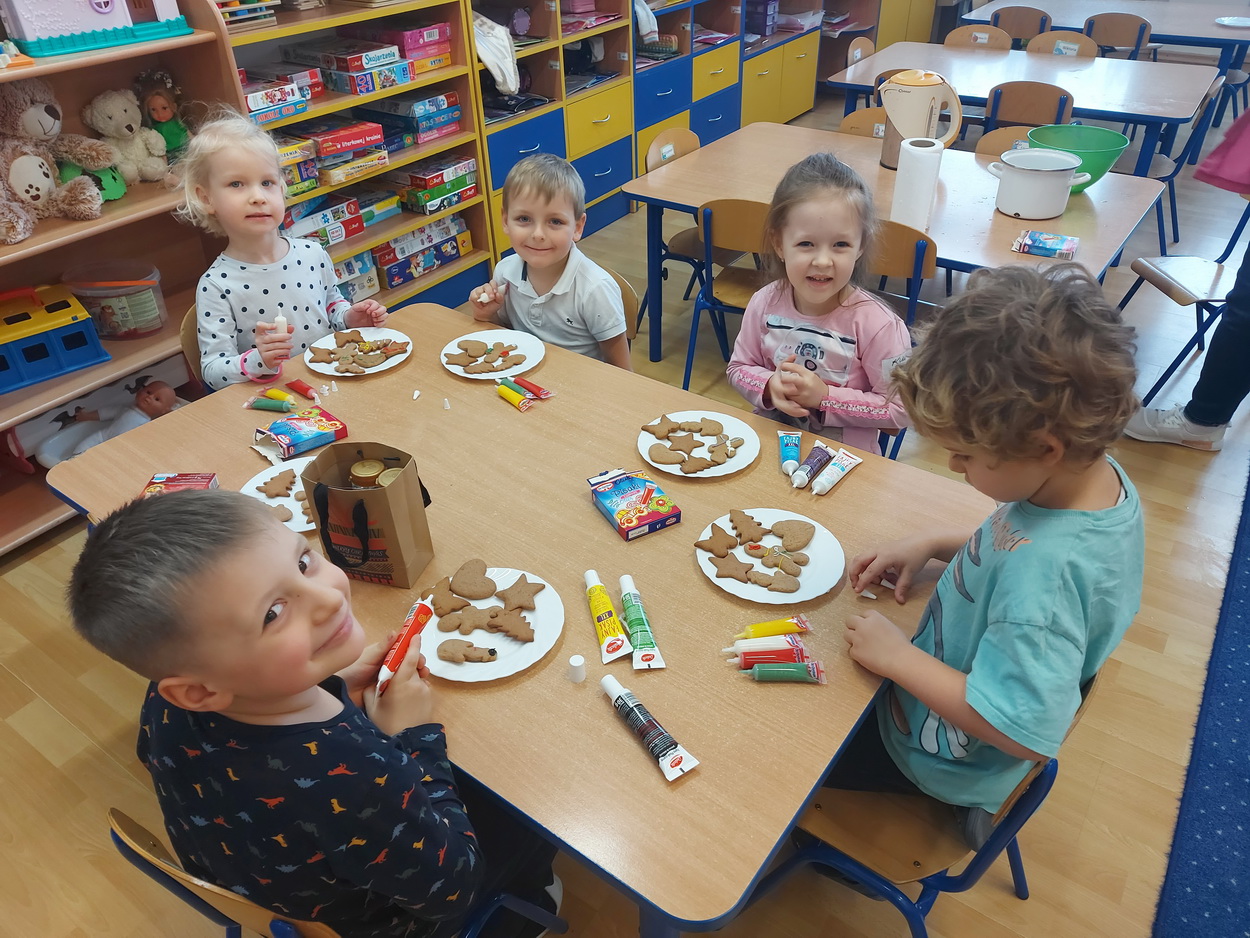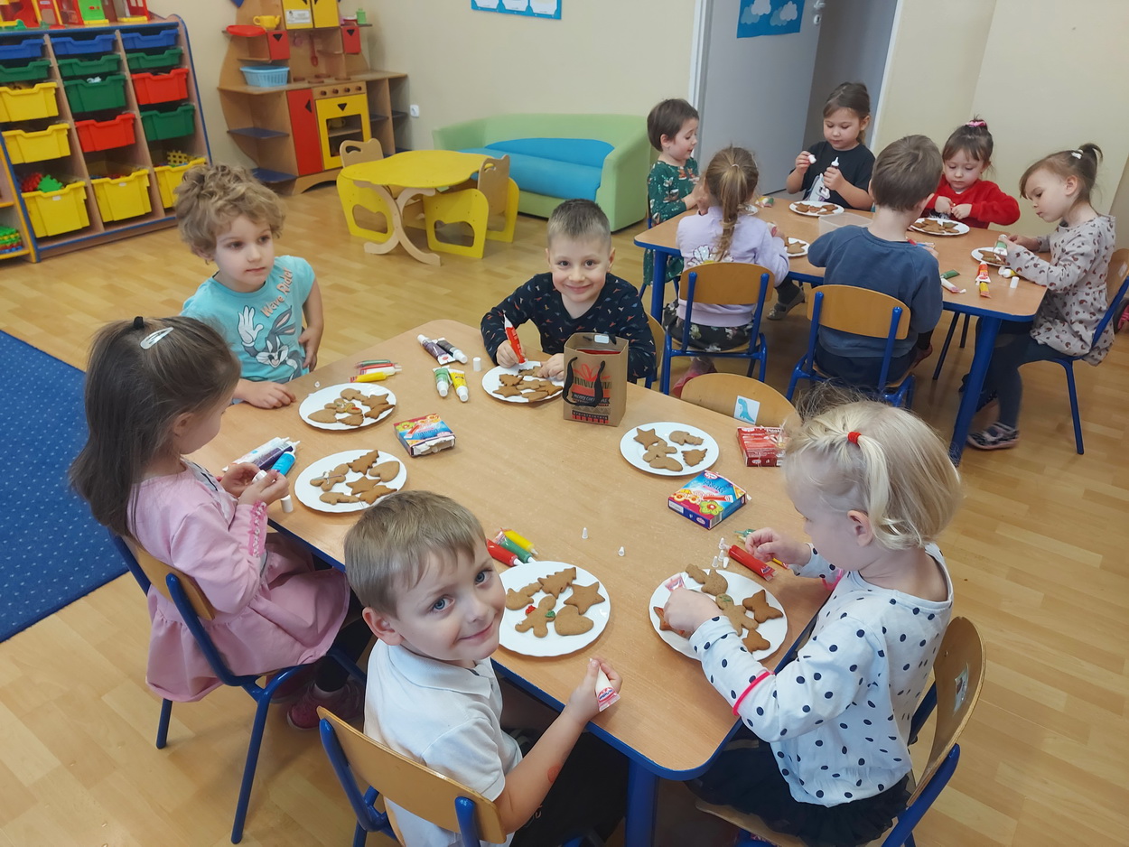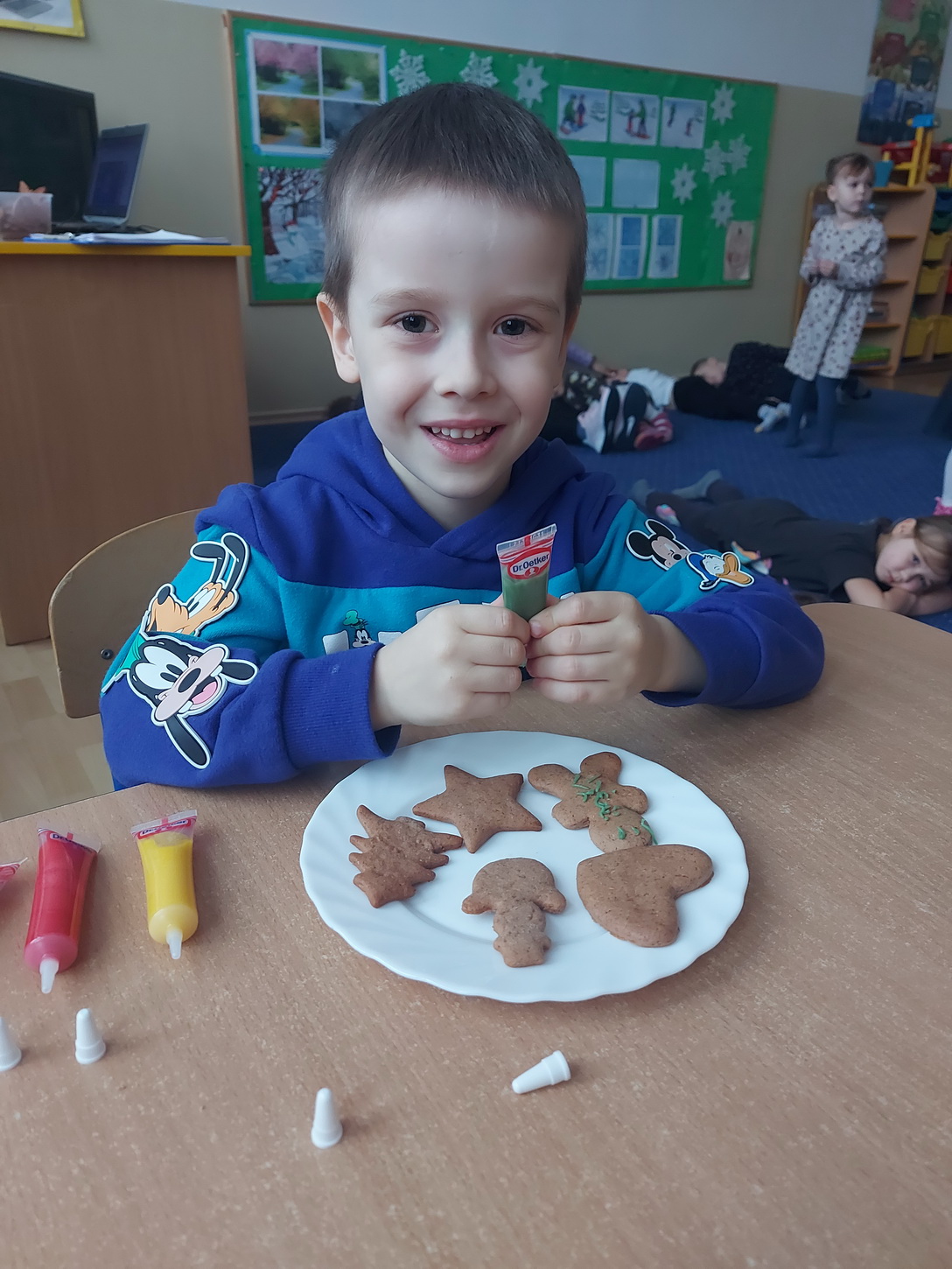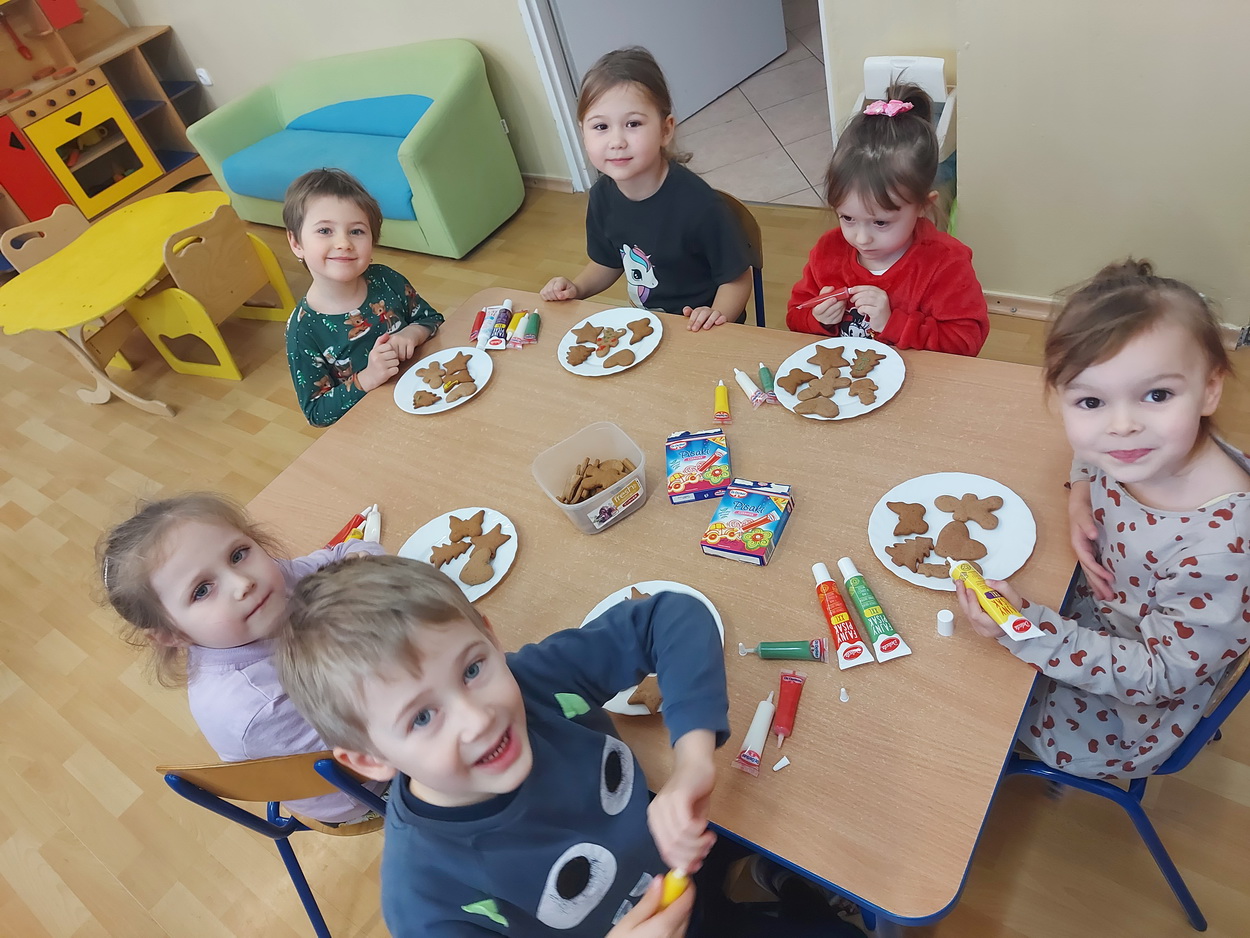 W ramach innowacji pedagogicznej “Sensoryczna przygoda”, dzieci z grup II i III uczestniczyły w zajęciach kulinarnych. Żabki postanowiły upiec małe słodkości, które później miały możliwość spróbować podczas podwieczorku. Poznawały i nazywały składniki, mieszały i formowały „cynamonowe ludki”. Słoneczka natomiast wykazały się kreatywnością podczas ozdabiania pysznych pierniczków. Efektem końcowym były pięknie polukrowane bałwanki, choinki, ludziki i gwiazdeczki. Zabawy było co niemiara. Połączenie zabaw manualnych z nauką to ewidentnie dobre zestawienie.