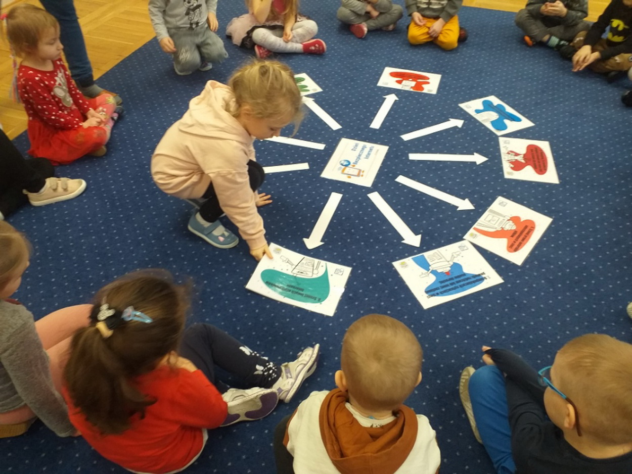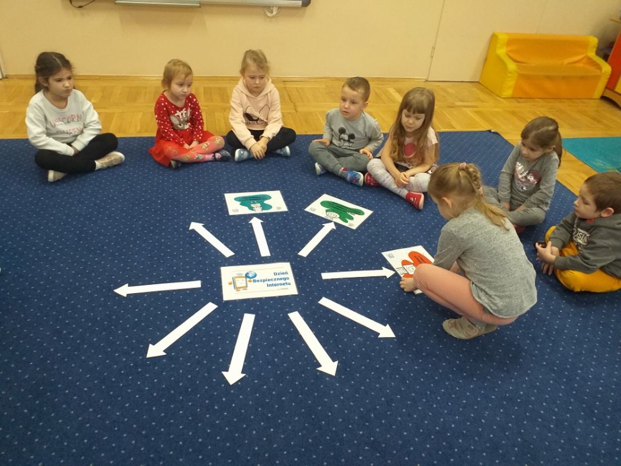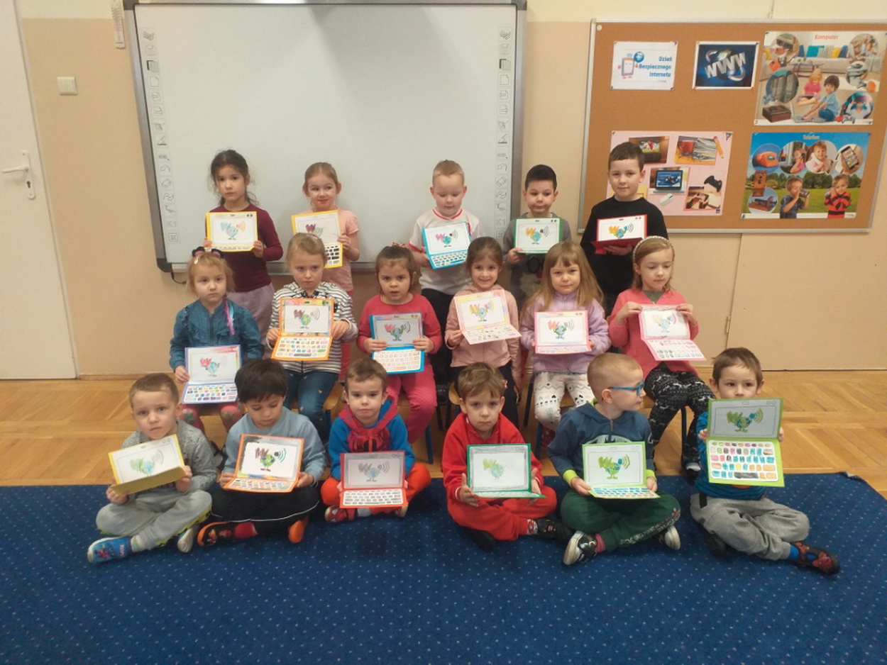 7 lutego starsze grupy przedszkolne obchodziły Dzień Bezpiecznego Internetu. Przedszkolaki zostały zapoznane z podstawowymi zasadami bezpiecznego korzystania z zasobów internetowych. Dzieci doskonale poradziły sobie z quizem dotyczącym Internetu, jego walorów i zagrożeń. Podsumowaniem ustalonych zasad było wykonanie plakatu “Bezpieczny w sieci!”. Wychowankowie na macie do kodowania ułożyli symbol sieci wi-fi, a także stworzyli “własną sieć”, dzięki której mogli wysłać wiadomość do swojego kolegi. Niesamowitą atrakcją, wprowadzającą do świata technologii, było również samodzielne wykonanie laptopów, które ułatwiają komunikację na odległość.