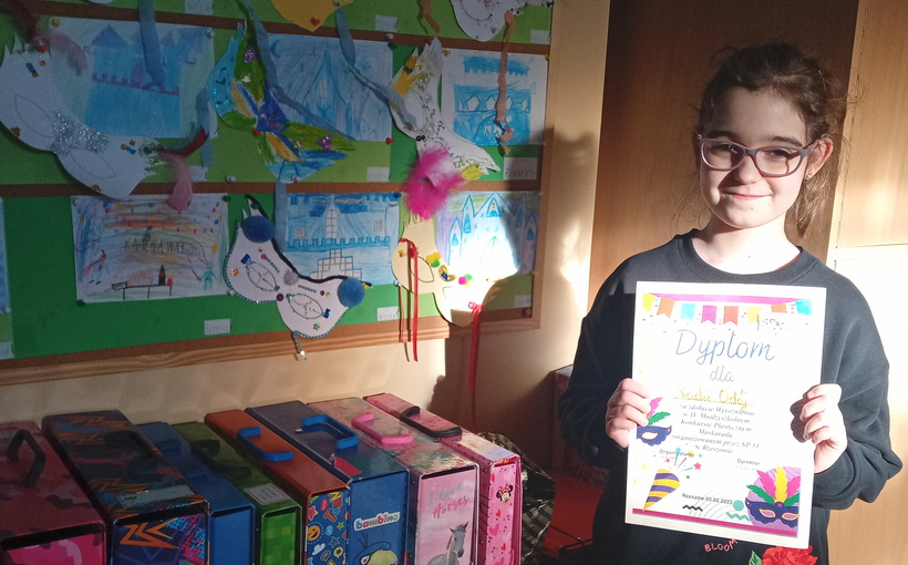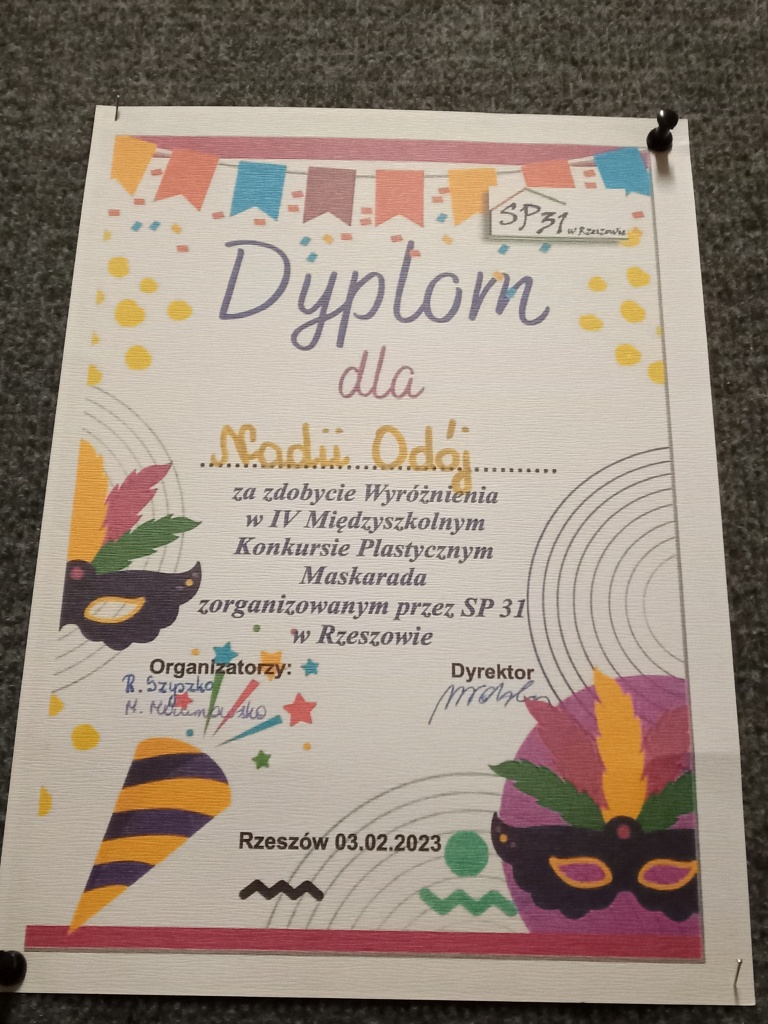 IV Międzyszkolny Konkurs Plastyczny „Maskarada” został rozstrzygnięty. Jury, podczas oceny prac konkursowych, brało pod uwagę: stopień trudności wykonania pracy, samodzielność, oryginalność i różnorodność użytych materiałów. Wśród wyróżnionych uczniów znalazła się również uczennica naszej szkoły z klasy 2a, Nadia Odój. Nadii serdecznie gratulujemy sukcesu i czekamy z niecierpliwością na kolejne!