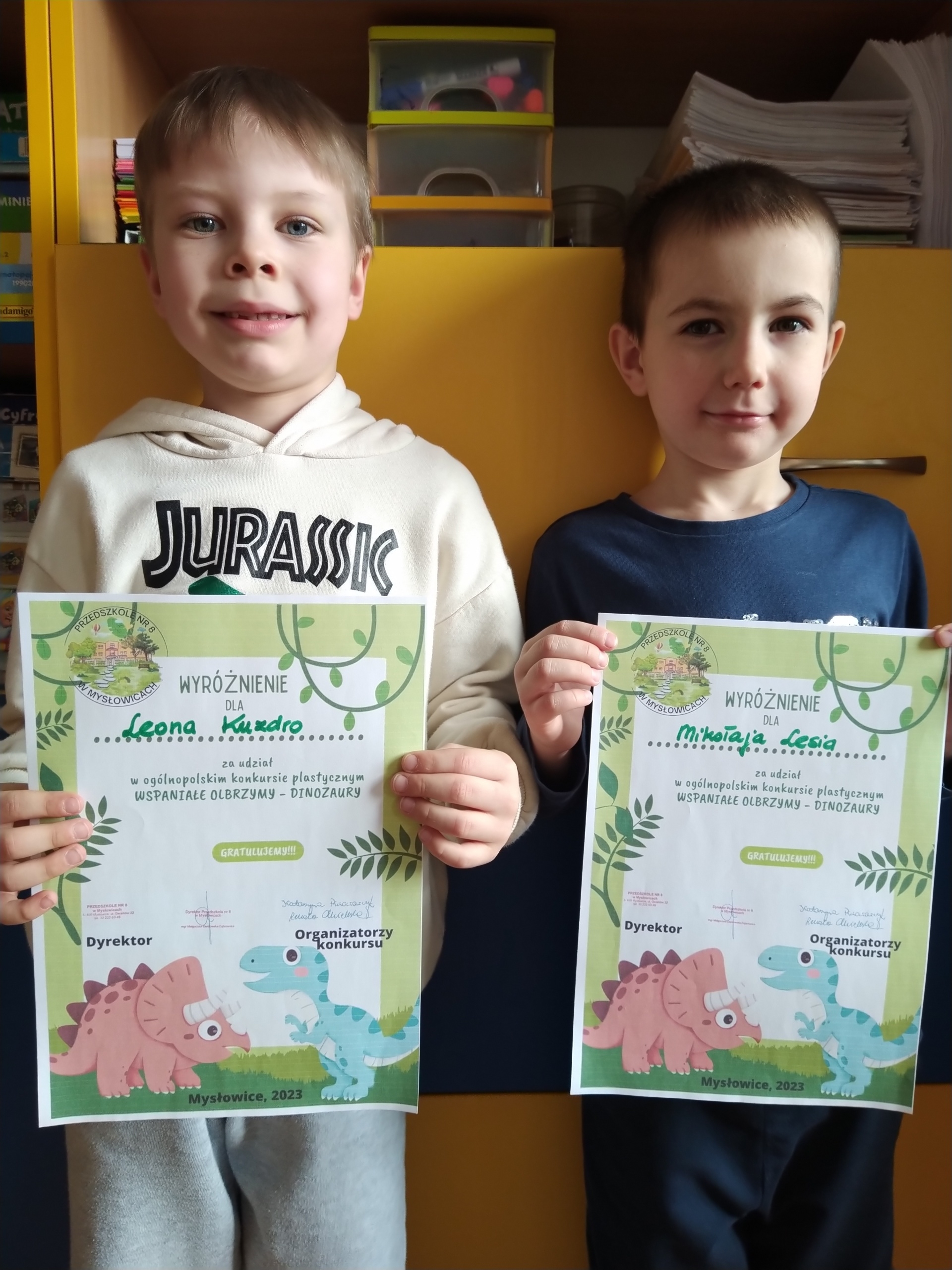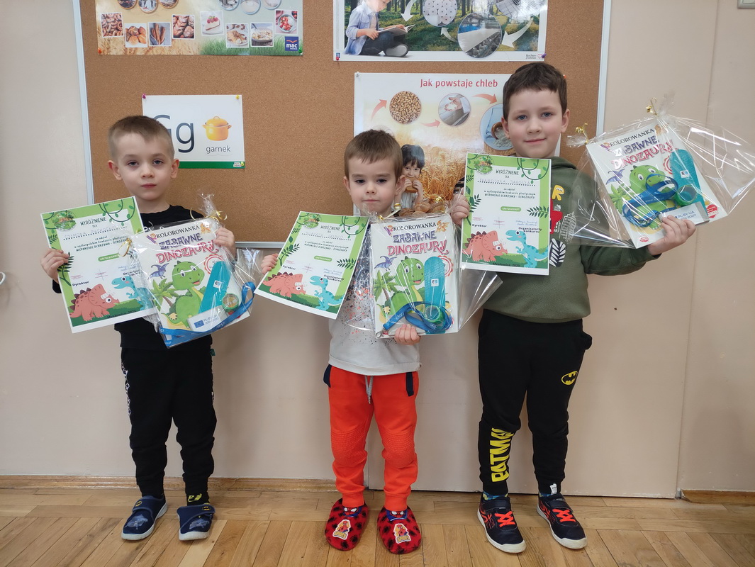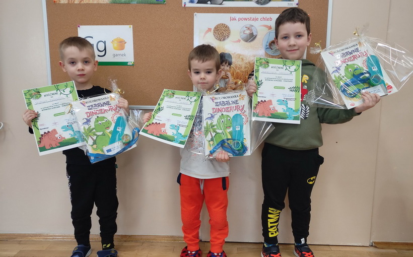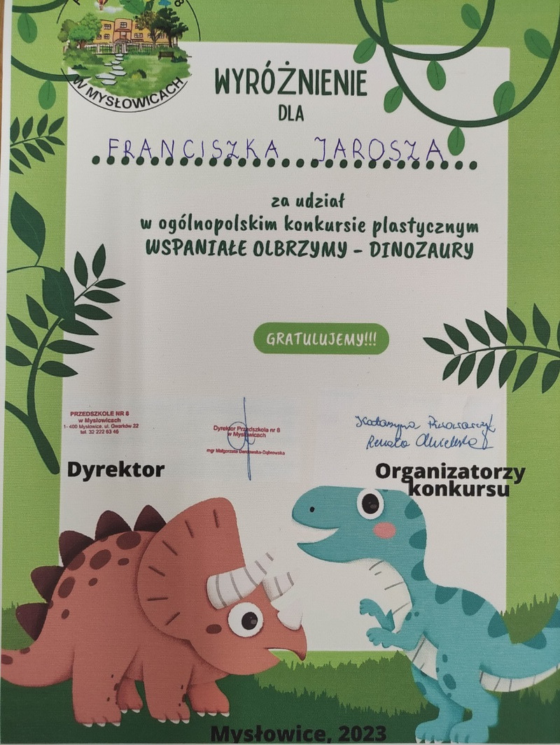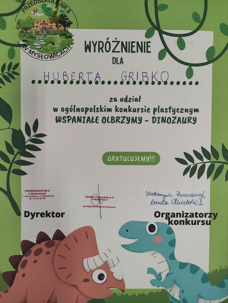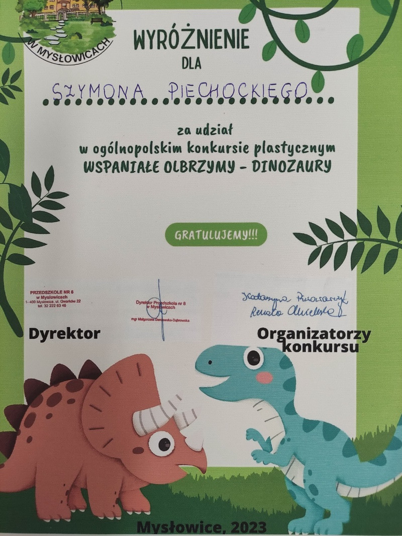 Przedszkole nr 8 w Mysłowicach było organizatorem ogólnopolskiego konkursu plastycznego „Wspaniałe olbrzymy – Dinozaury!”. Celem konkursu było budzenie zainteresowania światem dinozaurów, rozwijanie inwencji twórczej poprzez poszukiwanie różnorodnych technik plastycznych oraz rozwijanie kreatywności. Biorąc pod uwagę samodzielność, pomysłowość, a także technikę wykonania komisja konkursowa wyłoniła zwycięzców. Miło nam poinformować, że osoby wyróżnione to: Franciszek Jarosz, Hubert GribkoSzymon Piechocki z gr. Biedronki oraz Leon KuzdroMikołaj Leś z gr. Smerfy. Serdecznie gratulujemy chłopcom i życzymy kolejnych plastycznych sukcesów.