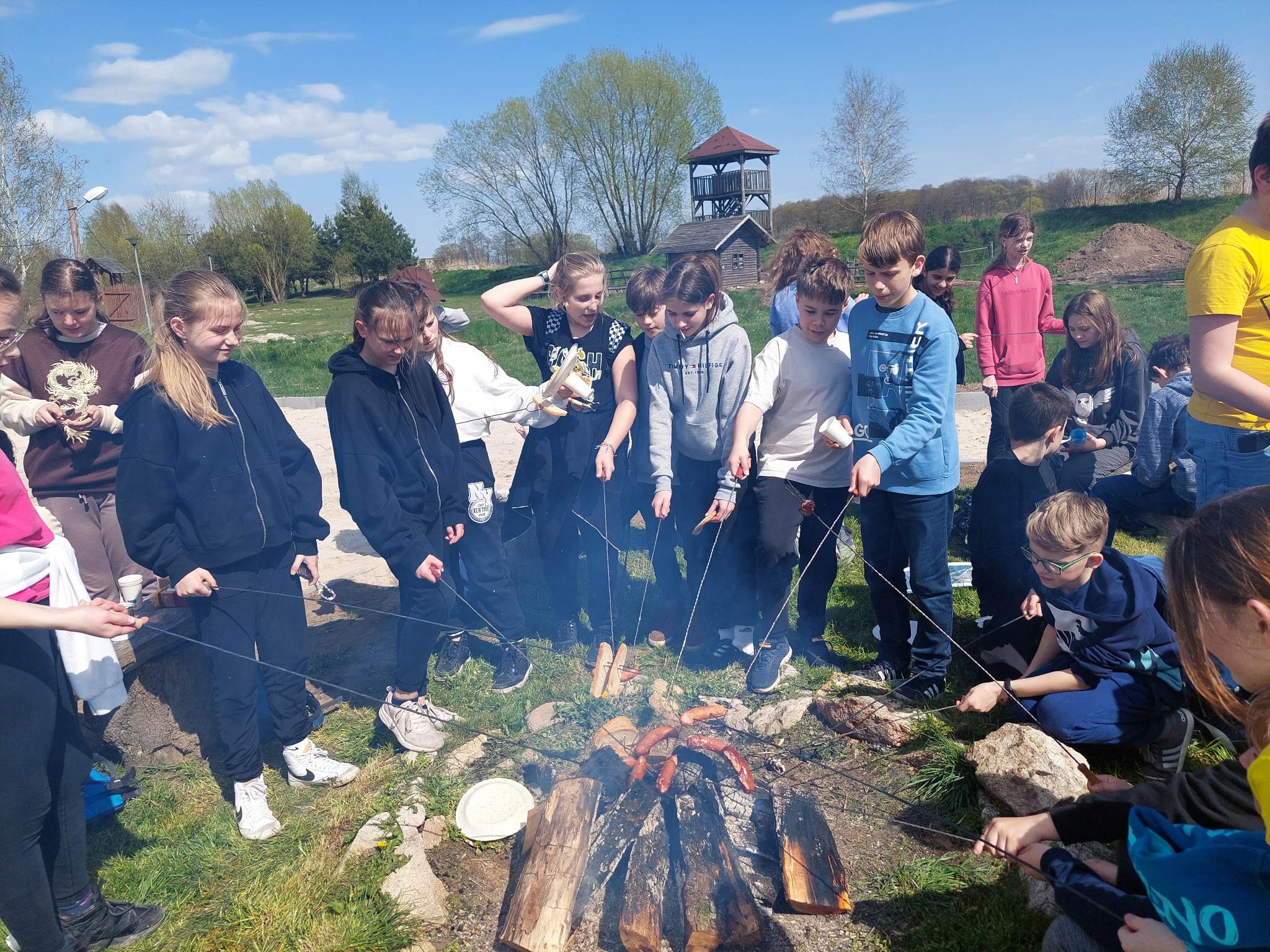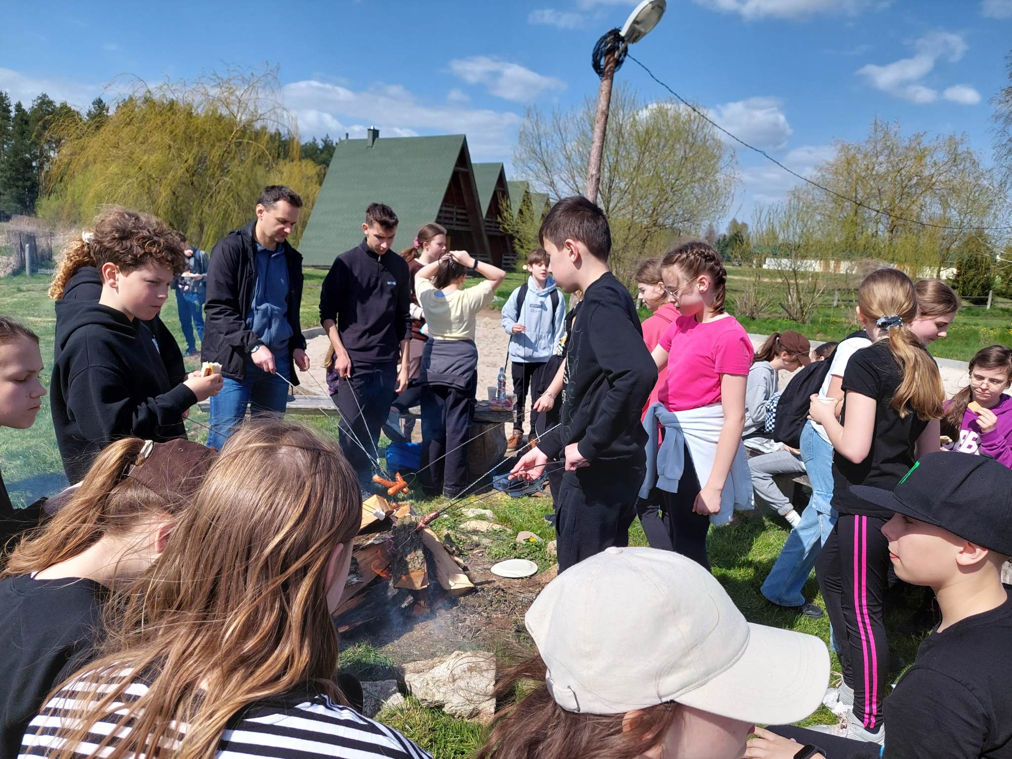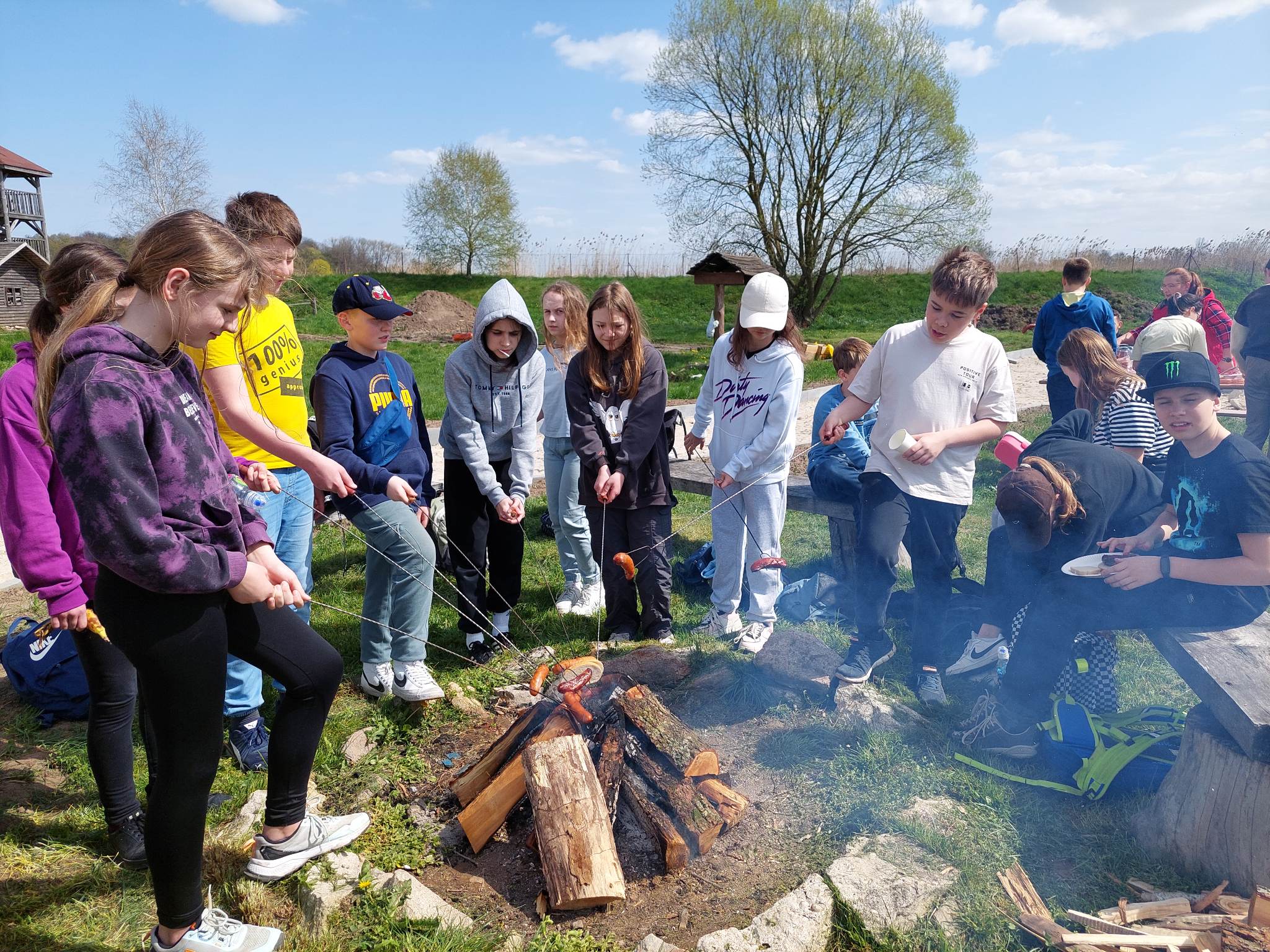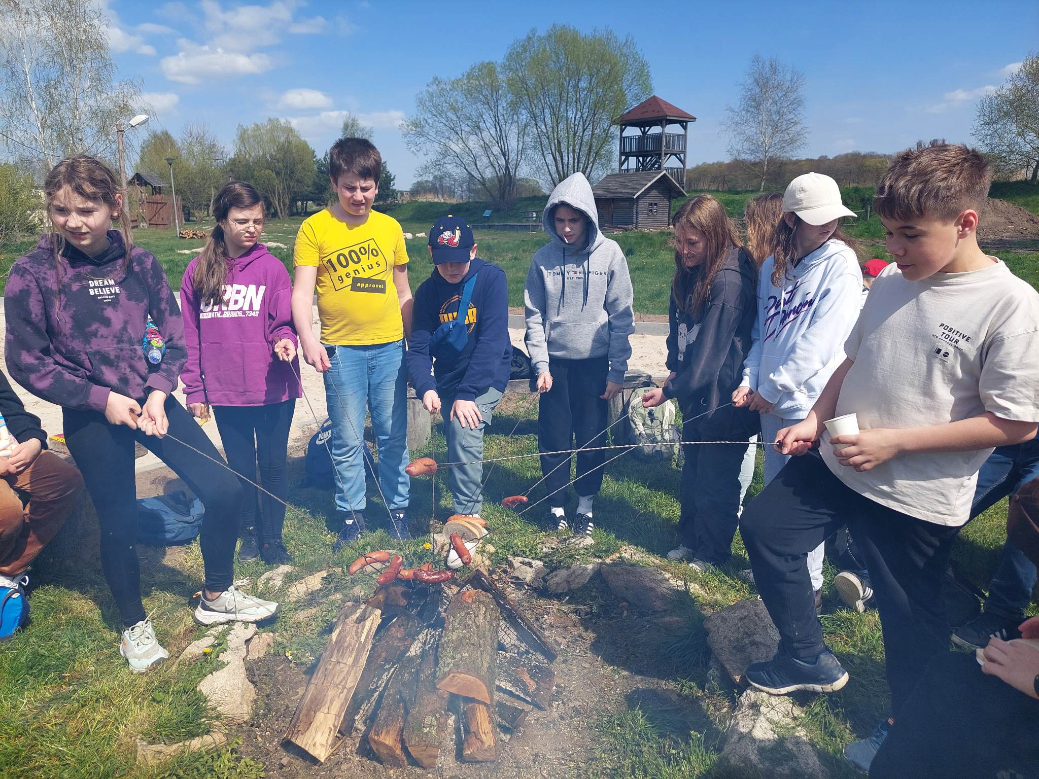 Pierwszym punktem wycieczki był spacer po rezerwacie Szumy nad Tanwią, dowiedzieliśmy się wielu ciekawych rzeczy o walorach tego miejsca i obserwowaliśmy budzącą się do życia przyrodę. Później udaliśmy się do centrum Cieszanowa, gdzie animatorzy zorganizowali dla nas grę miejską, podczas której należało wykazać się prędkością, sprytem i bacznym obserwowaniem uliczek, wśród których się poruszaliśmy. Kiedy dotarliśmy do Teddy-Camp, czekało już na nas ognisko, na którym upiekliśmy pyszne kiełbaski. Po chwili przerwy rozpoczęliśmy grę “Kto ukradł misia”? Dzięki licznym zadaniom sprawnościowym zdobywaliśmy kolejne podpowiedzi prowadzące do rozwiązania zagadki. Okazało się, że miś został skradziony przez Ryszarda, ale ten zdążył już uciec z terenu ośrodka…