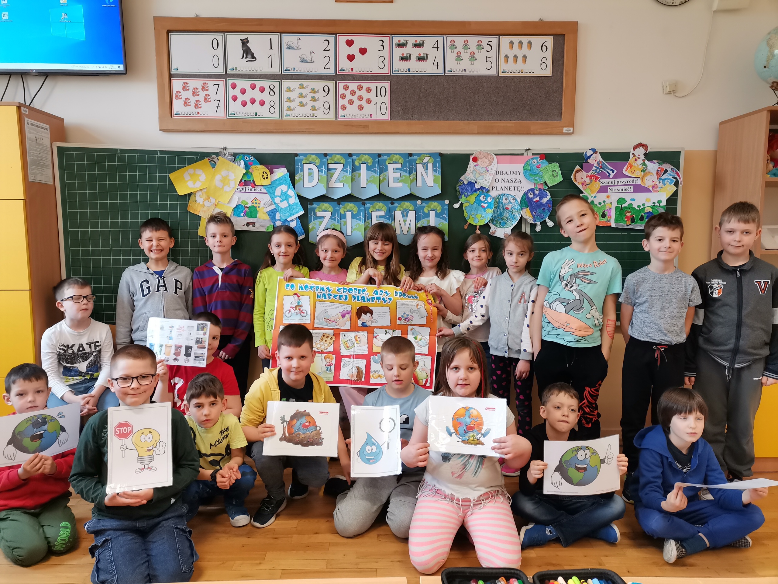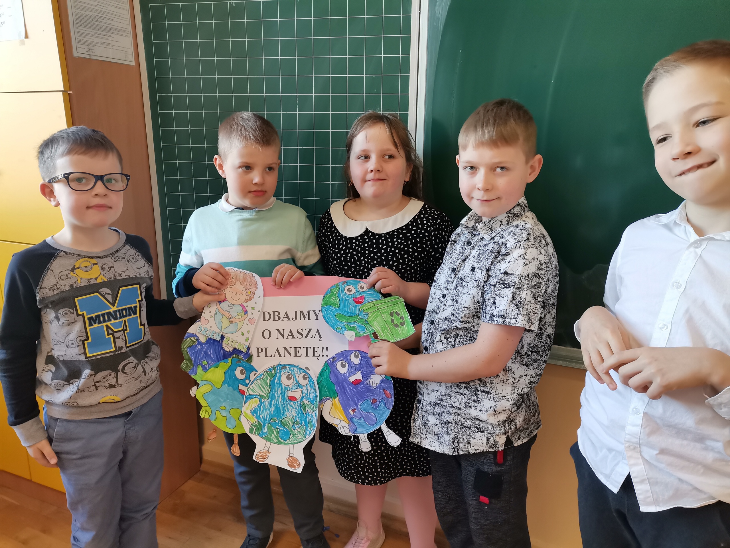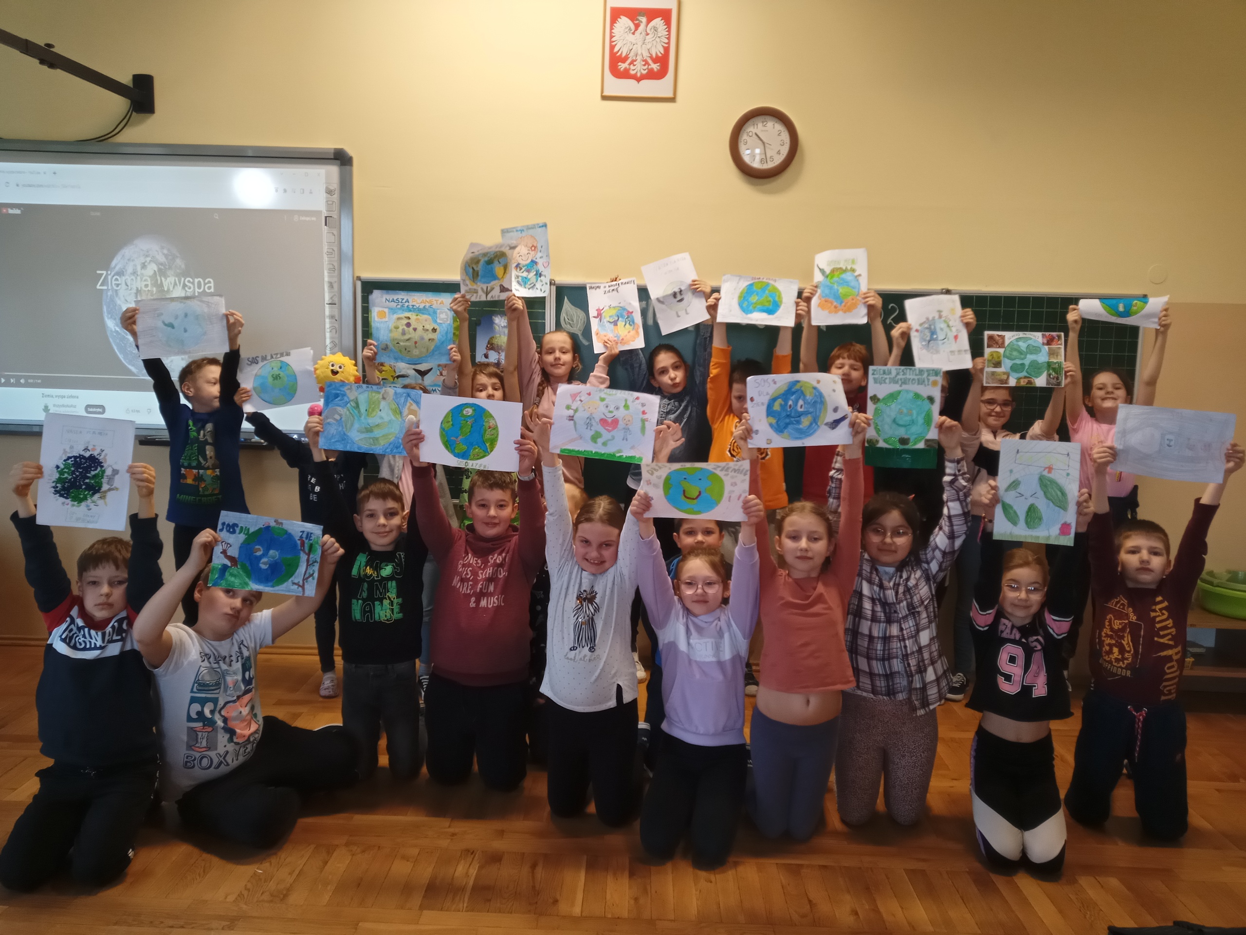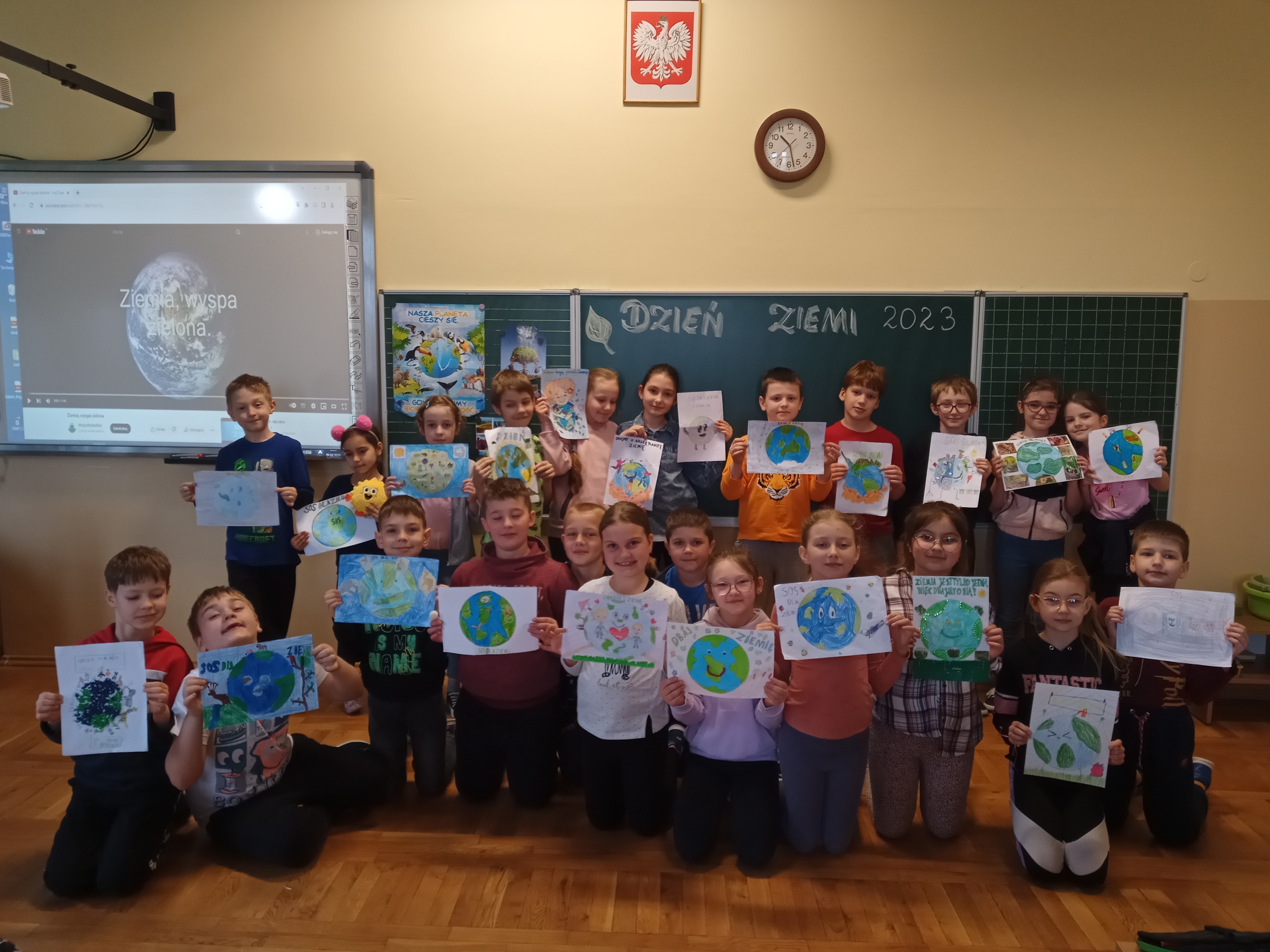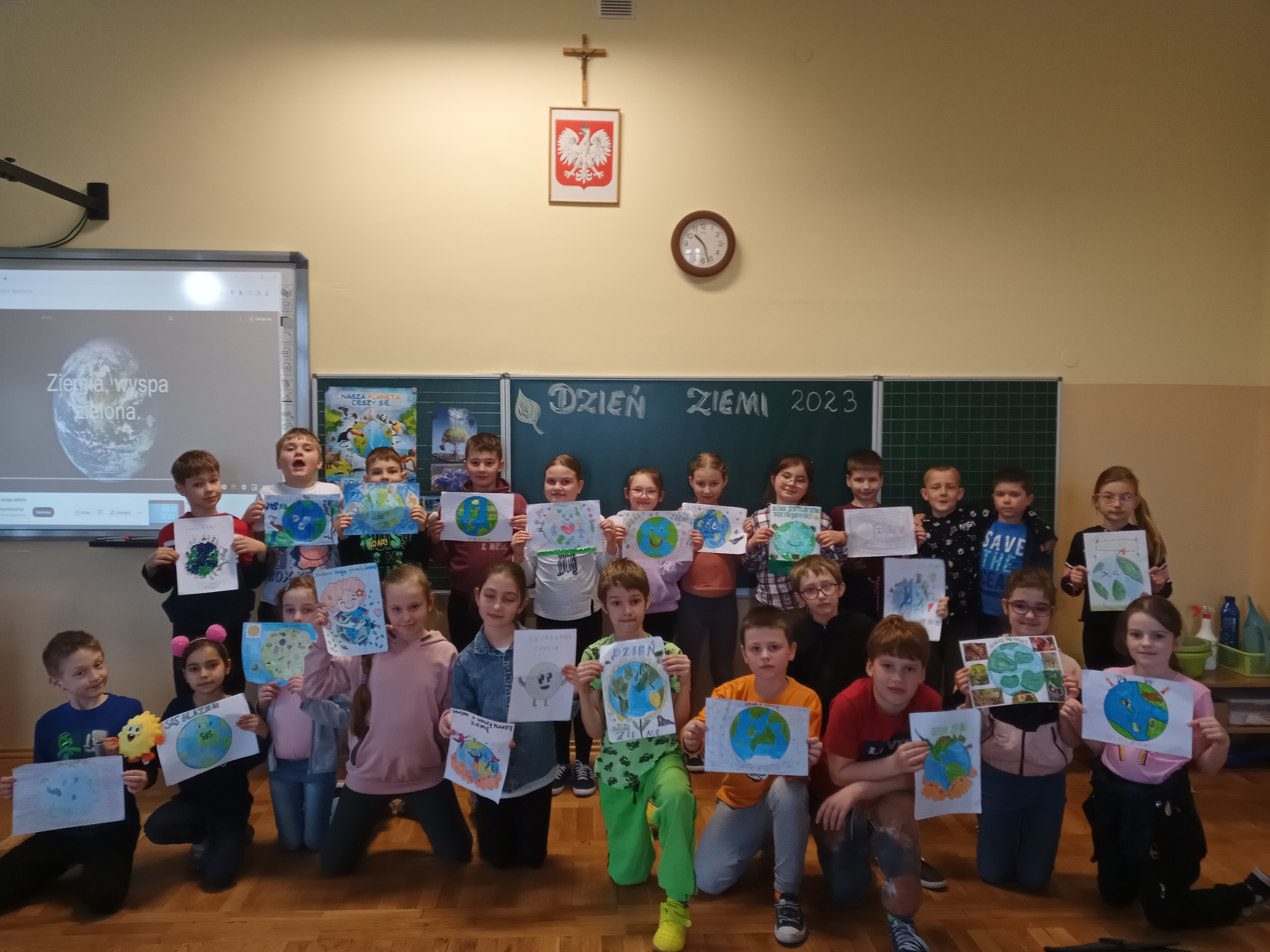 Uczniowie klas 1-3 bardzo aktywnie uczestniczyli w zajęciach poświęconych naszej planecie: rozwiązywali krzyżówki i zagadki ekologiczne, wykonali rysunki przestawiające Ziemię za tysiąc lat. Dzieci wykonały plakaty ,,SOS dla Ziemi” i obejrzały prezentację pt.: ,,Ziemia – nasz dom”, podczas której dowiedziały się, jakie nasza planeta ma dla nas przepiękne dary oraz co ją zatruwa i niszczy.