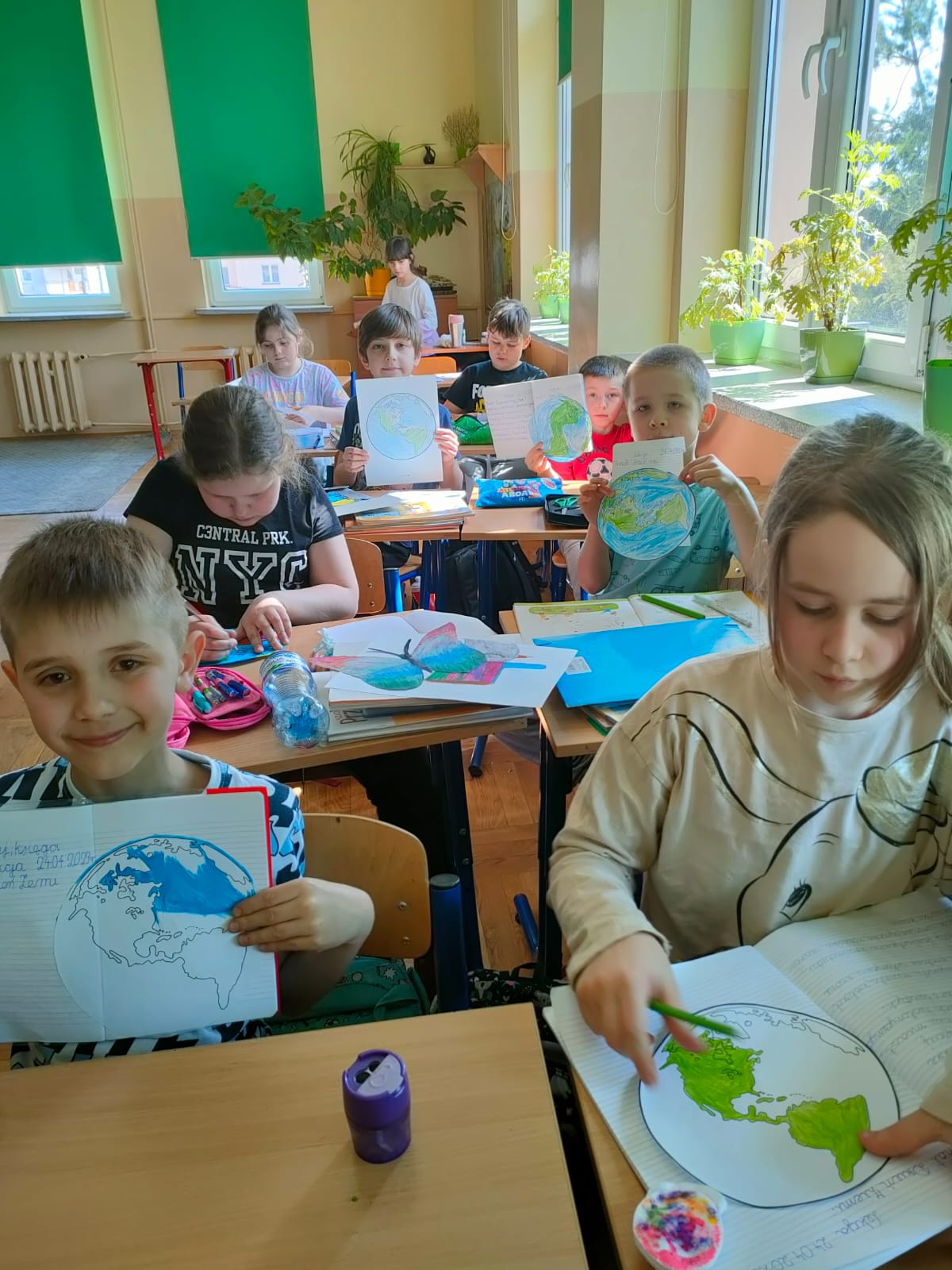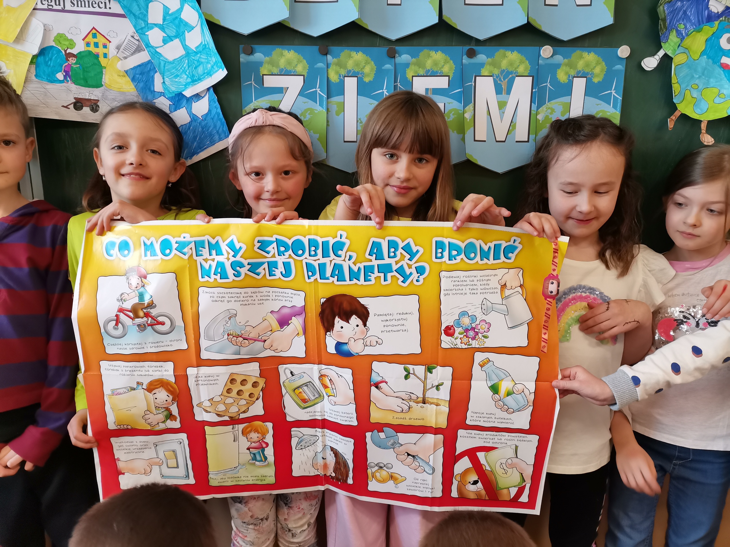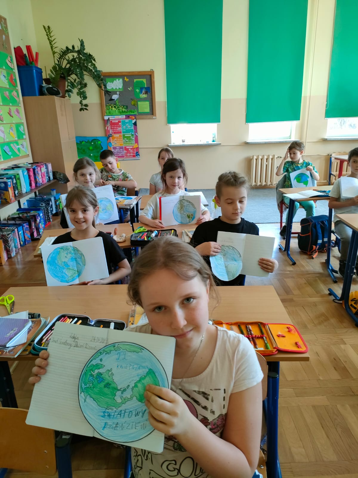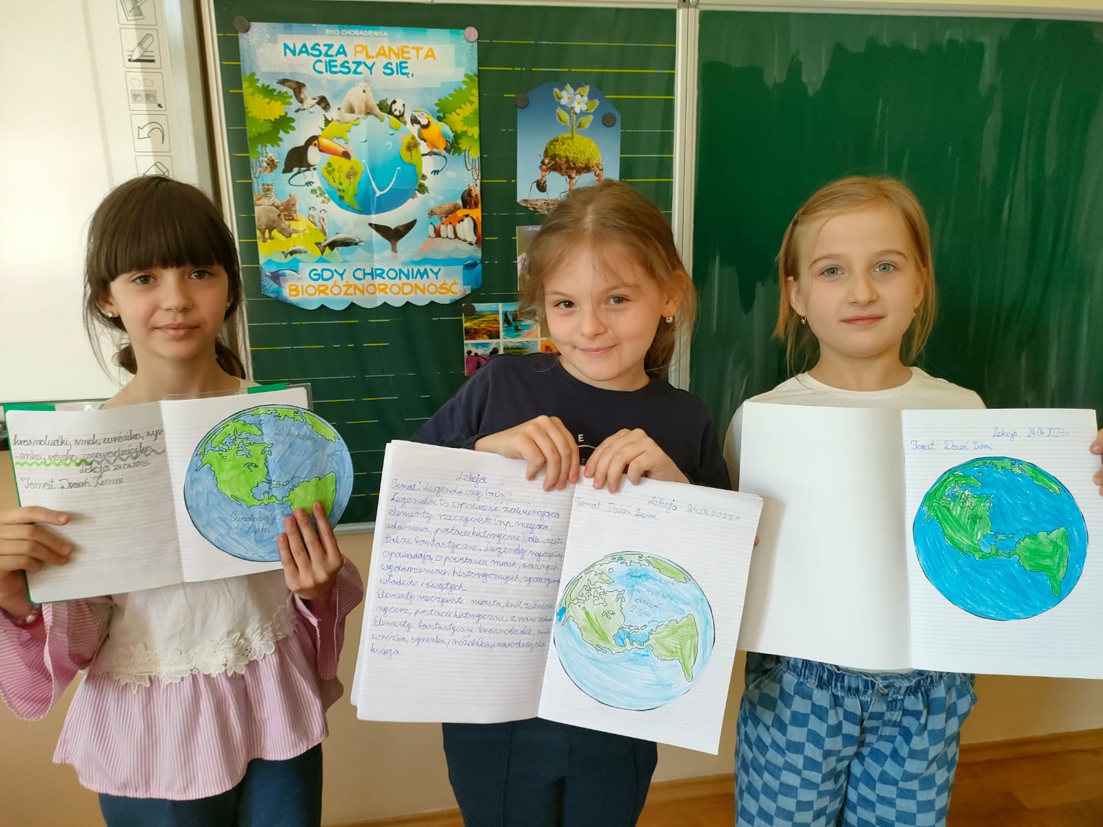 Uczniowie klas 1-3 bardzo aktywnie uczestniczyli w zajęciach poświęconych naszej planecie: rozwiązywali krzyżówki i zagadki ekologiczne, wykonali rysunki przestawiające Ziemię za tysiąc lat. Dzieci wykonały plakaty ,,SOS dla Ziemi” i obejrzały prezentację pt.: ,,Ziemia – nasz dom”, podczas której dowiedziały się, jakie nasza planeta ma dla nas przepiękne dary oraz co ją zatruwa i niszczy.