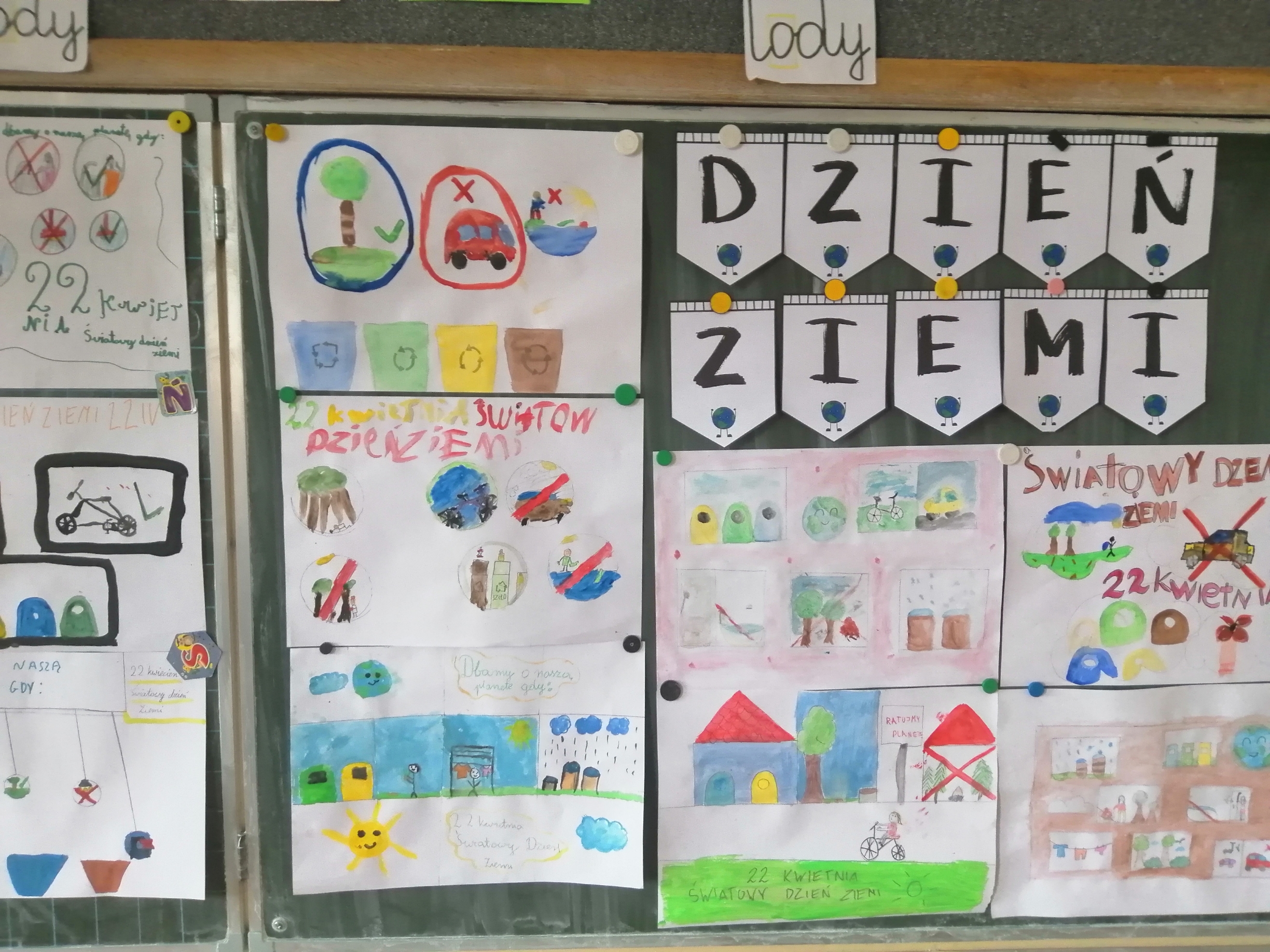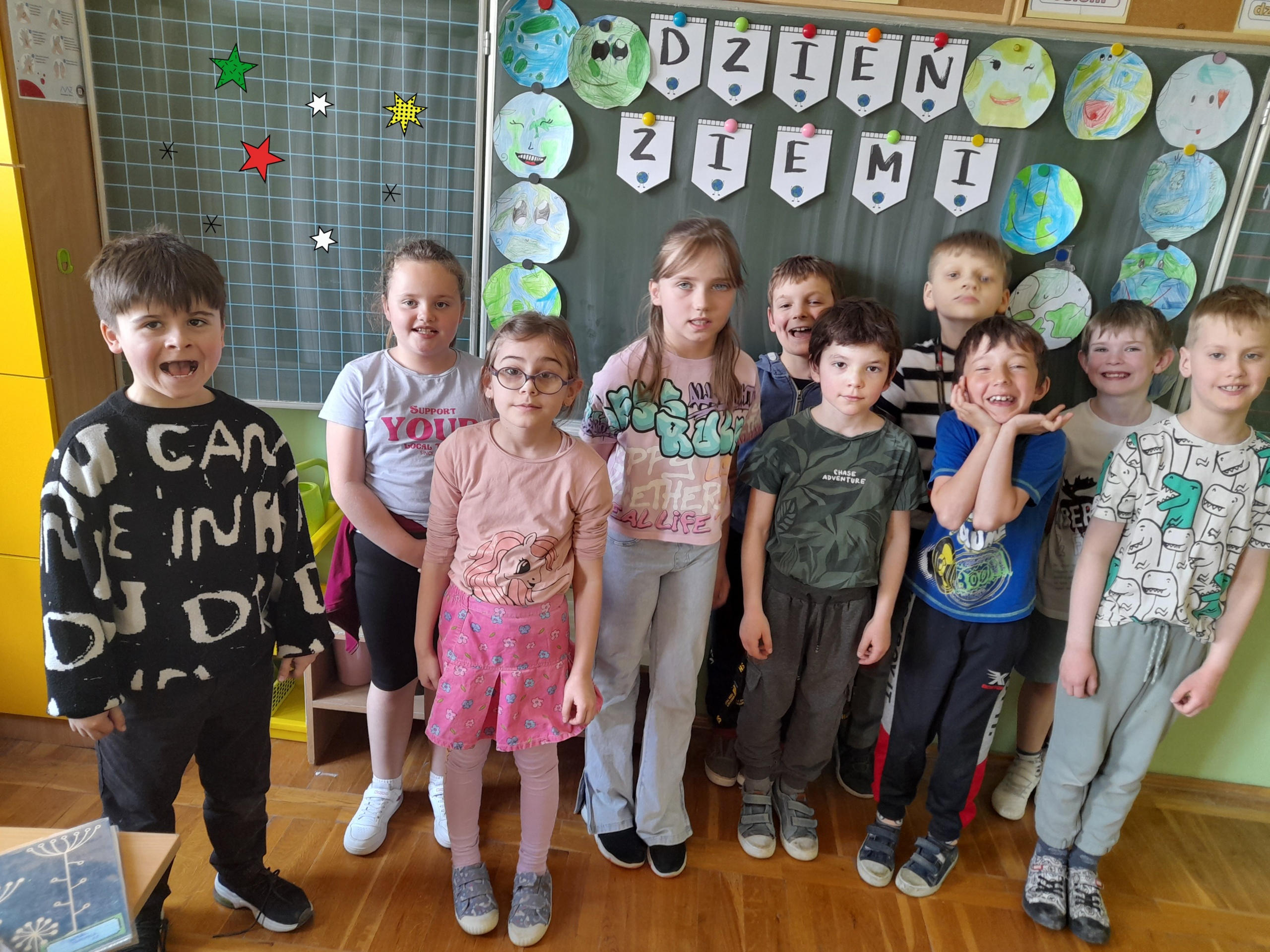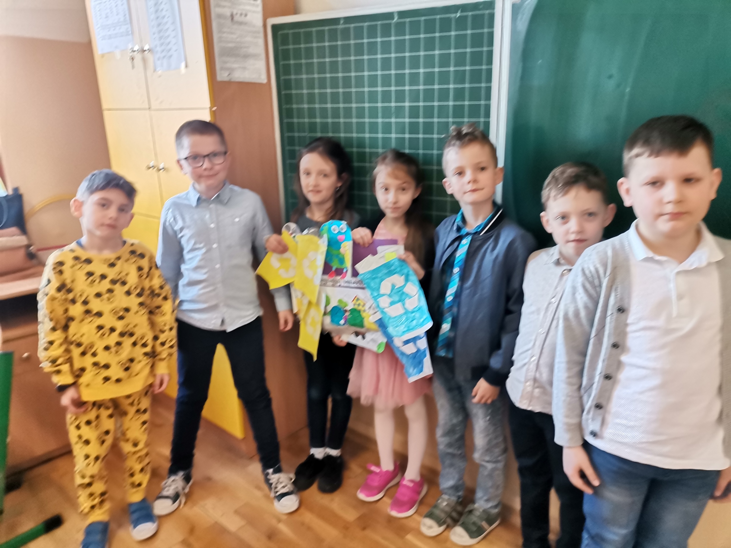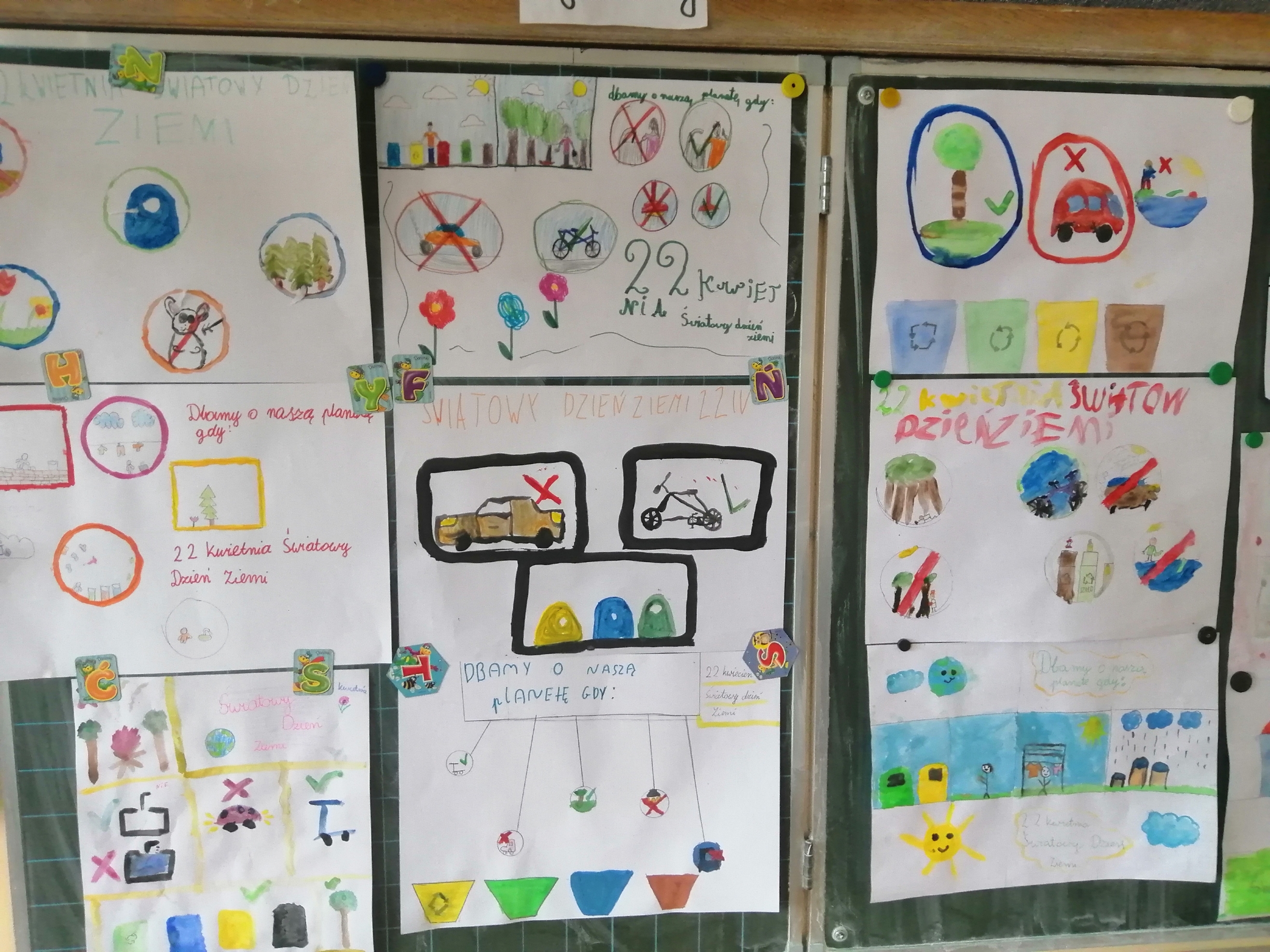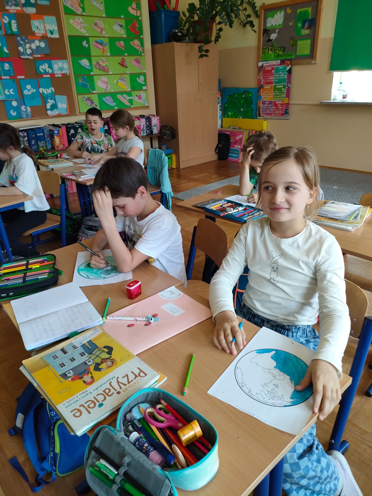 Uczniowie klas 1-3 bardzo aktywnie uczestniczyli w zajęciach poświęconych naszej planecie: rozwiązywali krzyżówki i zagadki ekologiczne, wykonali rysunki przestawiające Ziemię za tysiąc lat. Dzieci wykonały plakaty ,,SOS dla Ziemi” i obejrzały prezentację pt.: ,,Ziemia – nasz dom”, podczas której dowiedziały się, jakie nasza planeta ma dla nas przepiękne dary oraz co ją zatruwa i niszczy.