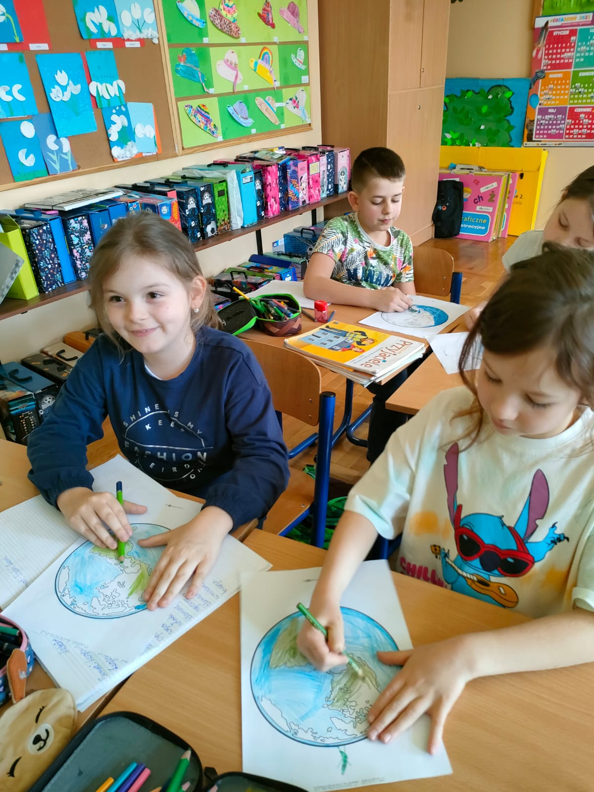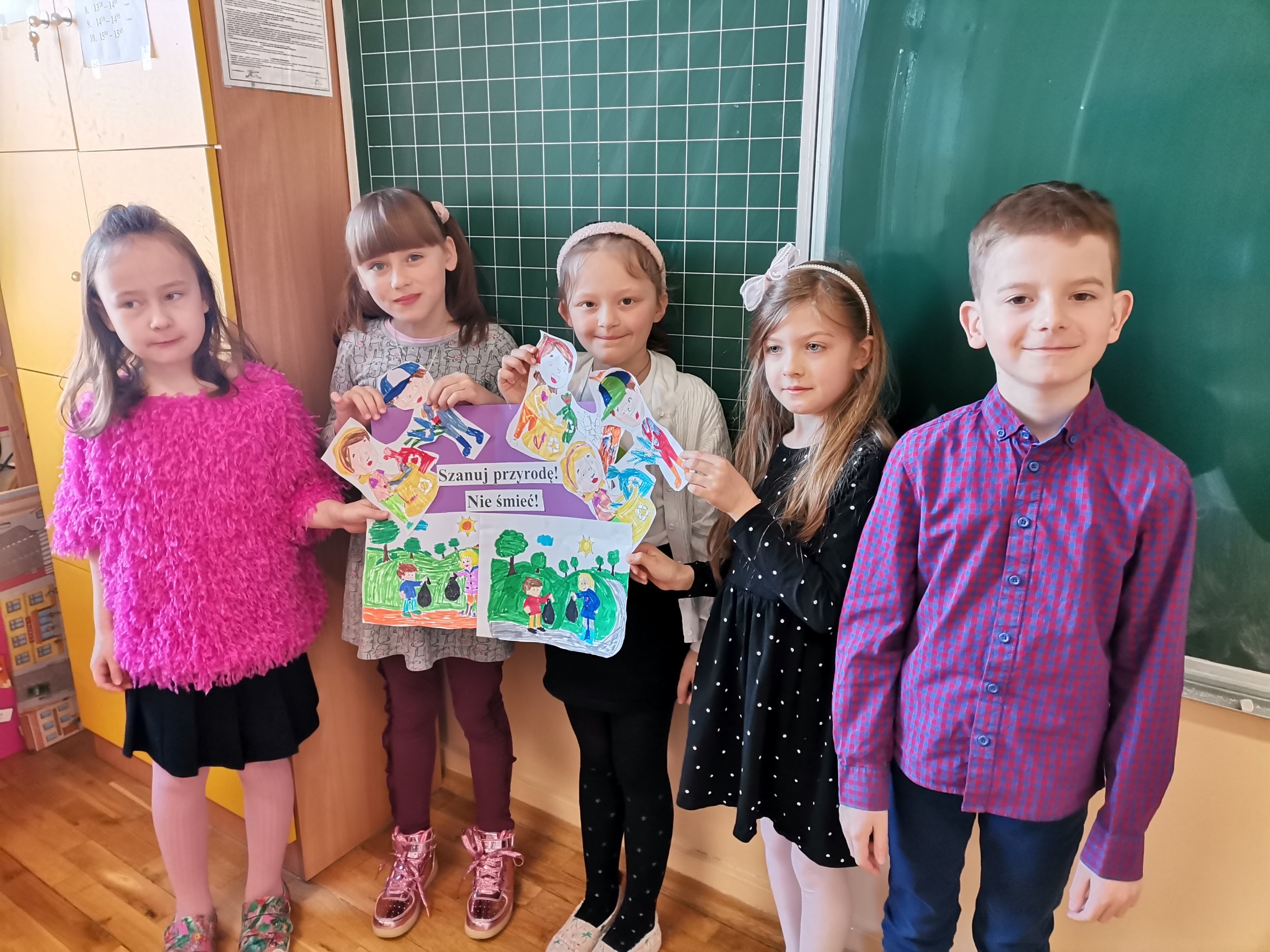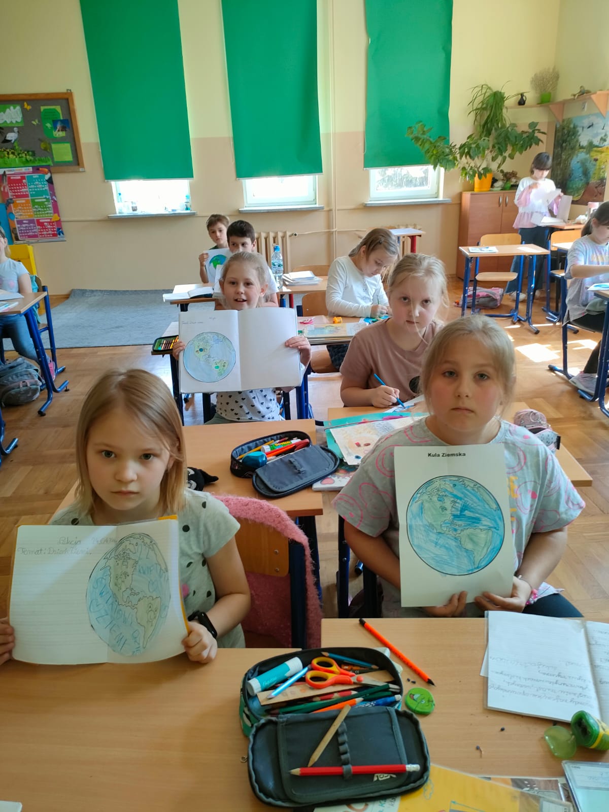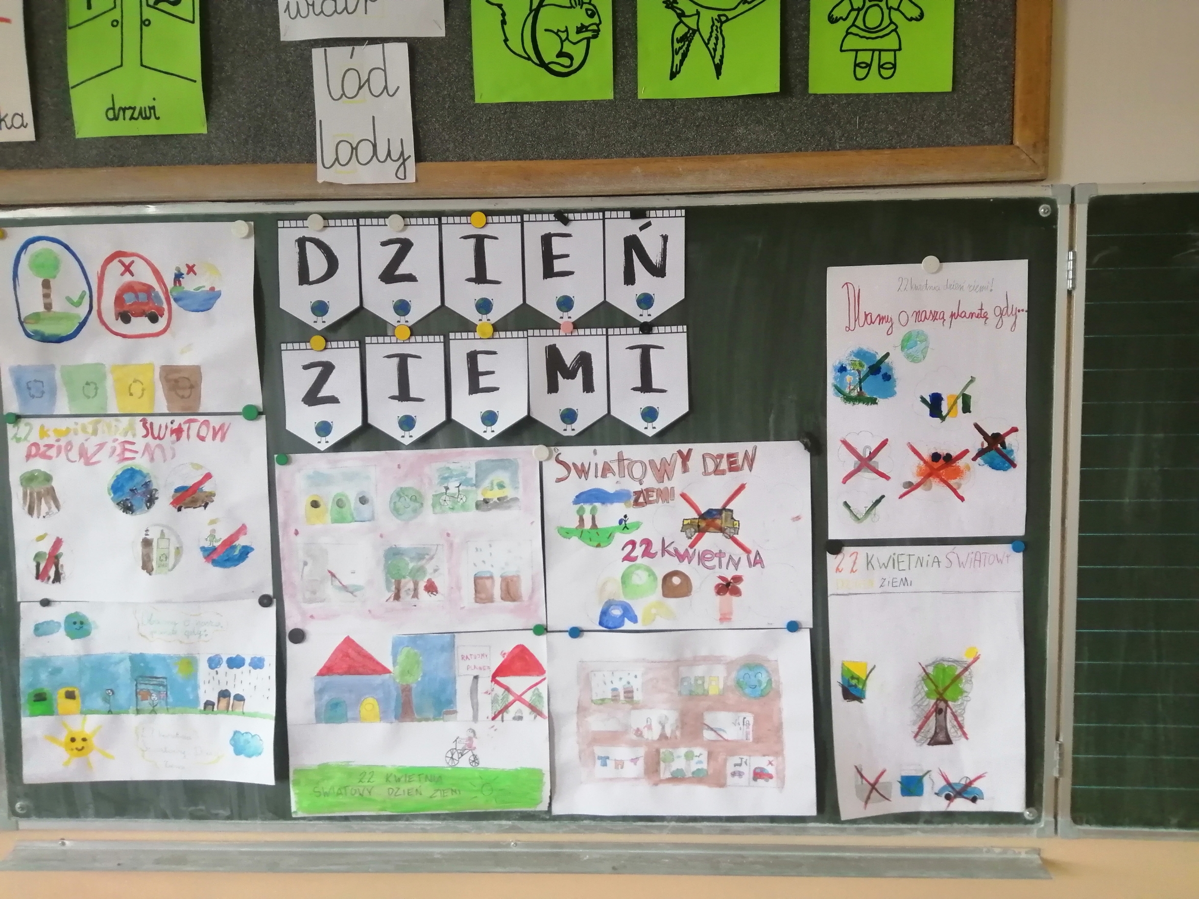 Uczniowie klas 1-3 bardzo aktywnie uczestniczyli w zajęciach poświęconych naszej planecie: rozwiązywali krzyżówki i zagadki ekologiczne, wykonali rysunki przestawiające Ziemię za tysiąc lat. Dzieci wykonały plakaty ,,SOS dla Ziemi” i obejrzały prezentację pt.: ,,Ziemia – nasz dom”, podczas której dowiedziały się, jakie nasza planeta ma dla nas przepiękne dary oraz co ją zatruwa i niszczy.