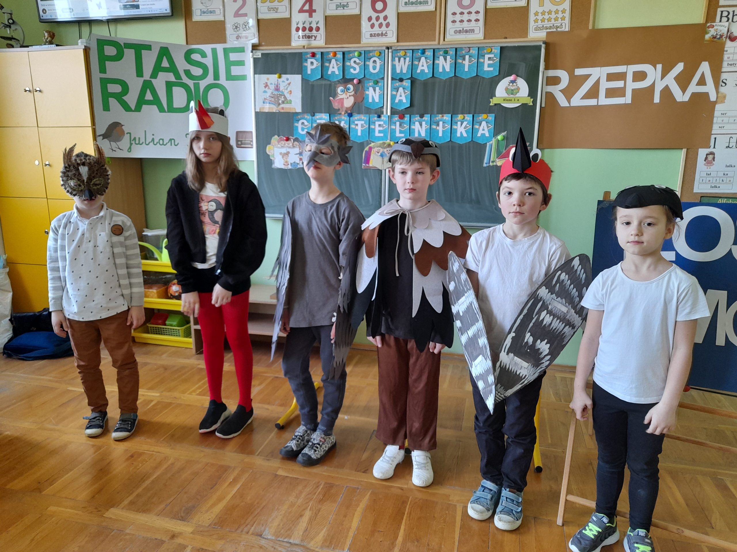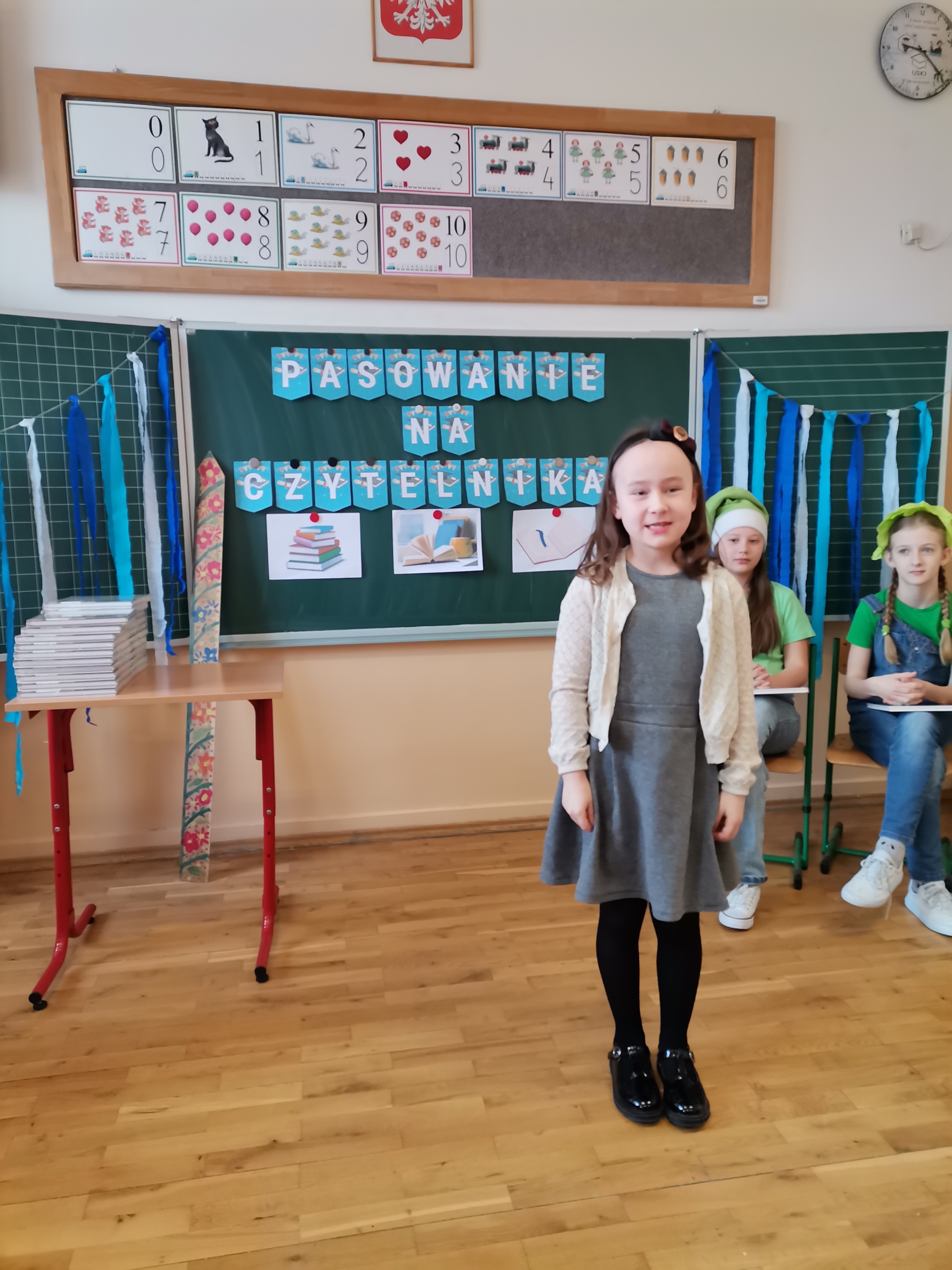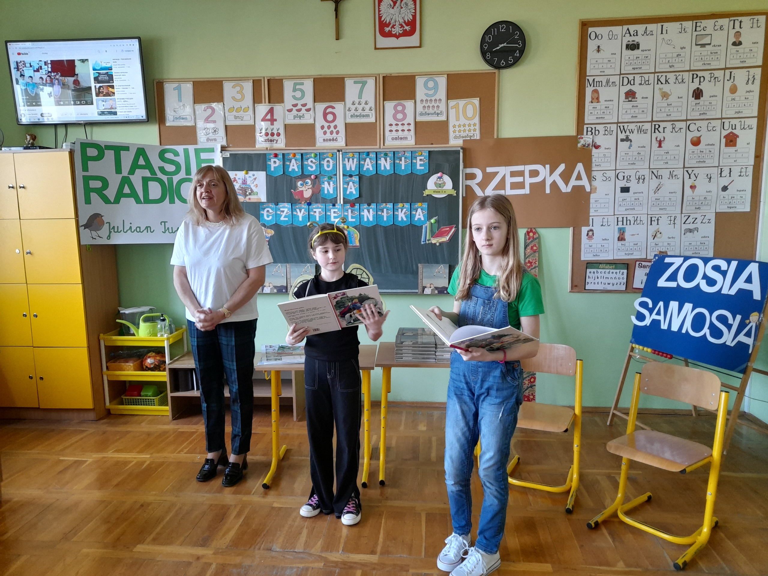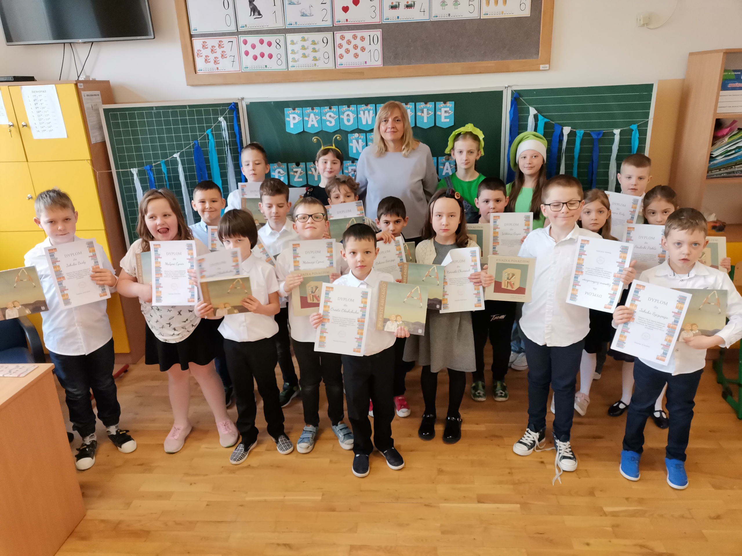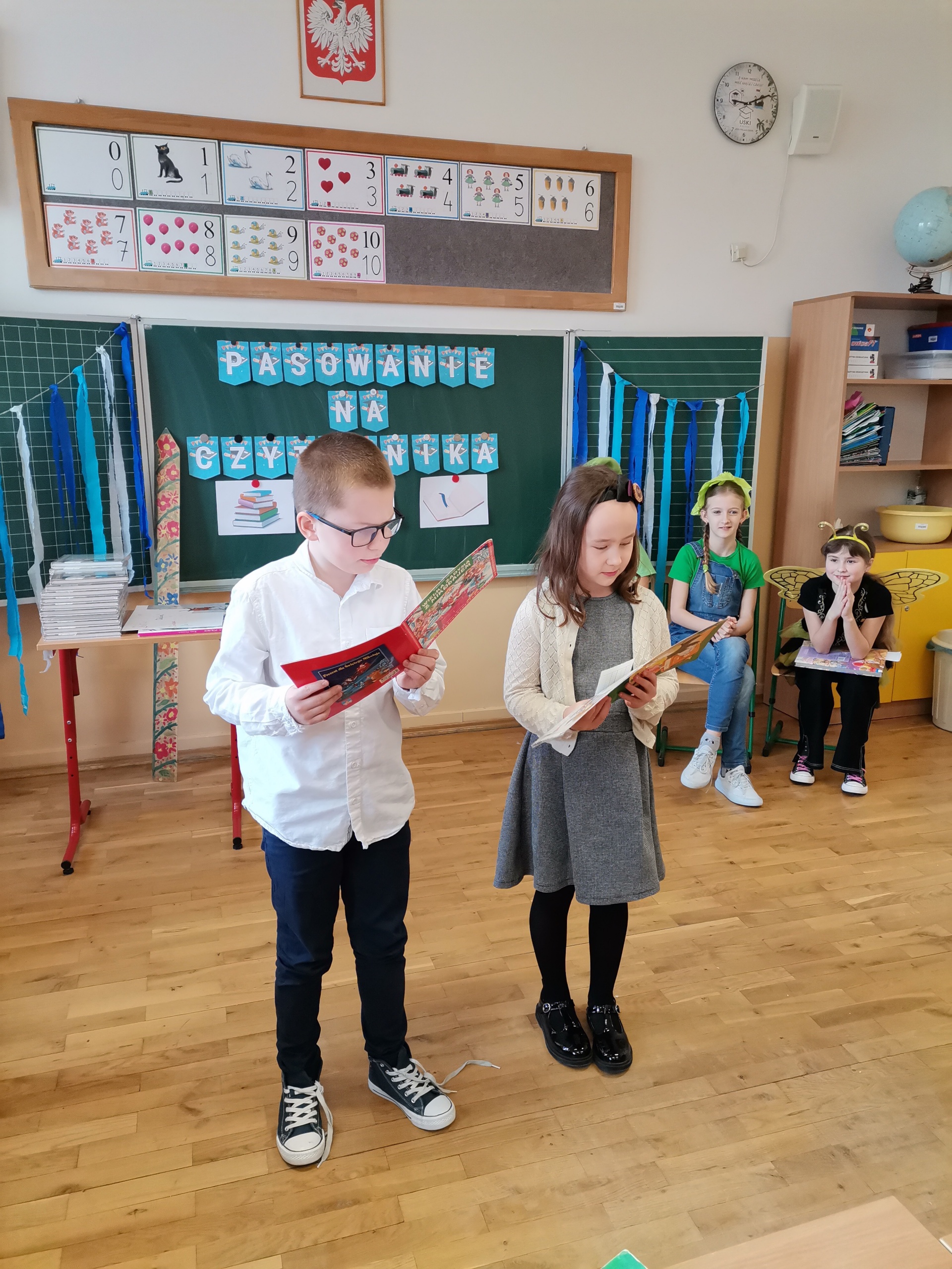 Najmłodsi uczniowie naszej placówki zostali uroczyście przyjęci w poczet czytelników biblioteki szkolnej. Uczniowie podczas uroczystości recytowali wiersze Juliana Tuwima: „Ptasie radio”, „Zosia Samosia”, „Rzepka” oraz z powodzeniem rozwiązywali zagadki związane ze znajomością dziecięcej literatury. Pierwszoklasiści złożyli uroczyste przyrzeczenie, że będą kochać i szanować książki. Od tego momentu uczniowie klas pierwszych stali się pełnoprawnymi czytelnikami biblioteki szkolnej. Na zakończenie uroczystości uczniowie klas pierwszych otrzymali z rąk nauczyciela bibliotekarza pamiątkowe książki.