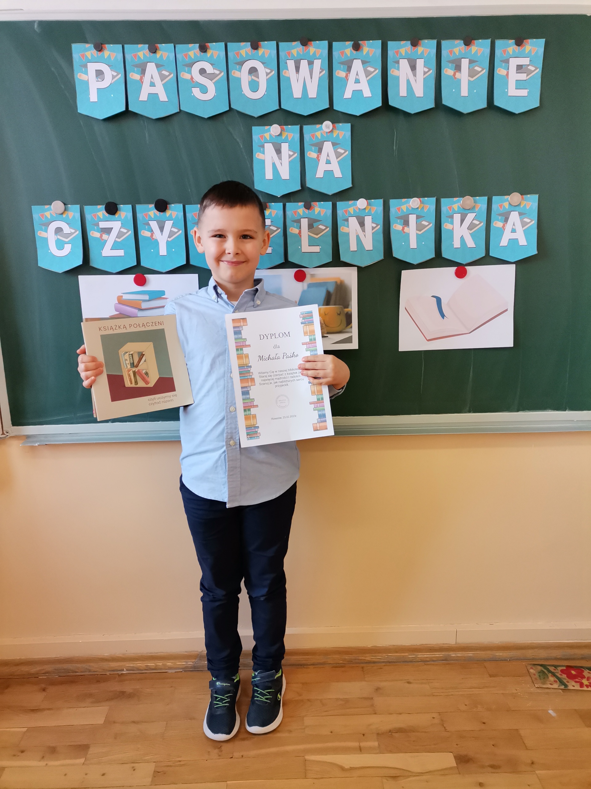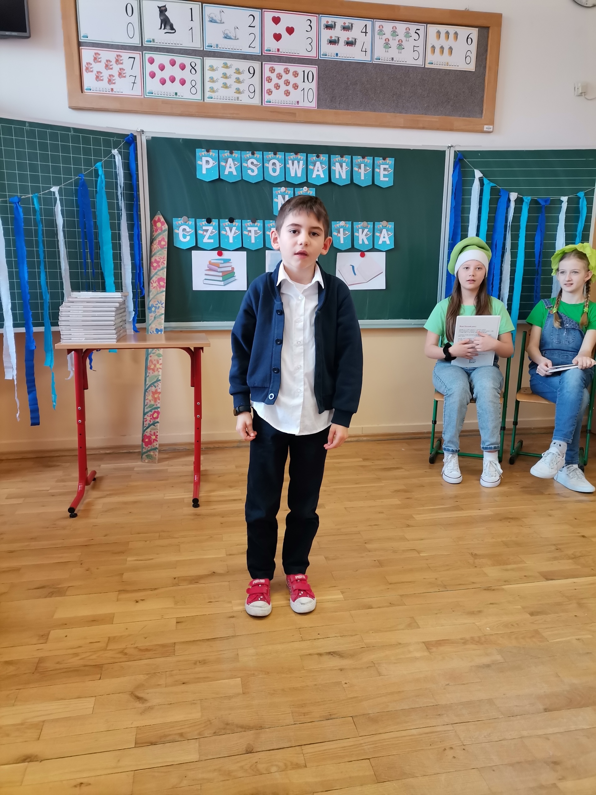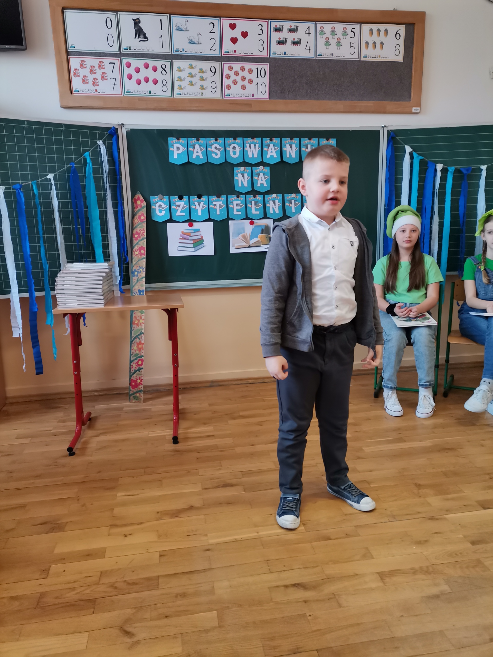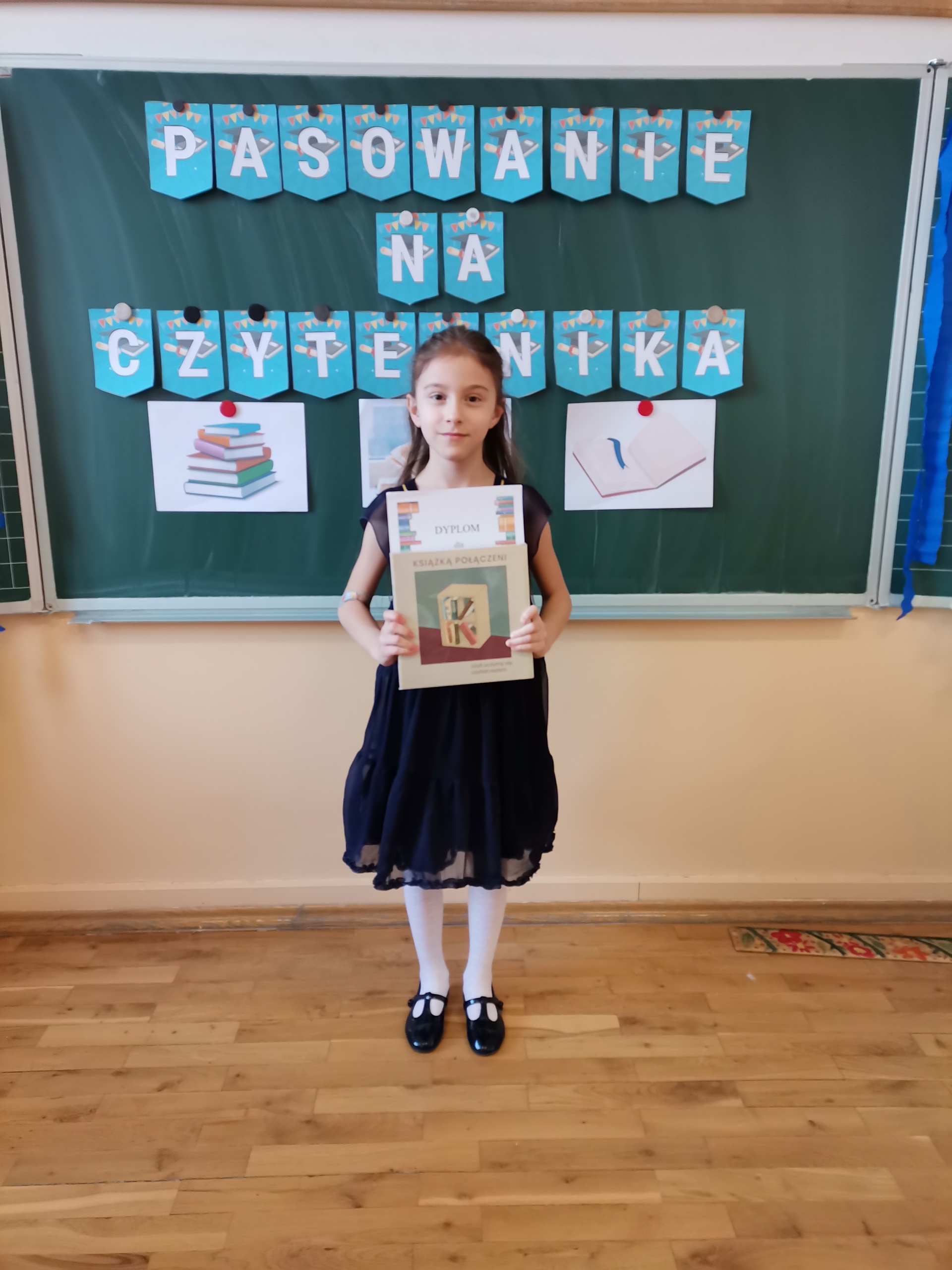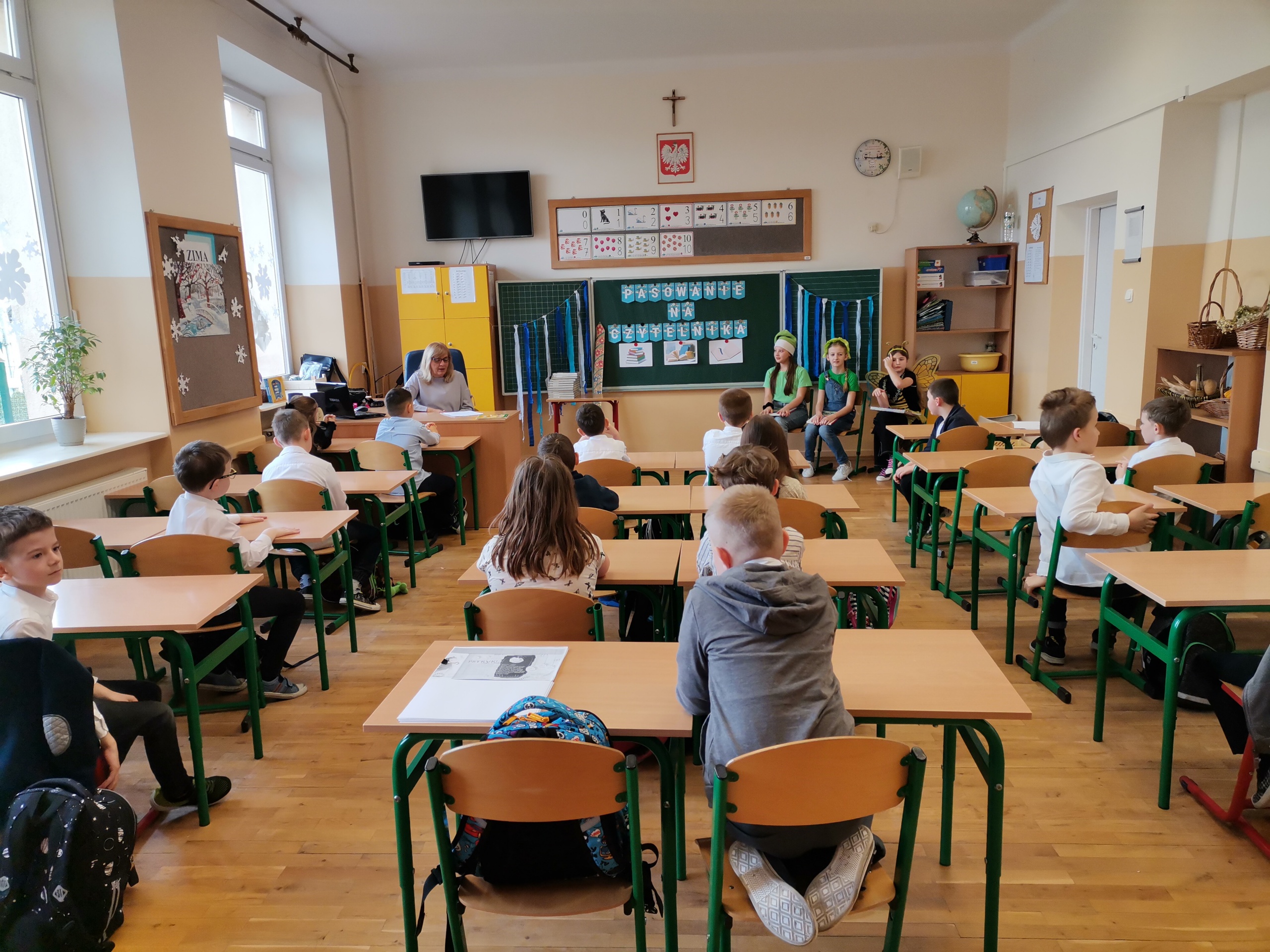 Najmłodsi uczniowie naszej placówki zostali uroczyście przyjęci w poczet czytelników biblioteki szkolnej. Uczniowie podczas uroczystości recytowali wiersze Juliana Tuwima: „Ptasie radio”, „Zosia Samosia”, „Rzepka” oraz z powodzeniem rozwiązywali zagadki związane ze znajomością dziecięcej literatury. Pierwszoklasiści złożyli uroczyste przyrzeczenie, że będą kochać i szanować książki. Od tego momentu uczniowie klas pierwszych stali się pełnoprawnymi czytelnikami biblioteki szkolnej. Na zakończenie uroczystości uczniowie klas pierwszych otrzymali z rąk nauczyciela bibliotekarza pamiątkowe książki.