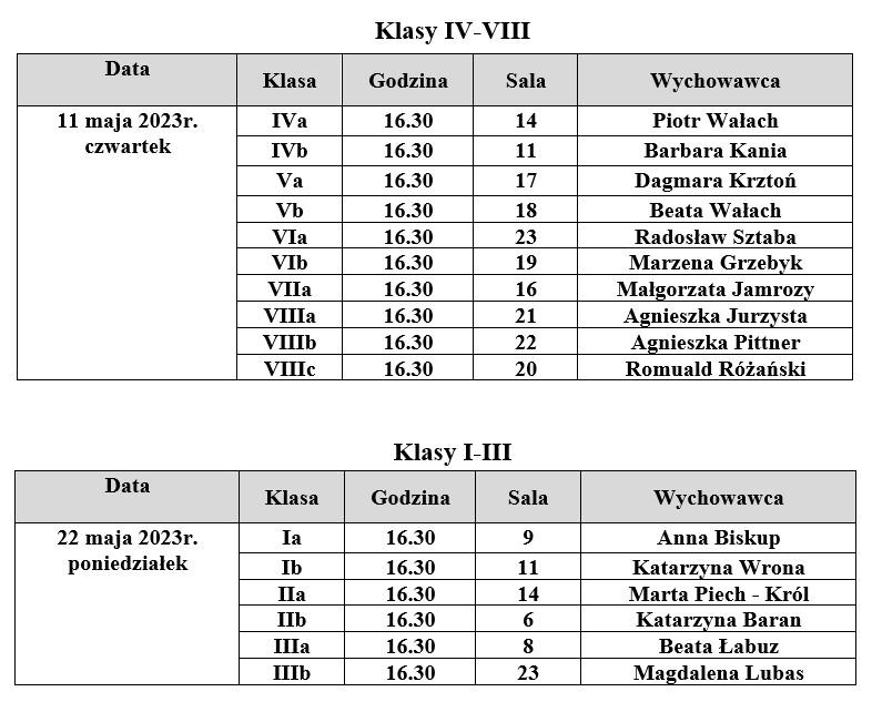 Informujemy, że spotkania wychowawców klas szkoły podstawowej z rodzicami będą odbywać się według harmonogramu zamieszczonego poniżej: