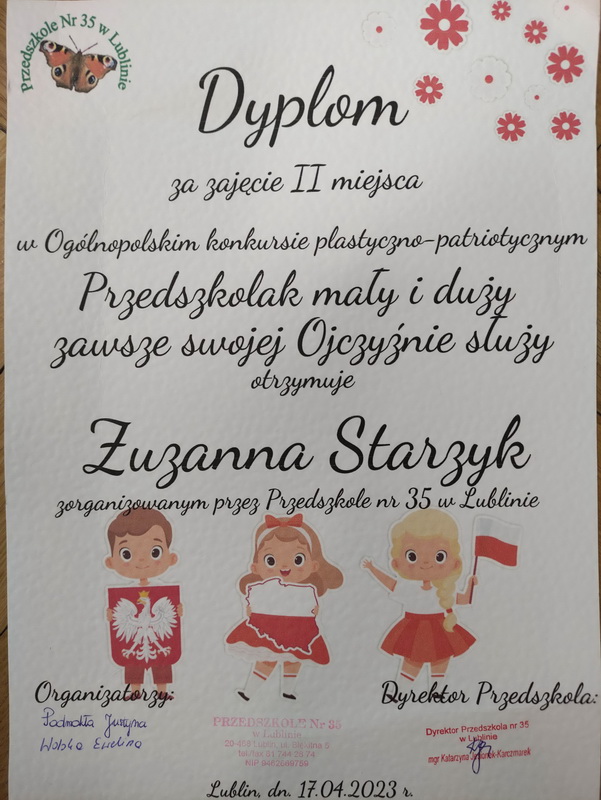 W maju został rozstrzygnięty ogólnopolski konkurs plastyczno-patriotyczny „Przedszkolak mały i duży zawsze swojej Ojczyźnie służy” organizowany przez Przedszkole nr 35 w Lublinie. Komisja konkursowa, biorąc pod uwagę samodzielność pracy, pomysłowość i kreatywność, wyłoniła laureatów konkursu.
