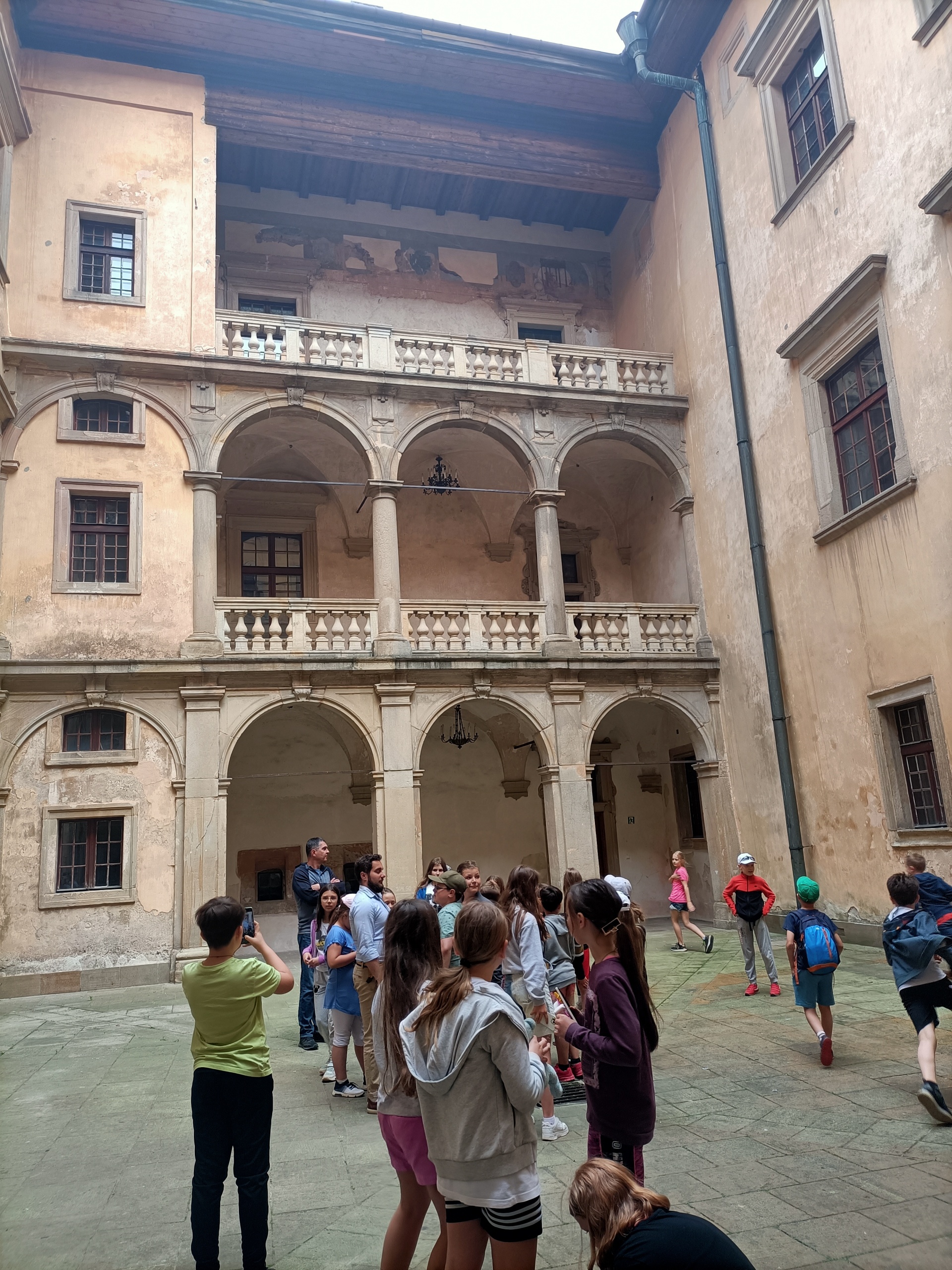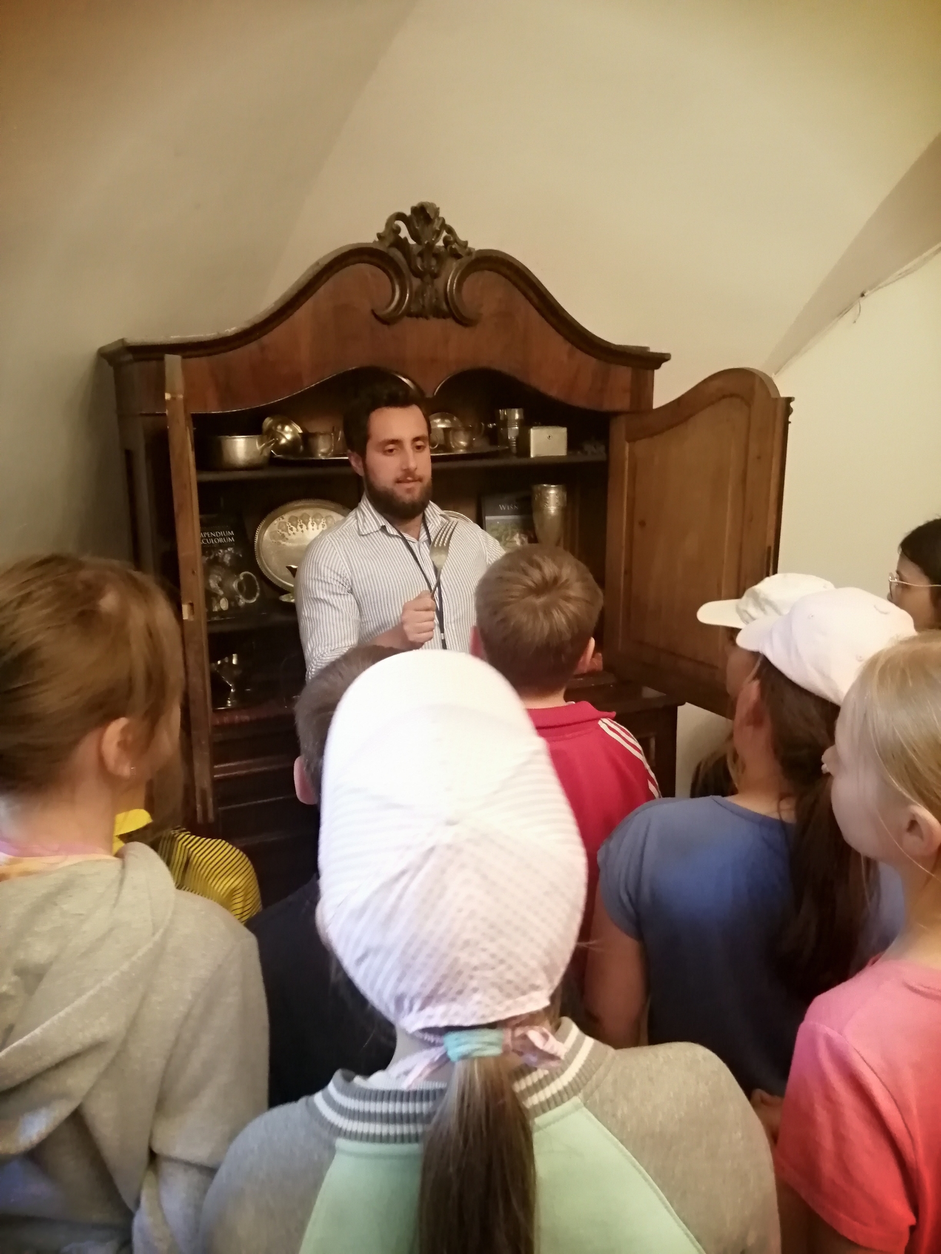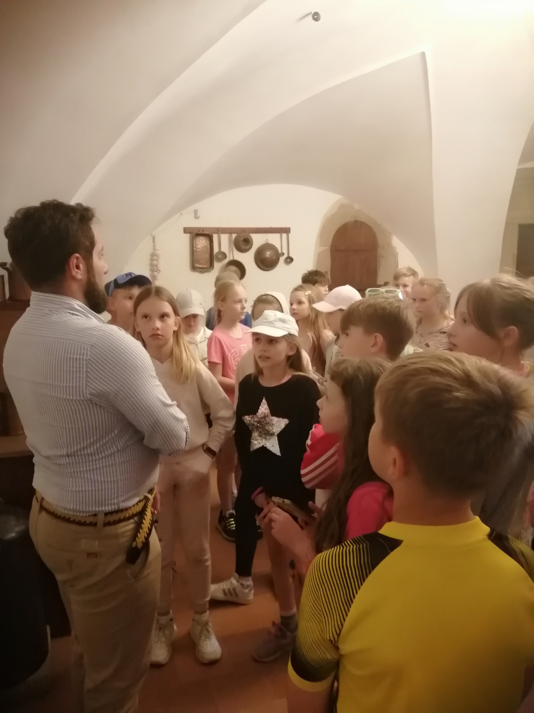 Kolejnym punktem naszej wycieczki było zwiedzanie zamku Kmitów i Lubomirskich, jednego z najcenniejszych w Polsce dzieł wczesnobarokowej architektury rezydencjalno-obronnej. Oprowadzał nas po nim przewodnik, który w ciekawy sposób opowiadał historię tego miejsca. Przemierzaliśmy kolejne sale, podziwiając stare obrazy, gobeliny, meble. Zwiedzanie zamku zakończyliśmy na galerii widokowej skąd podziwialiśmy panoramę Nowego Wiśnicza. W Bastionie VR wcieliliśmy się w skórę nietoperza i odbyliśmy wirtualny lot po zamku, by następnie znaleźć się w jednej z komnat i wrócić w przeszłość. Dzień ten okazał się wspaniałym przeżyciem, a także wyjątkową lekcją historii.