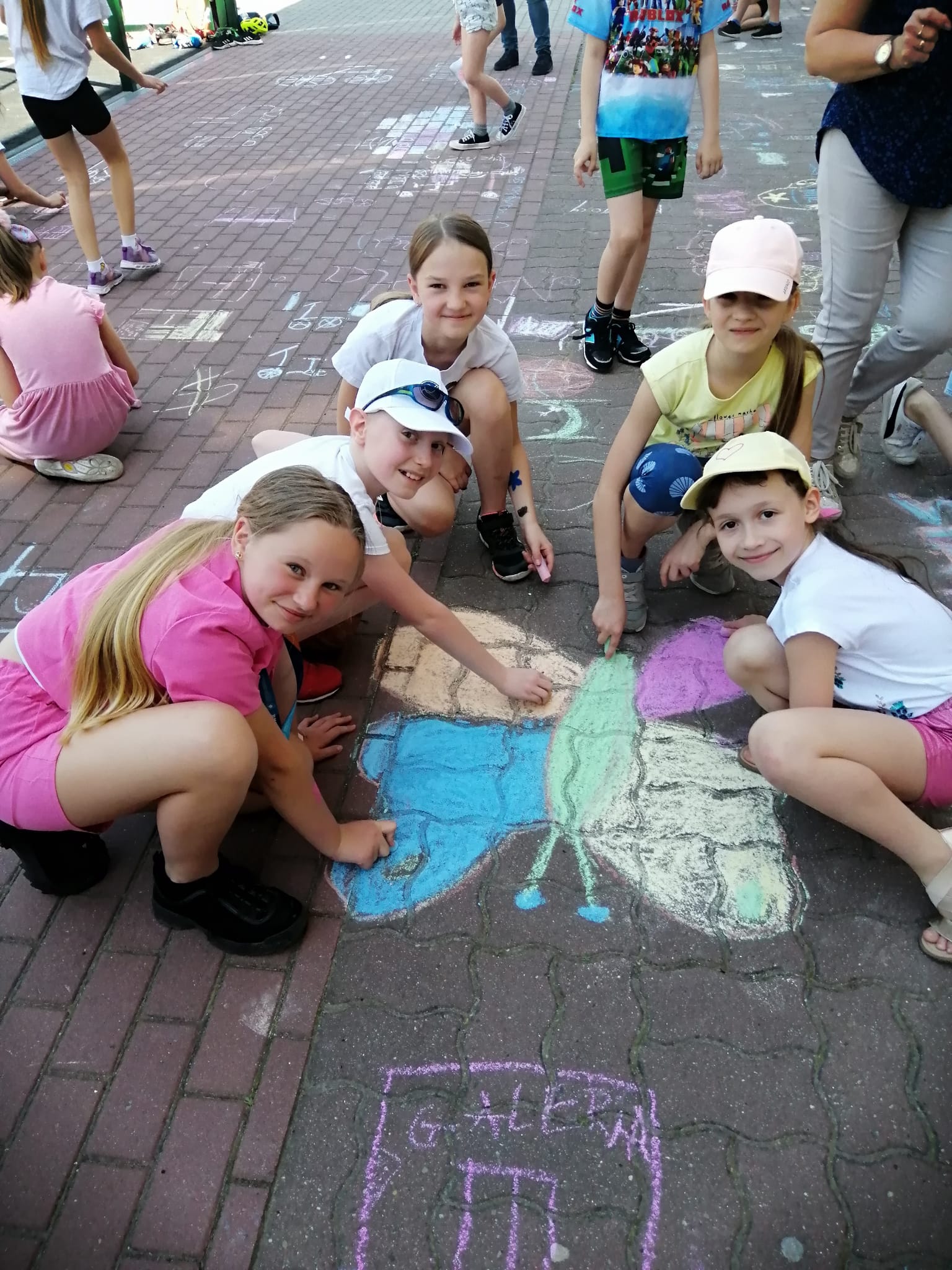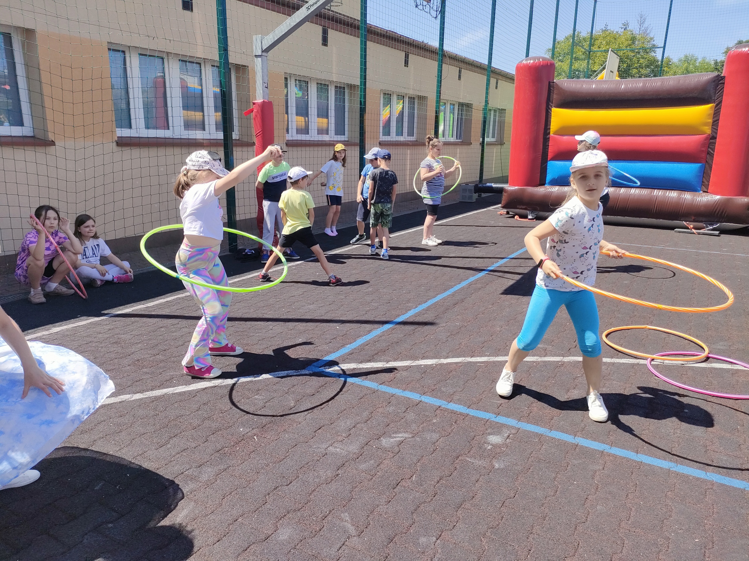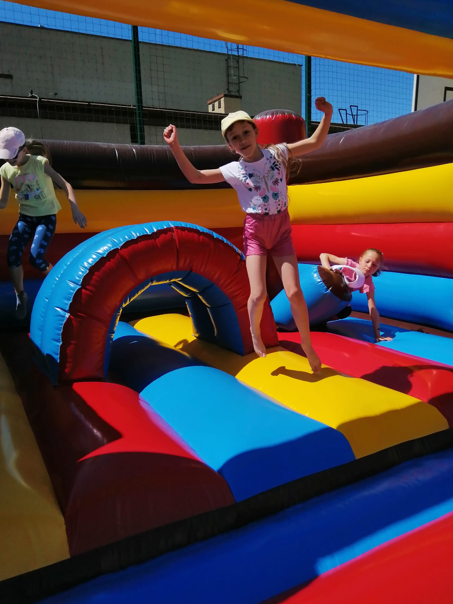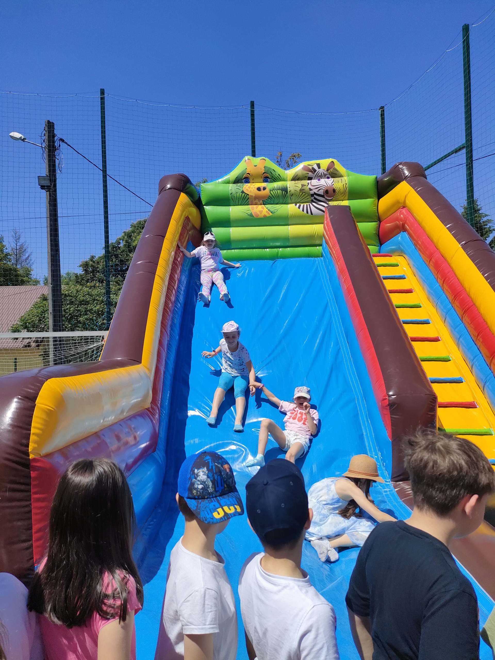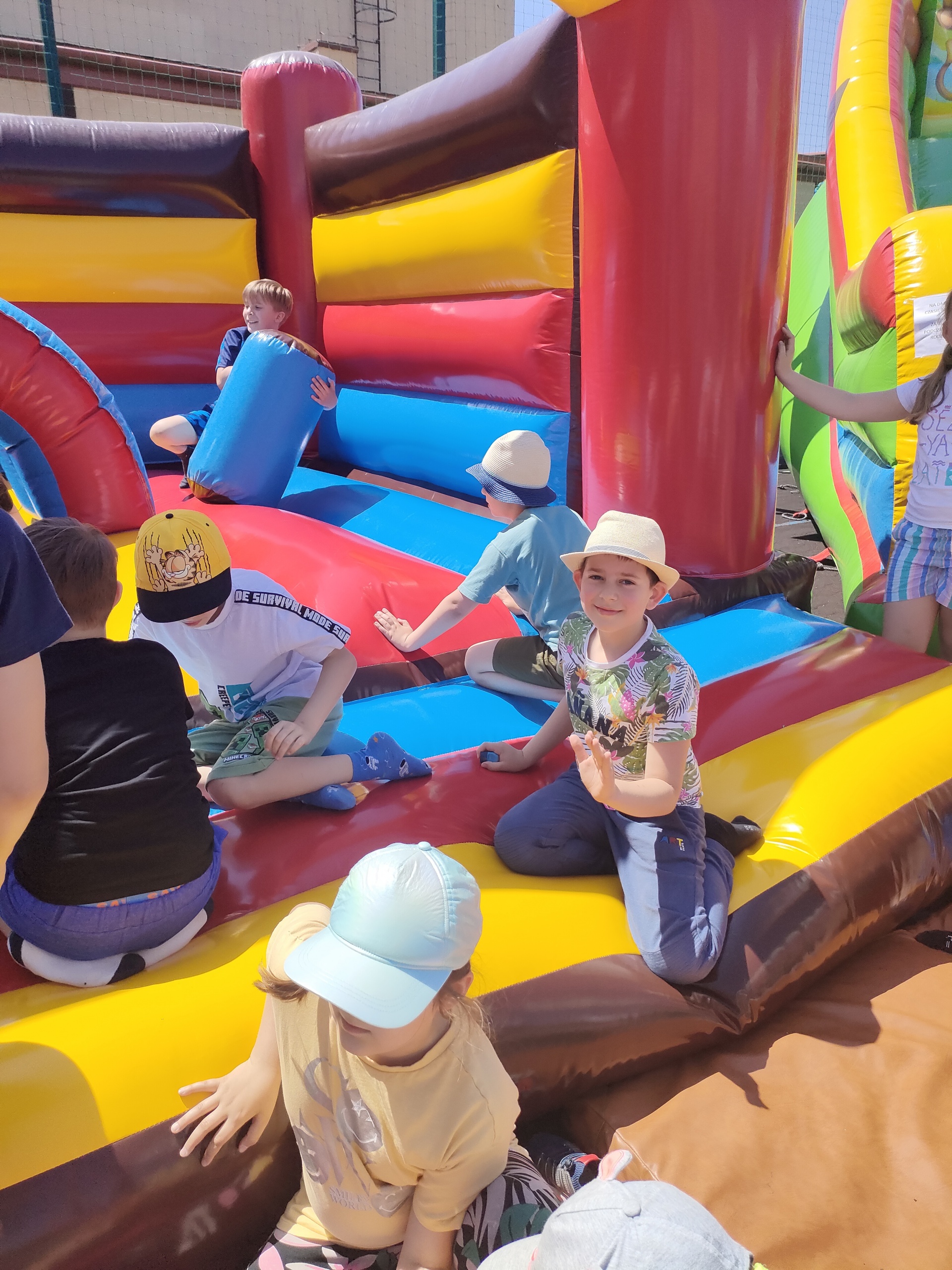 Przede wszystkim dopisała pogoda, dzięki której mogły odbyć się zaplanowane atrakcje, a było ich wiele. Na boisku szkolnym czekały na najmłodszych dmuchane zjeżdżalnie i trampoliny, które uwielbiają wszystkie dzieci. Można było również pobawić się przy muzyce oraz wziąć udział w konkursach sportowych i plastycznych. Wielką atrakcją było stoisko, przy którym malowano twarze… i nie tylko. Dzieci przyniosły swoje ulubione zabawki i gry planszowe, aby wspólnie spędzić czas. Miłym przerywnikiem było wyjście do pobliskiej cukierni na pyszne zimne lody. To był naprawdę udany, radosny Dzień Dziecka!