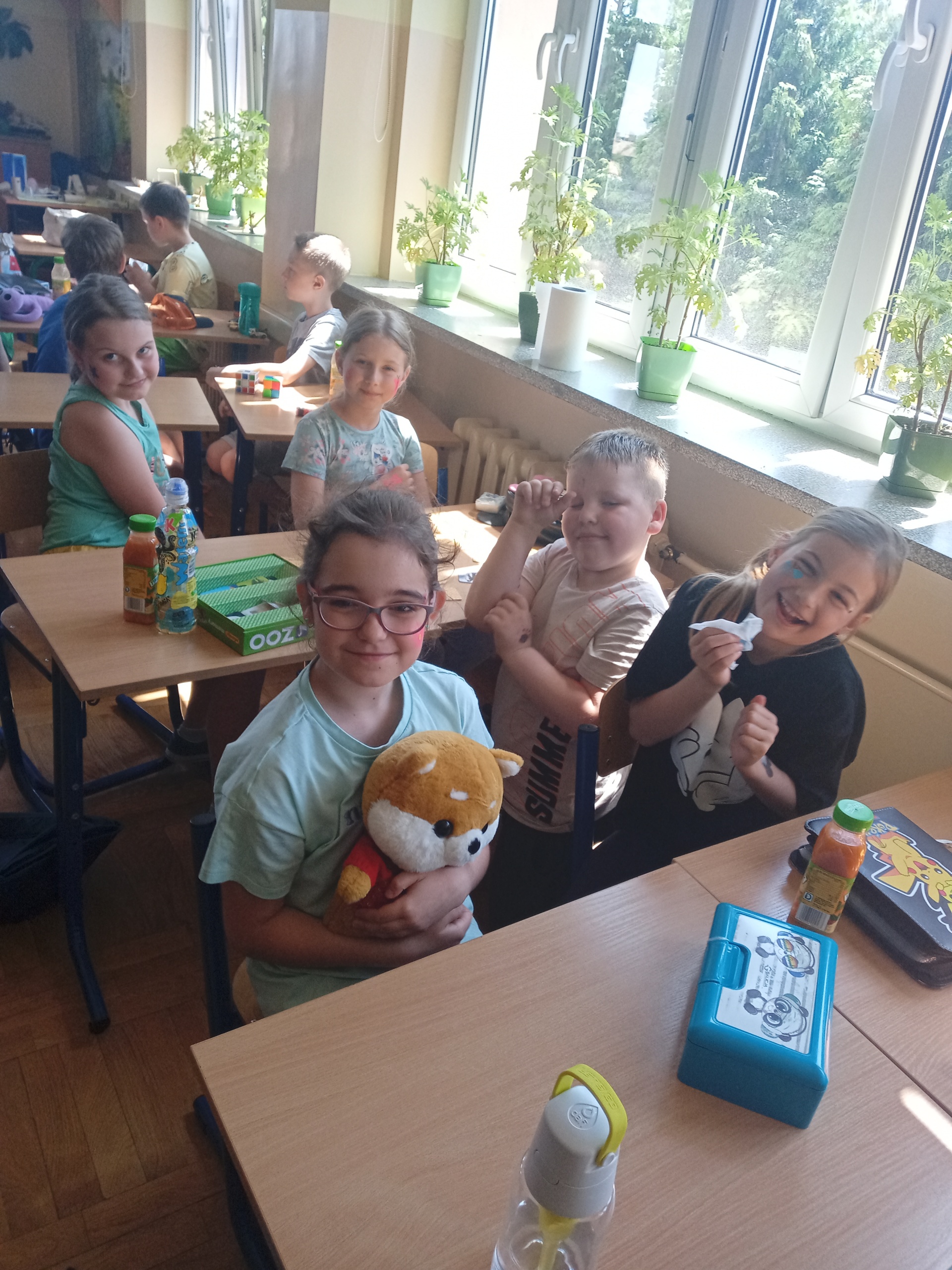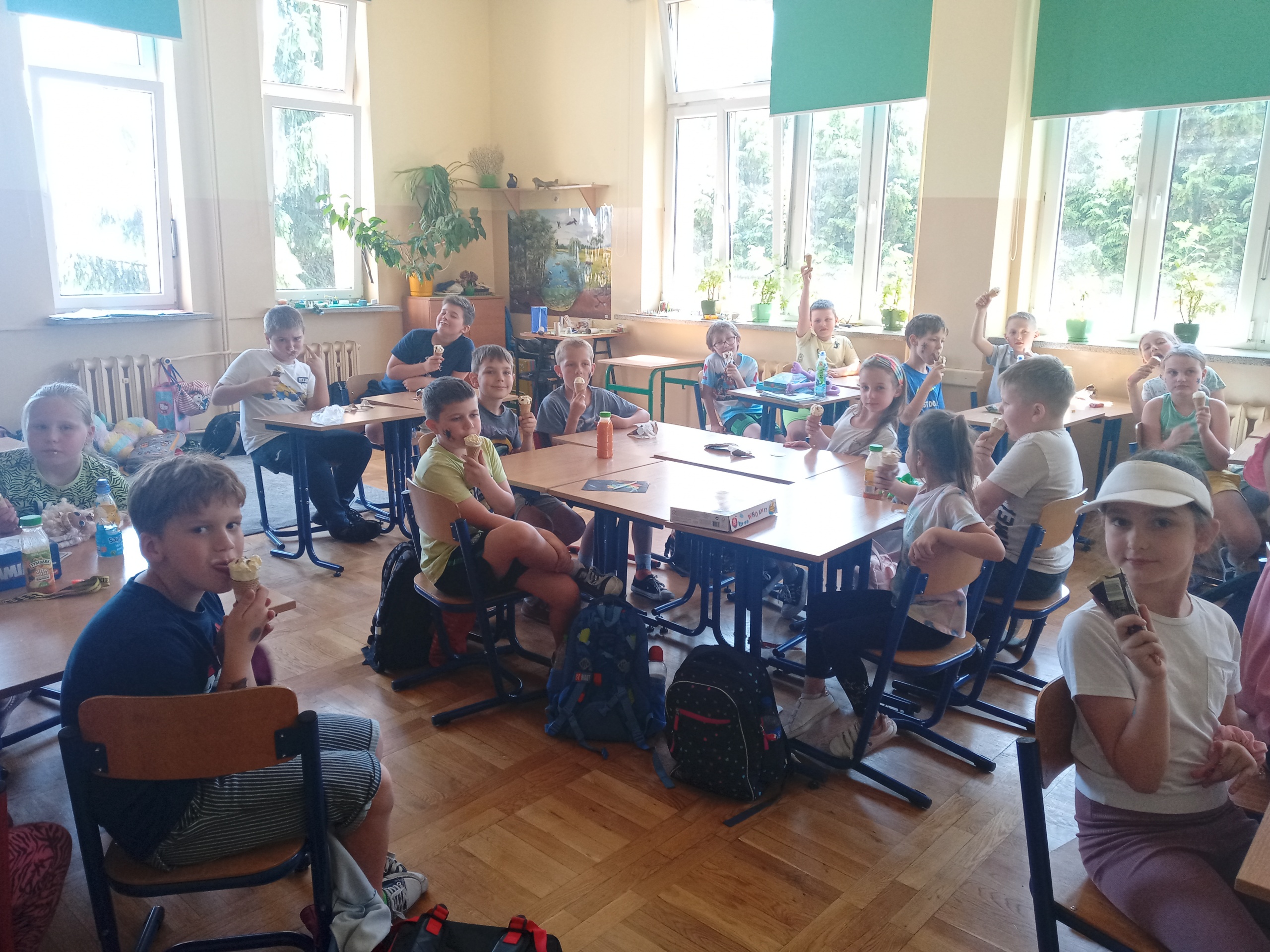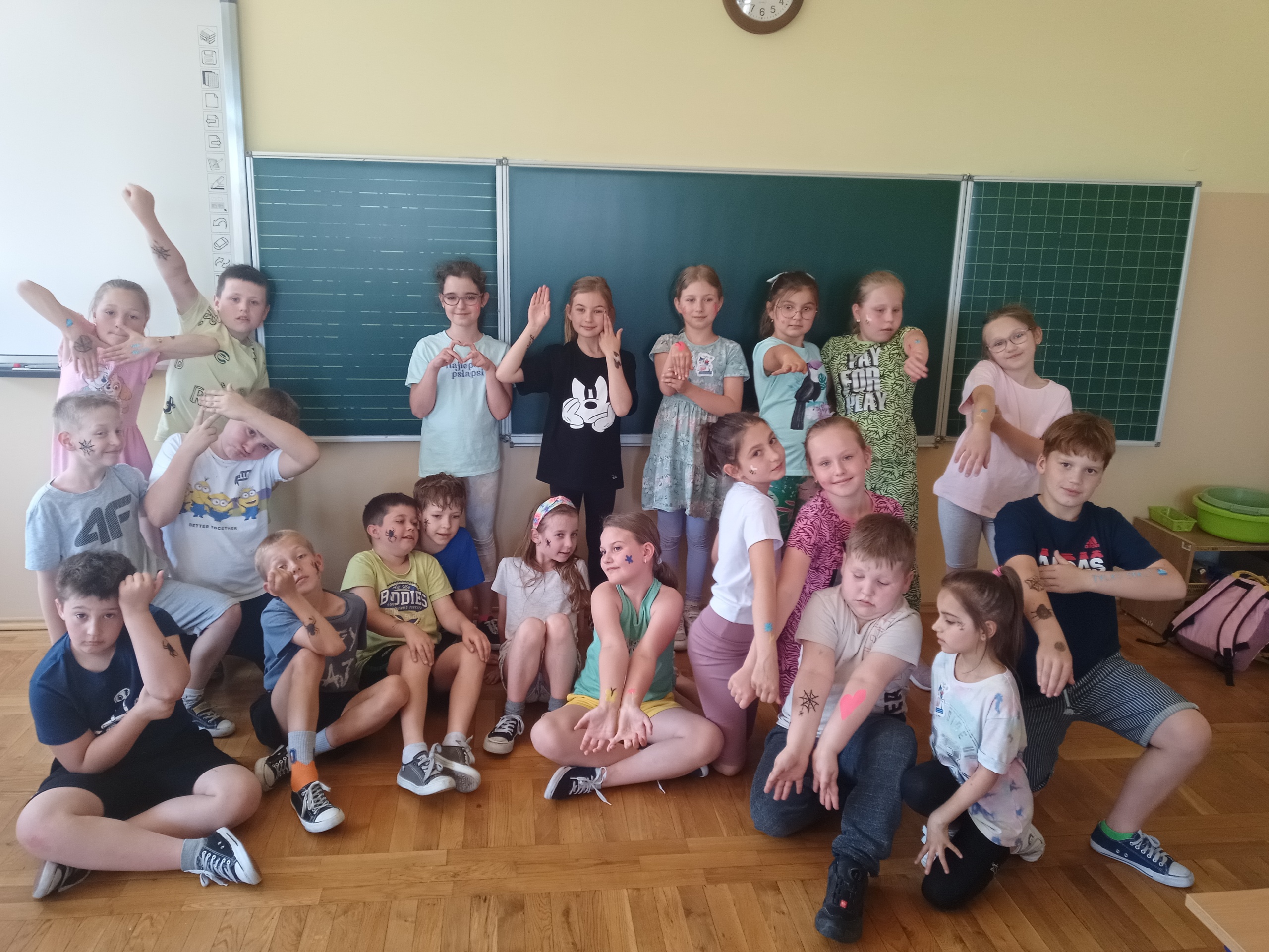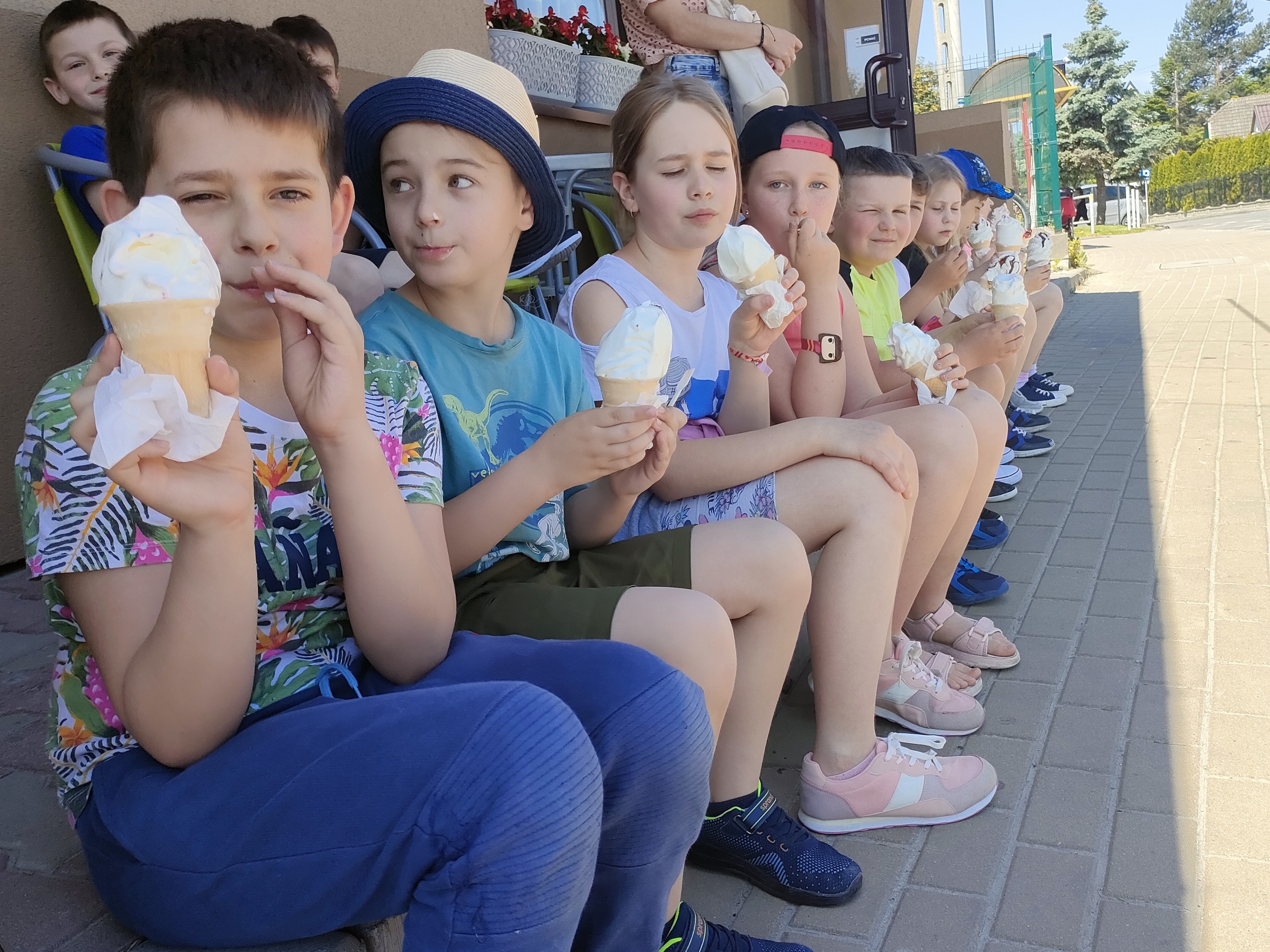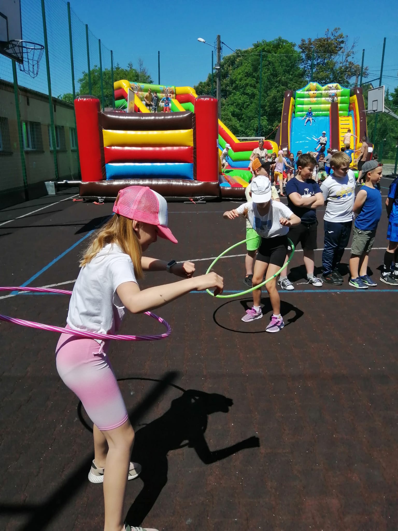 Przede wszystkim dopisała pogoda, dzięki której mogły odbyć się zaplanowane atrakcje, a było ich wiele. Na boisku szkolnym czekały na najmłodszych dmuchane zjeżdżalnie i trampoliny, które uwielbiają wszystkie dzieci. Można było również pobawić się przy muzyce oraz wziąć udział w konkursach sportowych i plastycznych. Wielką atrakcją było stoisko, przy którym malowano twarze… i nie tylko. Dzieci przyniosły swoje ulubione zabawki i gry planszowe, aby wspólnie spędzić czas. Miłym przerywnikiem było wyjście do pobliskiej cukierni na pyszne zimne lody. To był naprawdę udany, radosny Dzień Dziecka!