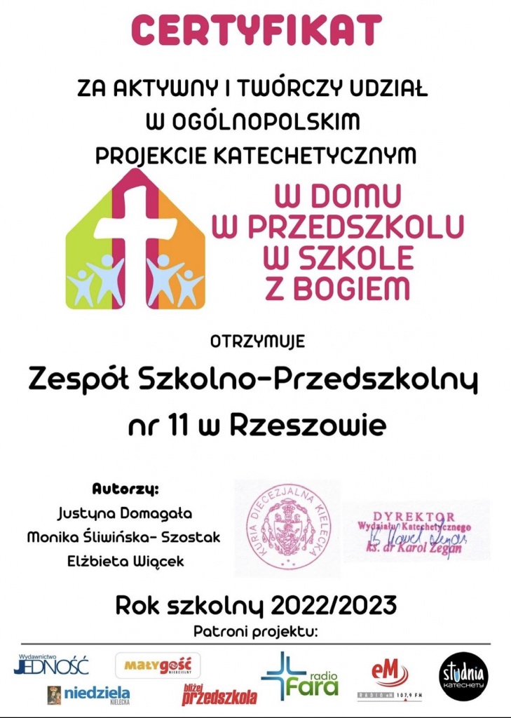 W roku szkolnym 2022/23 nasza szkoła brała udziału w Ogólnopolskim Projekcie Katechetycznym „W domu, w przedszkolu, w szkole z Bogiem”, przeznaczonym dla przedszkoli oraz uczniów klas 1-5 szkoły podstawowej. Głównym celem projektu było odkrywanie tajemnicy osobowego Boga, objawiającego ludziom swoją miłość, poprzez współdziałanie z Rodzinami, różnymi środowiskami, organizacjami i instytucjami wspierającymi rozwój tożsamości religijnej dziecka. Regulamin powstał w oparciu o Podstawę Programową Katechezy Kościoła Katolickiego w Polsce, Podstawę Programową Kształcenia Ogólnego oraz kierunki polityki oświatowej państwa na rok szkolny 2022/2023.