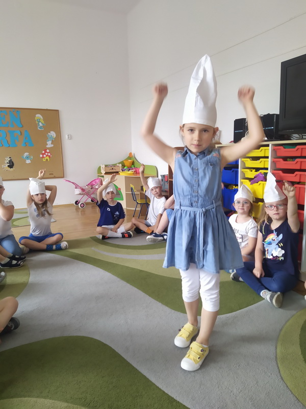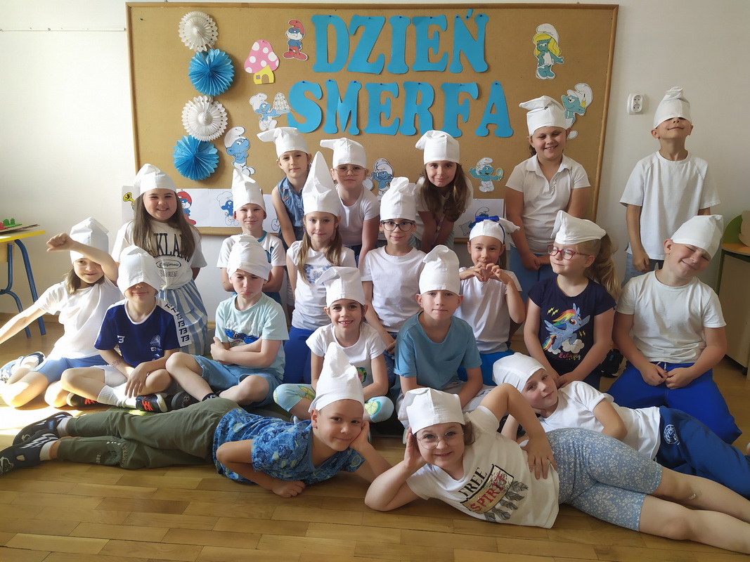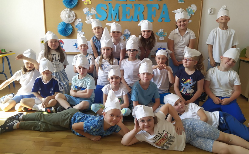Choć wakacje już za pasem, my nie zwalniamy i świętujemy. 29 czerwca w związku z obchodami Światowego Dnia Smerfa, nasza przedszkolna grupa Smerfy przyszła do przedszkola ubrana na biało-niebiesko. Wspólną zabawę tego dnia, rozpoczęliśmy od magicznego zaklęcia, za sprawą którego w mgnieniu oka na głowie każdego chłopca i dziewczynki pojawiła się najprawdziwsza smerfna czapka. Następnie przypomnieliśmy imiona kilku smerfów i wspólnie opisywaliśmy ich wygląd. Była również chwila odpoczynku, podczas której mieliśmy okazję posłuchać bajek o smerfach oraz bliżej przyjrzeć się wiosce smerfów i odnaleźć swoich ulubionych bohaterów. Razem ze smerfem Malarzem malowaliśmy wizerunek wymyślonego smerfa, a na koniec zgadywaliśmy jakim smerfem jesteśmy podczas zabawy w kalambury. To był iście smerfastyczny dzień. Szkoda tylko, że skończył się tak szybko.