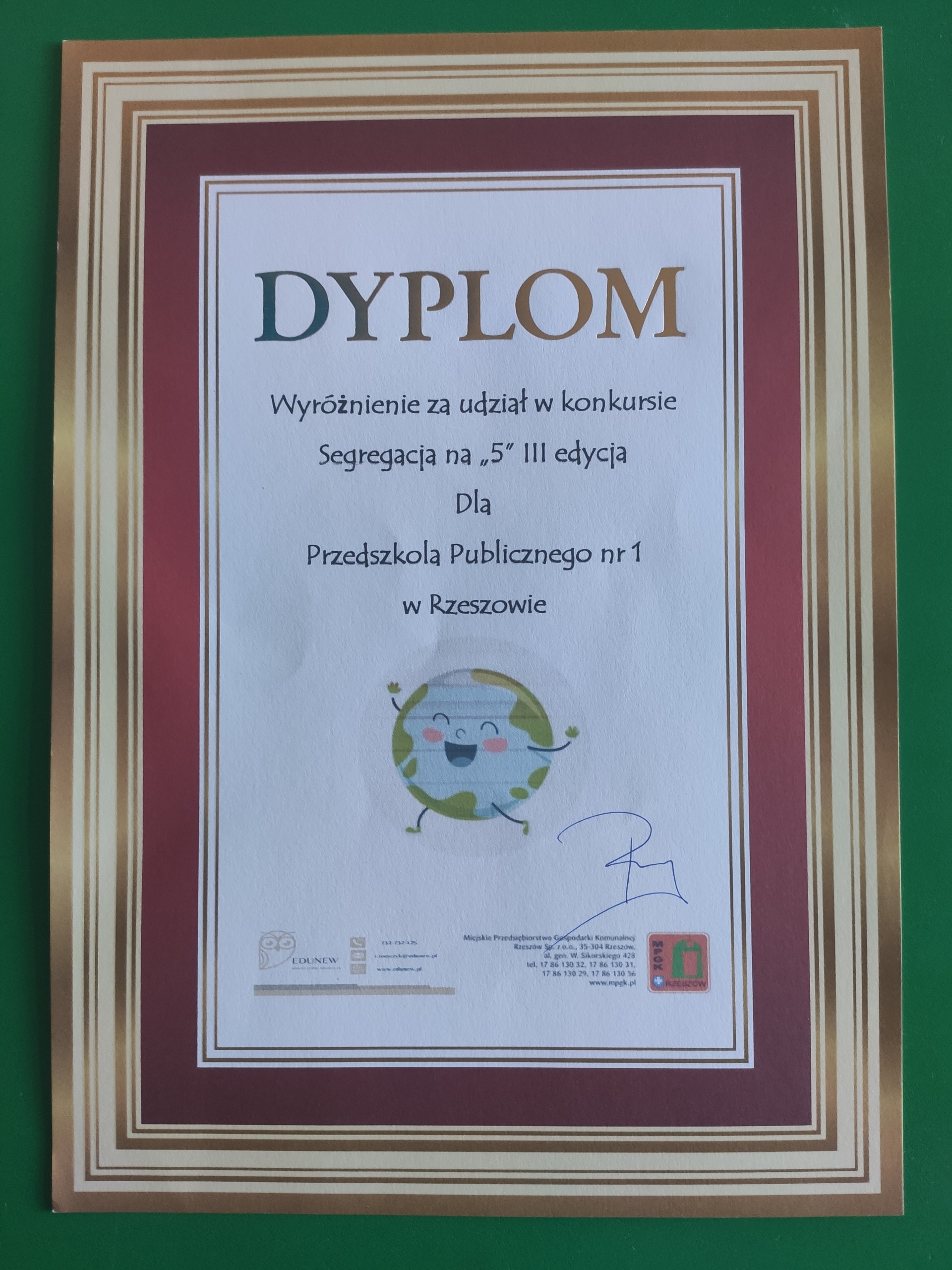 Tuż przed przerwą wakacyjną nasze przedszkole wzięło udział w konkursie plastyczno–ekologicznym „Segregacja na 5”, zorganizowanym przez MPGK w Rzeszowie we współpracy z organizacją Nowoczesna Edukacja. Miło nam poinformować, iż nasza placówka otrzymała w nim wyróżnienie. Każda grupa przedszkolna wykonała obrazek związany z prawidłową segregacją odpadów, który będzie można wykorzystać na zajęciach o tematyce ekologicznej z użyciem sceny teatrzyku. Głównym celem konkursu było uświadomienie i przekonanie najmłodszych, że segregowanie odpadów jest bardzo ważne o każdej porze roku – dla środowiska i dla nich samych. Wszystkim przedszkolakom serdecznie dziękujemy za zaangażowanie w wykonanie prac, pomysłowość i kreatywność oraz gratulujemy sukcesu.