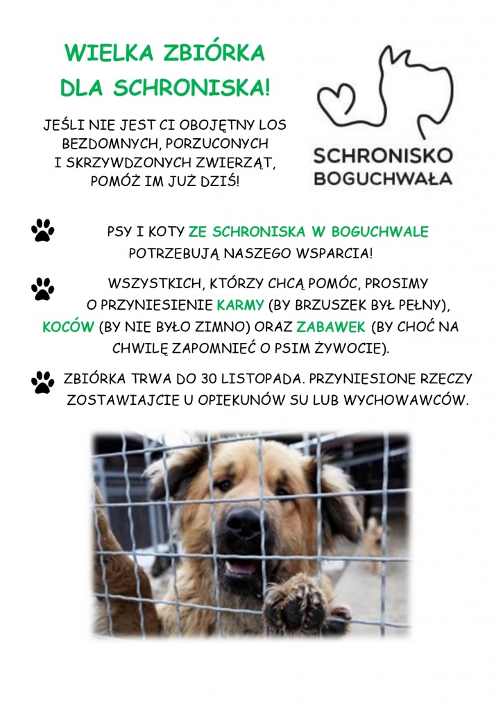 Samorząd Uczniowski nie zapomina o potrzebujących pomocy zwierzętach. Do końca listopada potrwa akcja zbiórki darów dla zwierząt ze schroniska w Boguchwale. Wszystkich, którym nie jest obojętny los bezdomnych, porzuconych lub skrzywdzonych psów i kotów, prosimy o przynoszenie karmy, koców, zabawek lub innych artykułów potrzebnych do zapewnienia opieki podopiecznym schroniska. Zostawiać je można u opiekunów Samorządu Uczniowskiego lub wychowawców. W akcji bierze udział także nasze przedszkole.