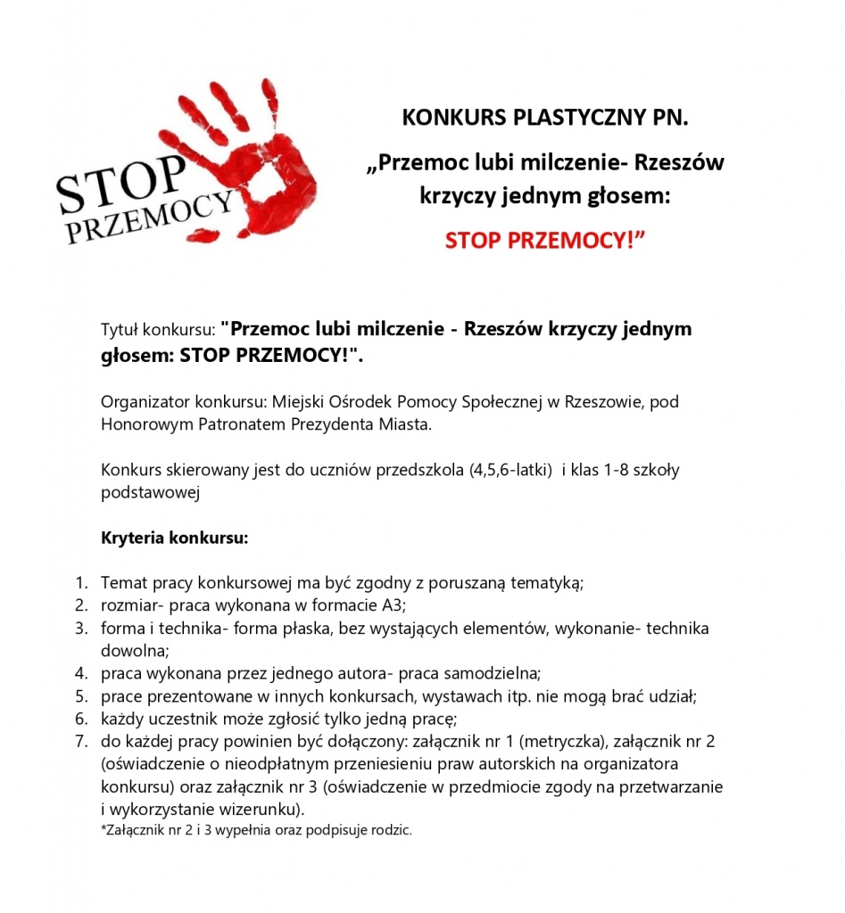 Zapraszamy wszystkich uczniów do wzięcia udziału w konkursie plastycznym zorganizowanym przez Miejski Ośrodek Pomocy Społecznej w Rzeszowie, pod Honorowym Patronatem Prezydenta Miasta pt. “Przemoc lubi milczenie – Rzeszów krzyczy jednym głosem: STOP PRZEMOCY!”. Prace w formacie A3 należy złożyć najpóźniej w poniedziałek tj. 20.11.2023 roku do godziny 10:00 w gabinecie pedagoga i psychologa szkolnego (sala 21a).