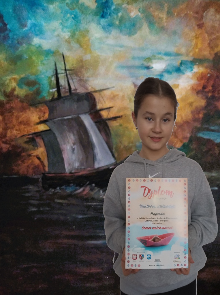 Wiktoria Kalandyk, uczennica klasy 8a, zdobyła I miejsce w XVI Ogólnopolskim Konkursie Plastycznym “Słońce, woda i przygoda”. Konkurs był organizowany przez Szkołę Podstawową nr 2 w Rzeszowie pod honorowym patronatem Wojewody Podkarpackiego, Marszałka Województwa Podkarpackiego, Prezydenta Miasta Rzeszowa oraz Rzeszowskiego Okręgowego Związku Żeglarskiego. Wzięło w nim udział ponad 700 uczestników reprezentujących placówki oświatowe i domy kultury z całej Polski, co świadczy o dużej konkurencji i ogromnym sukcesie naszej uczennicy.