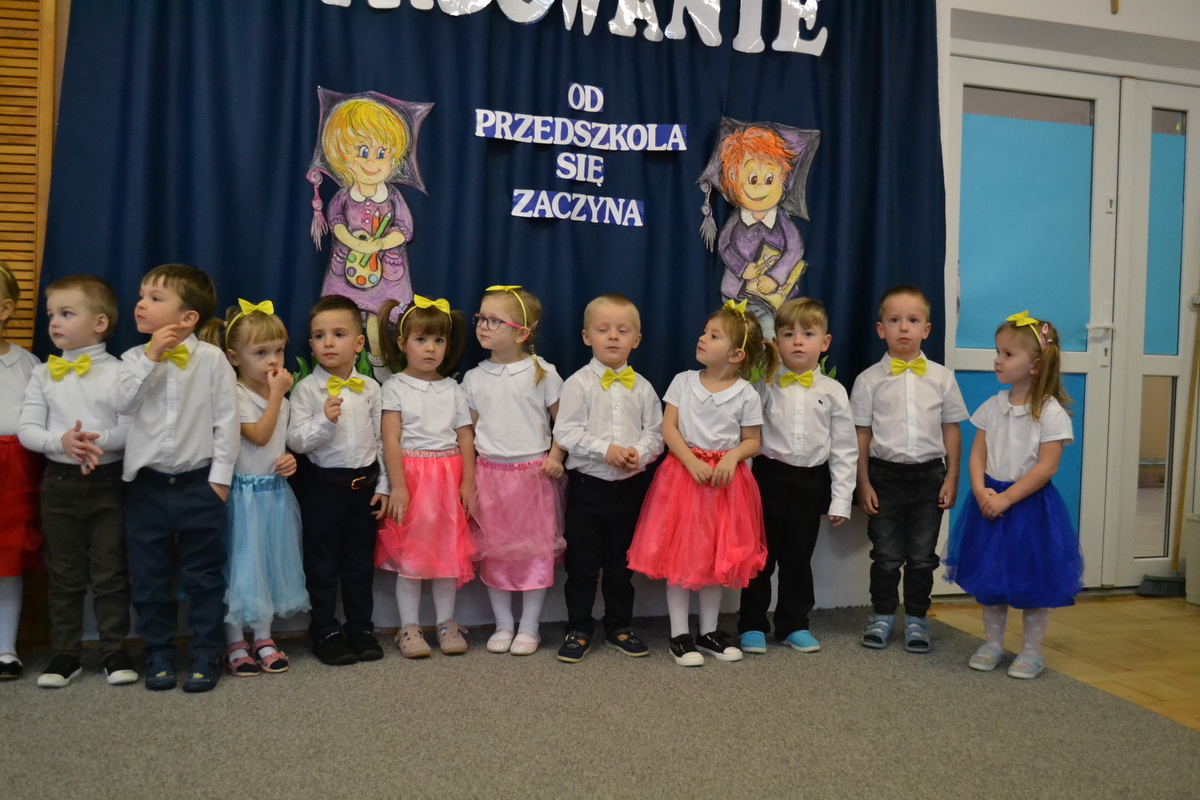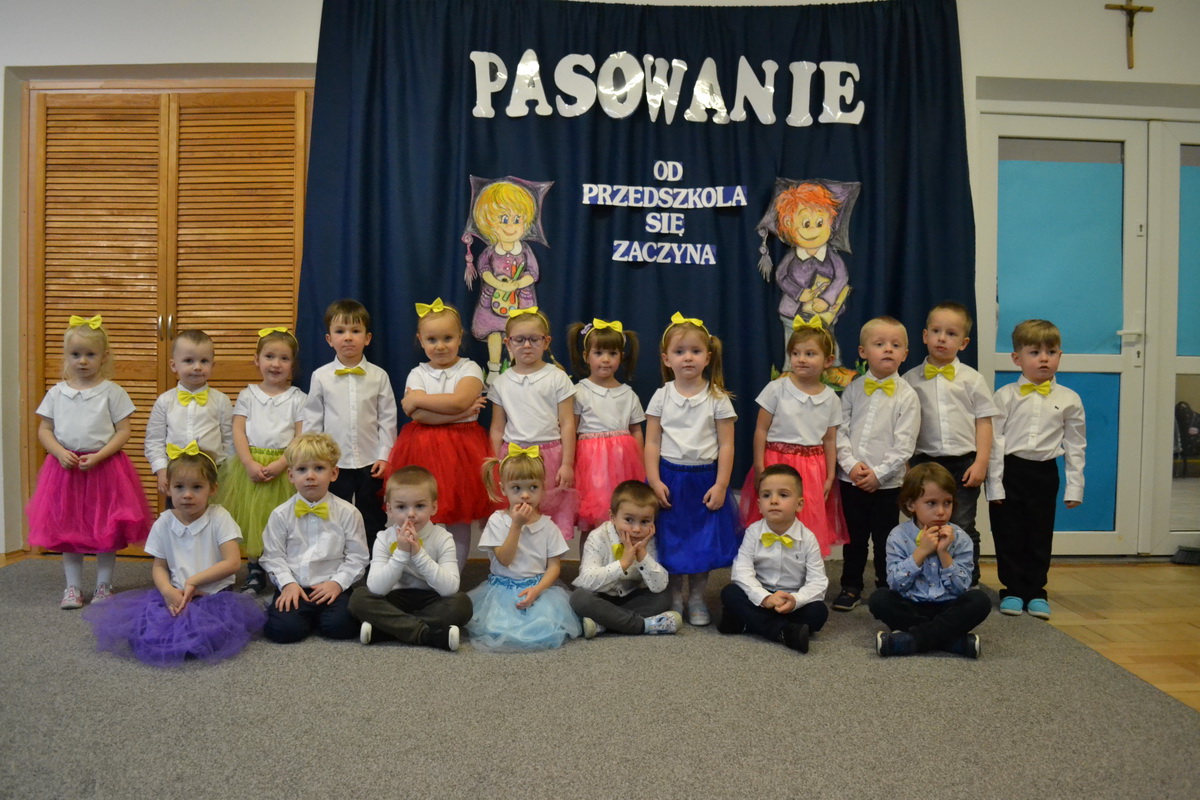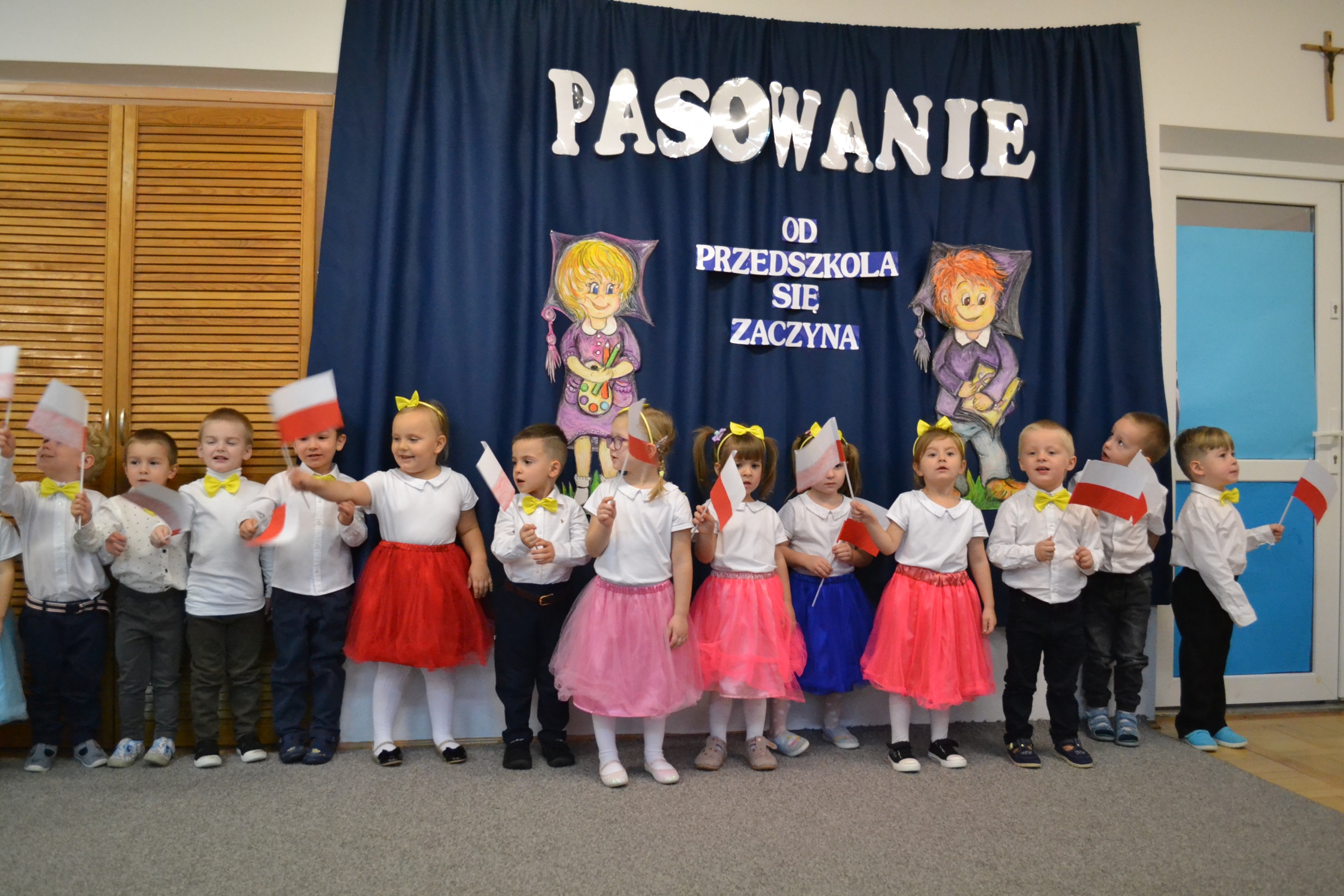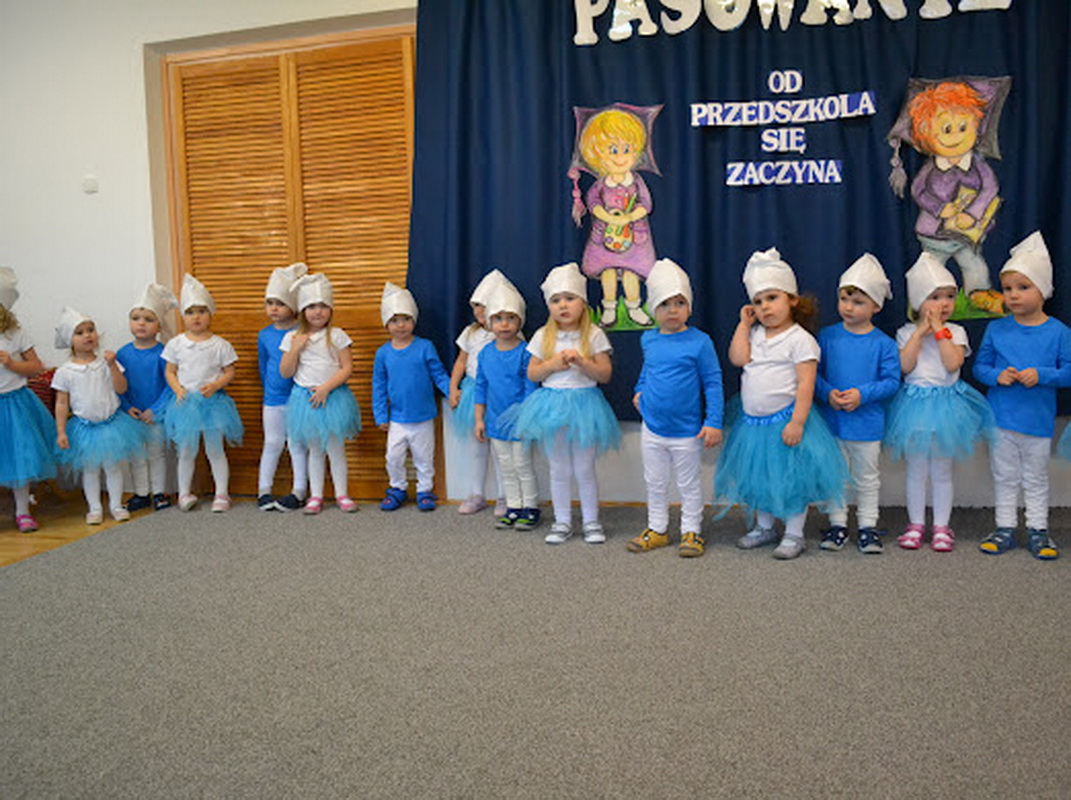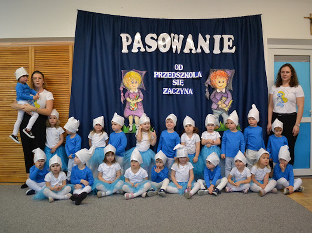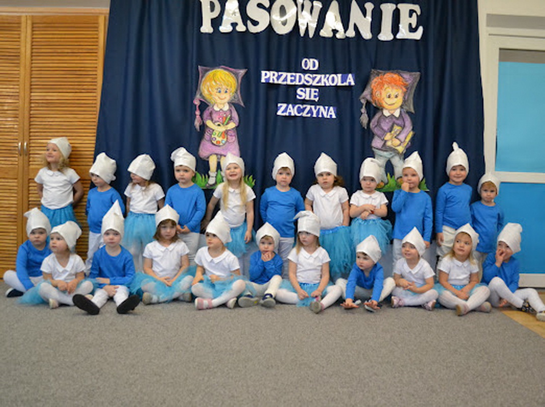 28 listopada w naszym przedszkolu odbyło się pasowanie na przedszkolaka. Bohaterami uroczystości były dzieci z grup Smerfy i Pszczółki, a towarzyszyli im zaproszeni rodzice oraz pani dyrektor Beata Motyl. Maluszki zaprezentowały program artystyczny, który wzbudził zachwyt gości. Występując przed tak wielką publicznością, dzieci wykazały się nie tylko swoimi umiejętnościami, ale również wielką odwagą. Pięknie recytowały wiersze, śpiewały piosenki i tańczyły. Po części artystycznej ślubowały: zgodnie bawić się w przedszkolu, słuchać pani, pomagać kolegom, przychodzić każdego dnia z uśmiechem oraz być dzielnym przedszkolakiem. Punktem kulminacyjnym było pasowanie, dokonane poprzez symboliczne położenie kredki przez panią dyrektor na ramieniu każdego dziecka. Na pamiątkę tego ważnego wydarzenia dzieci otrzymały dyplomy od wychowawców oraz upominki od rodziców. Występy były wyjątkowe, dlatego w niejednym oku pojawiły się łzy wzruszenia. Uroczystość ta pozwoliła dzieciom z dumą powiedzieć – JESTEM PRZEDSZKOLAKIEM!
