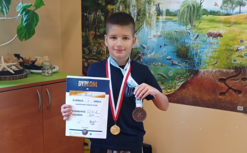 W dniach 17-19 listopada odbyły się zawody w Tychach z cyklu Grand Prix Polski w skokach do wody. Wzięło w nich udział 60 najmłodszych zawodników z całego kraju (w kategoriach E i D – 7-11). Zawodnicy reprezentujący KSW Stal Rzeszów wywalczyli łącznie 6 medali. Jeden z nich, brązowy, w konkurencji E2 (8/9 lat) na trampolinie 1m zdobył uczeń naszej szkoły z klasy 3a, Roma Neoneta z wynikiem 81.55. Gratulujemy i życzymy dalszych sukcesów!