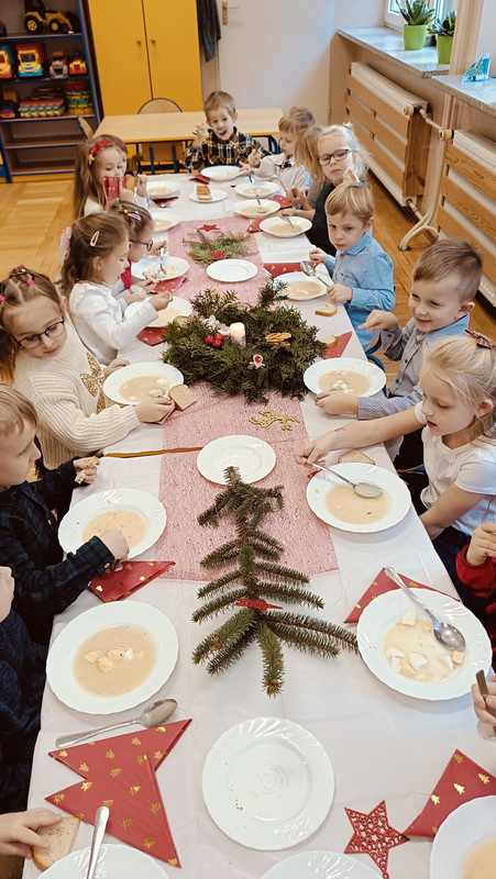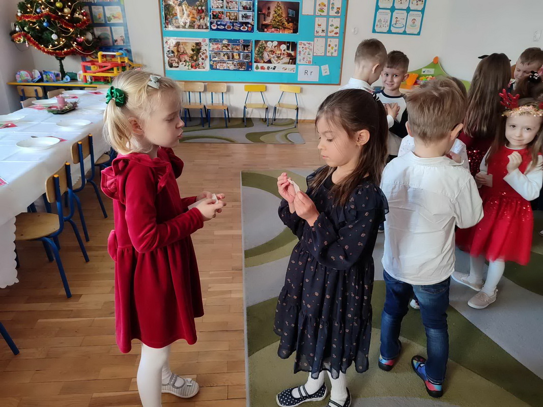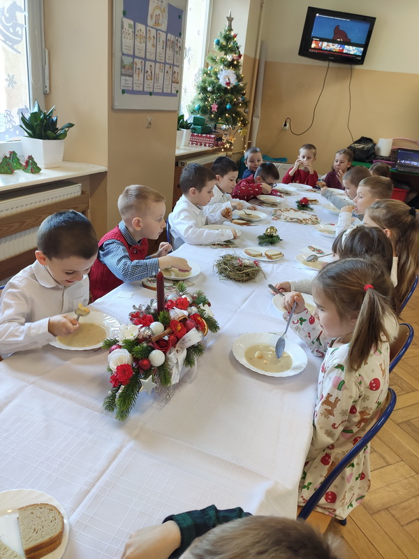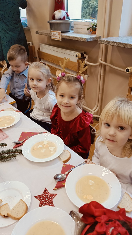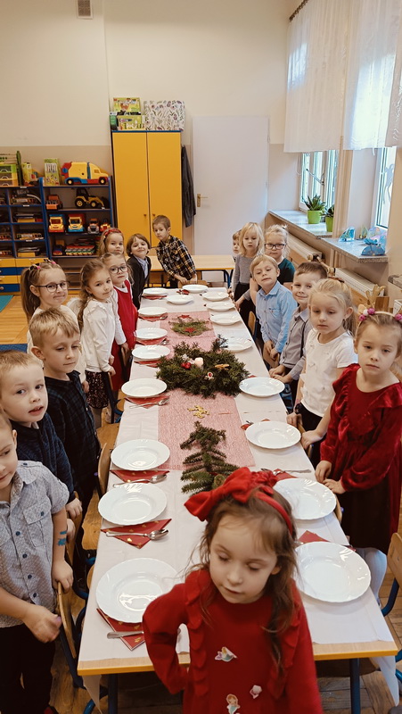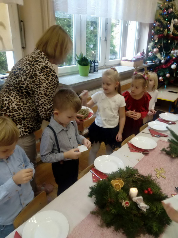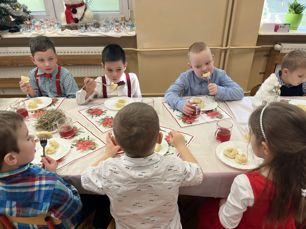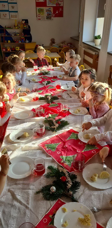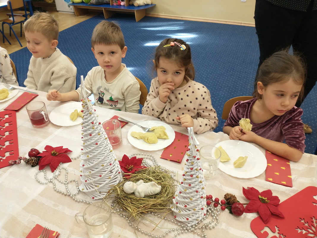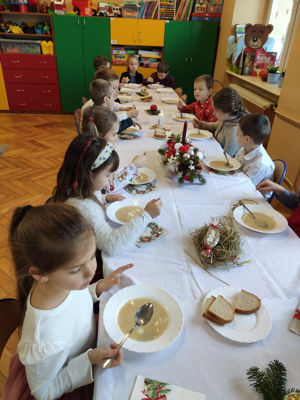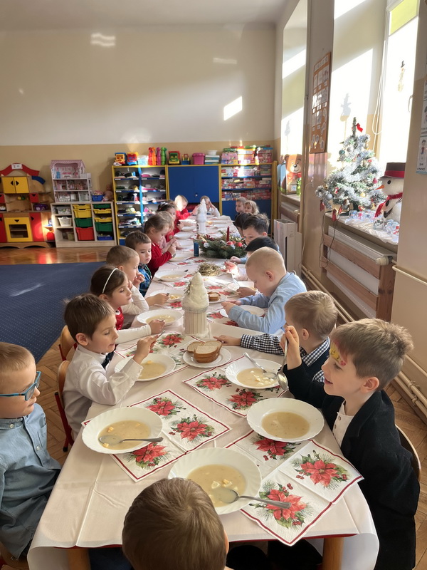 Wigilijne spotkanie przedszkolaków to tradycja pielęgnowana od lat w naszej placówce. Dzieci każdego roku poznają tradycje i zwyczaje świąteczne, aktywnie uczestniczą w przygotowaniach: wykonują ozdoby świąteczne, łańcuchy choinkowe oraz uczą się kolęd i pastorałek. W dzień przedszkolnej wigilii w całym przedszkolu panowała radosna, ożywiona atmosfera. Świąteczne dekoracje oraz dzieci w galowych strojach wprowadzały nastrój oczekiwania na wyjątkowe, niecodzienne wydarzenie.