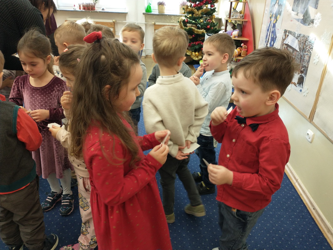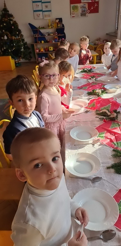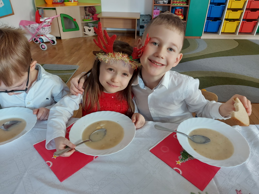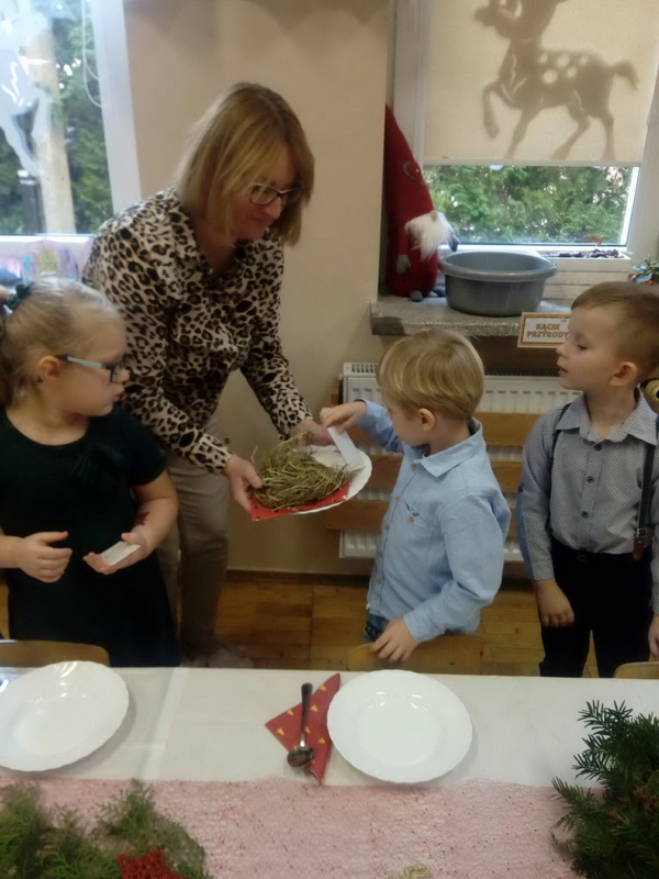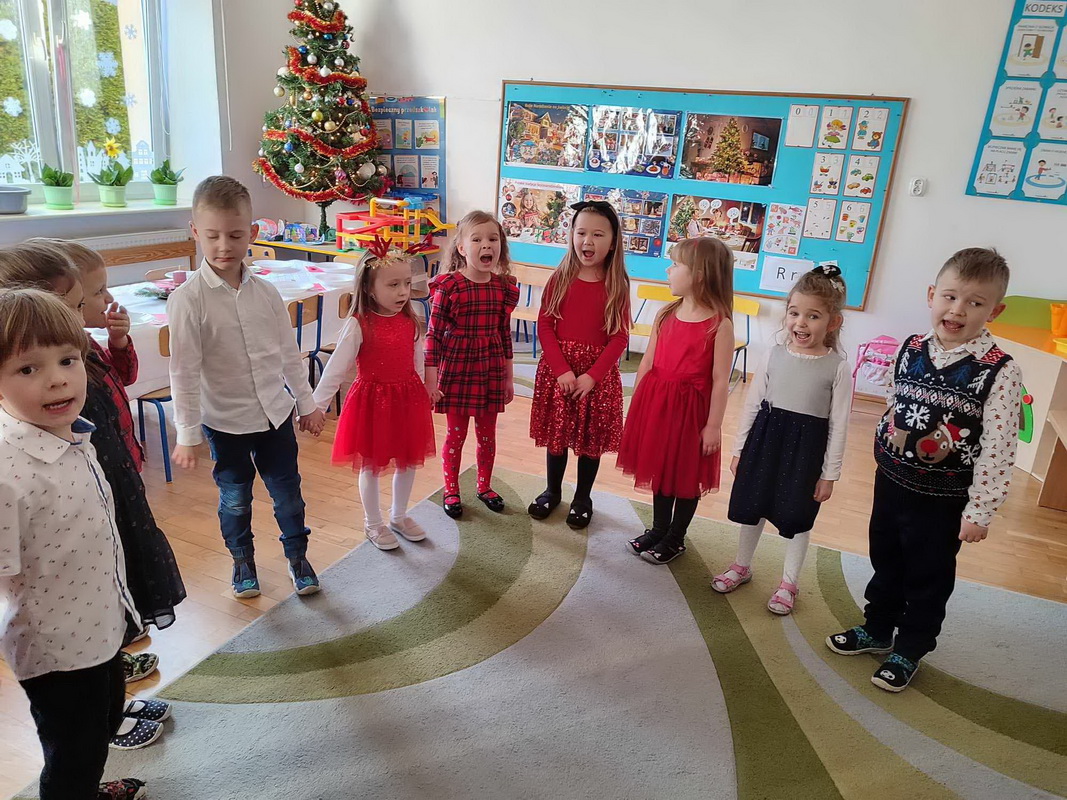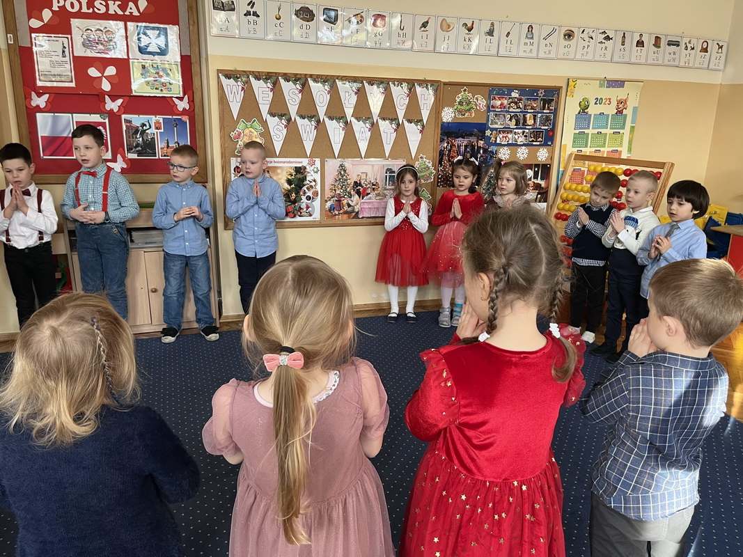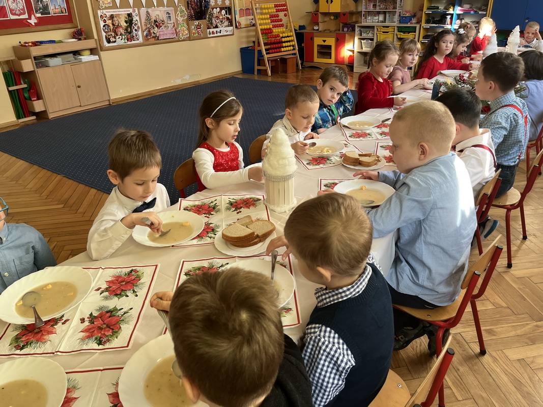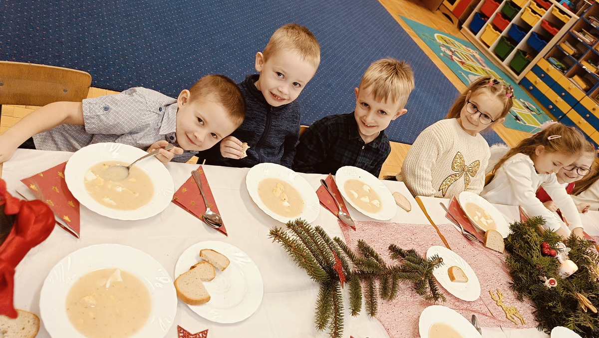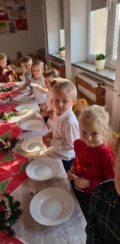 Wigilijne spotkanie przedszkolaków to tradycja pielęgnowana od lat w naszej placówce. Dzieci każdego roku poznają tradycje i zwyczaje świąteczne, aktywnie uczestniczą w przygotowaniach: wykonują ozdoby świąteczne, łańcuchy choinkowe oraz uczą się kolęd i pastorałek. W dzień przedszkolnej wigilii w całym przedszkolu panowała radosna, ożywiona atmosfera. Świąteczne dekoracje oraz dzieci w galowych strojach wprowadzały nastrój oczekiwania na wyjątkowe, niecodzienne wydarzenie.