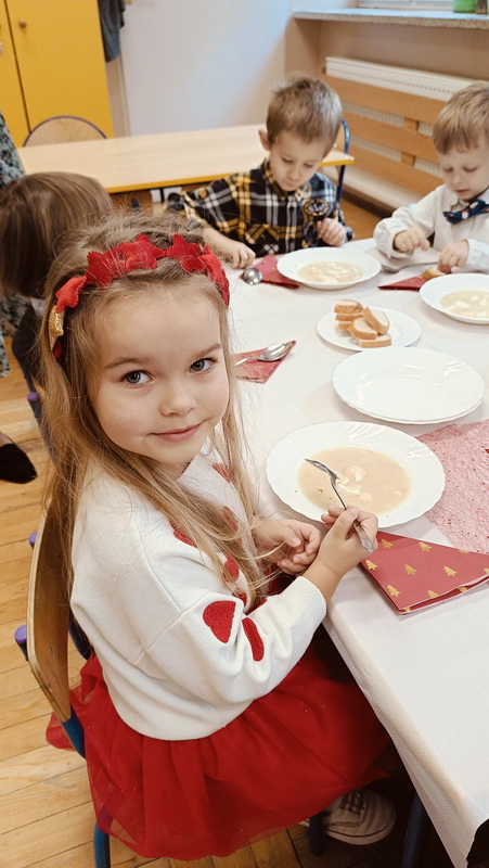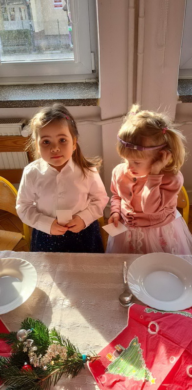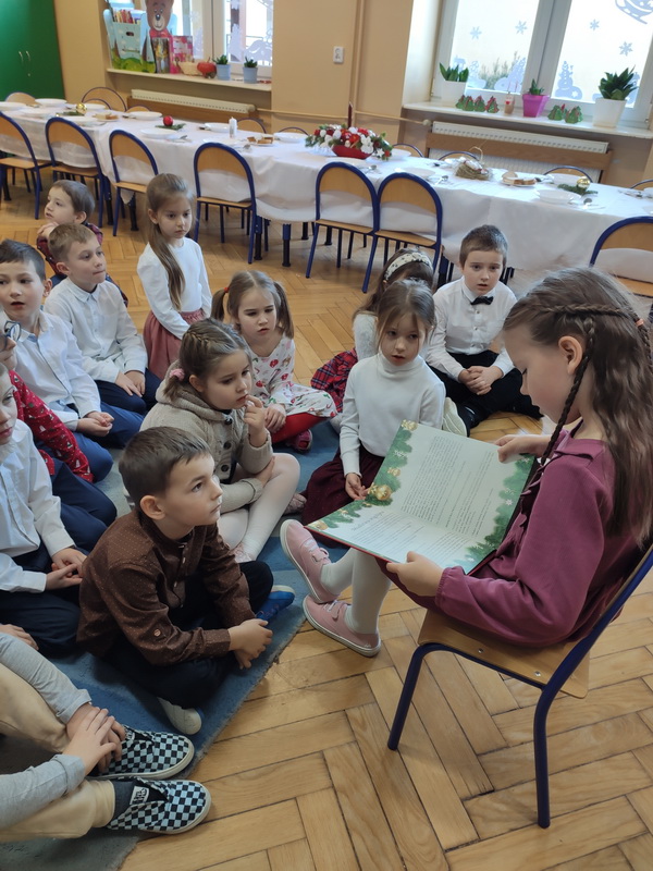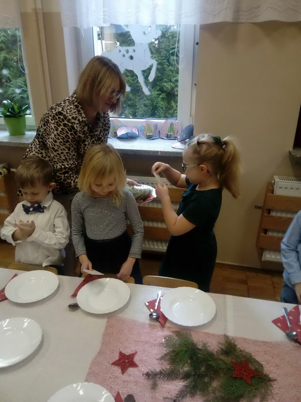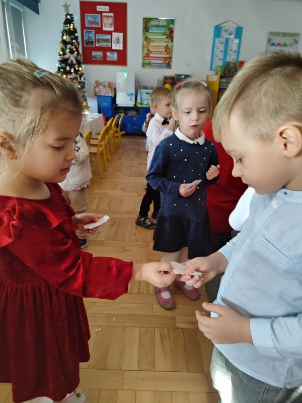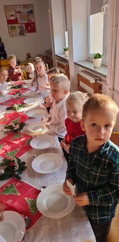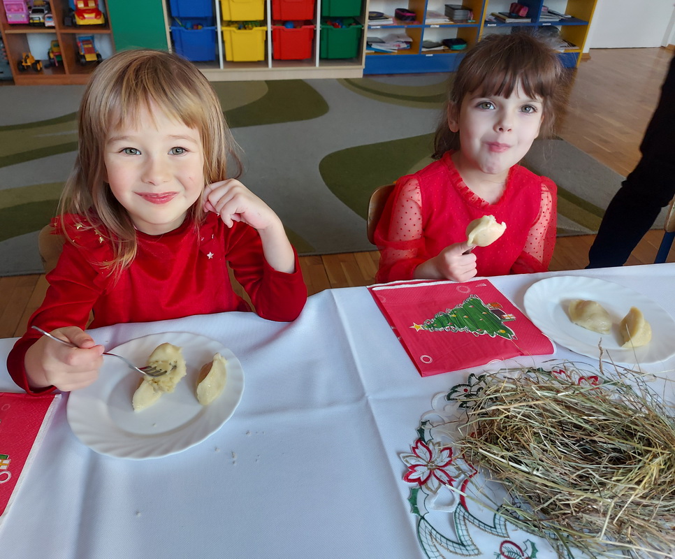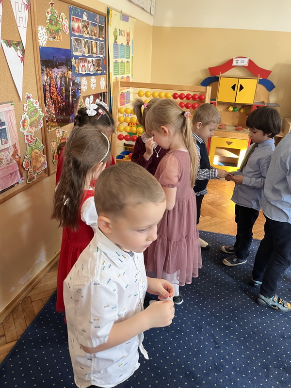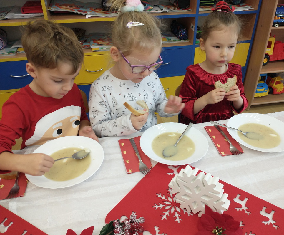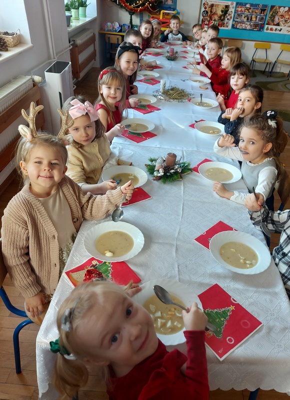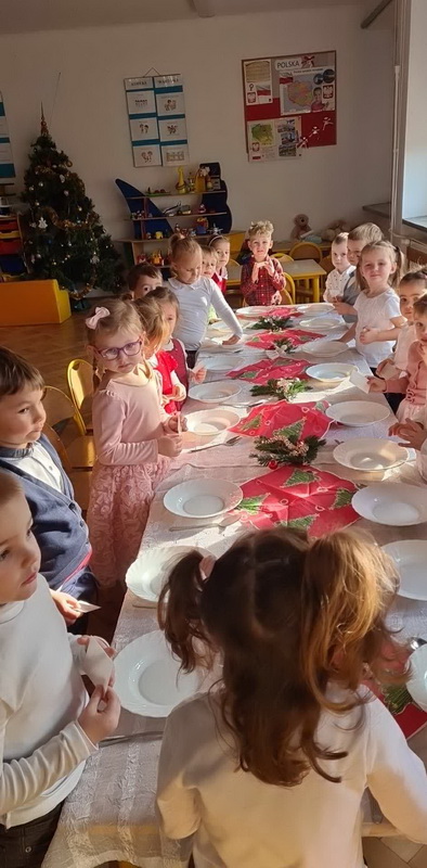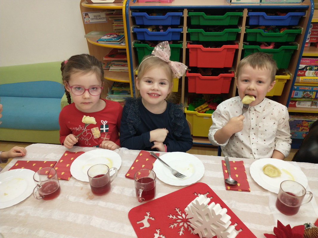 Wigilijne spotkanie przedszkolaków to tradycja pielęgnowana od lat w naszej placówce. Dzieci każdego roku poznają tradycje i zwyczaje świąteczne, aktywnie uczestniczą w przygotowaniach: wykonują ozdoby świąteczne, łańcuchy choinkowe oraz uczą się kolęd i pastorałek. W dzień przedszkolnej wigilii w całym przedszkolu panowała radosna, ożywiona atmosfera. Świąteczne dekoracje oraz dzieci w galowych strojach wprowadzały nastrój oczekiwania na wyjątkowe, niecodzienne wydarzenie.
