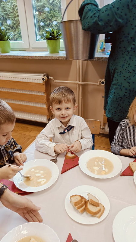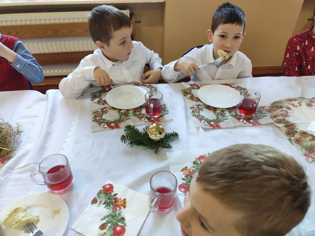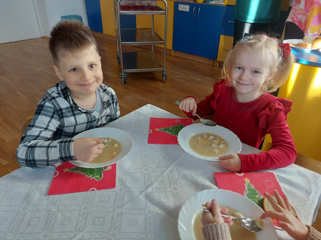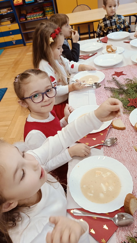 Spotkanie rozpoczęliśmy od dzielenia się opłatkiem i złożenia sobie świątecznych życzeń. Następnie dzieci wraz z nauczycielkami zasiadły do wigilijnego obiadu, przy pięknie udekorowanych stołach. W każdej grupie przedszkolnej rozbrzmiewały kolędy i pastorałki, śpiewane przez wszystkich obecnych. Był to wspaniały czas radości, który upłynął w miłej i serdecznej atmosferze. Wszystkie dzieci czuły zbliżające się wielkimi krokami święta Bożego Narodzenia.