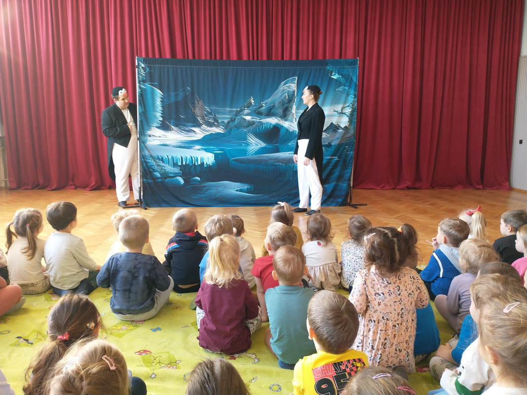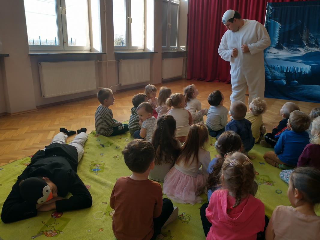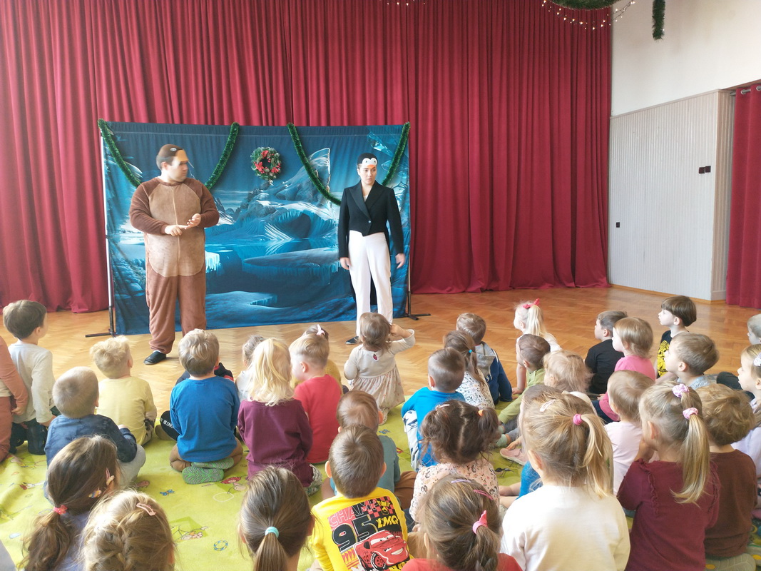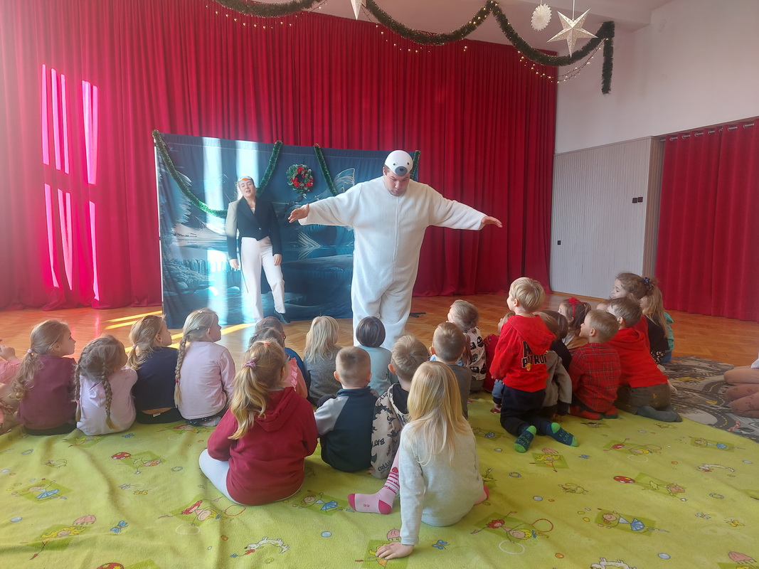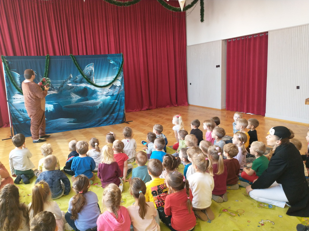 18 grudnia do naszego przedszkola zawitał Teatrzyk „Zielony Melonik”, prezentując spektakl pt. „Mimo wszystko”. Wraz z głównym bohaterem, pingwinkiem Zdzisiem, przenieśliśmy się na chwilę do lodowej krainy. Bohater nie miał pojęcia, co to znaczy „być grzecznym” i nie wiedział, czy św. Mikołaj na pewno go odwiedzi. Pingwinek dość nieoczekiwanie stanął przed dylematem, gdy jego przyjaciółka potrzebowała pomocy. Podjął on decyzję, by samodzielnie odnaleźć swoją koleżankę, pomimo czyhających niebezpieczeństw. Podczas spektaklu dzieci dowiedziały się, czym jest grzeczność, prawdziwa przyjaźń oraz jak odróżnić dobro od zła. Aktorzy umilili przedszkolakom dzień pięknym występem, który dzieci oglądały z wielkim zaciekawieniem.