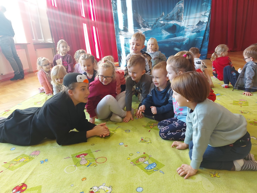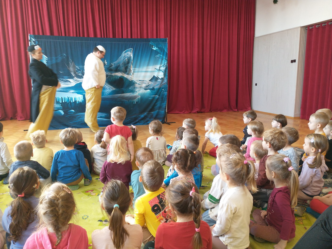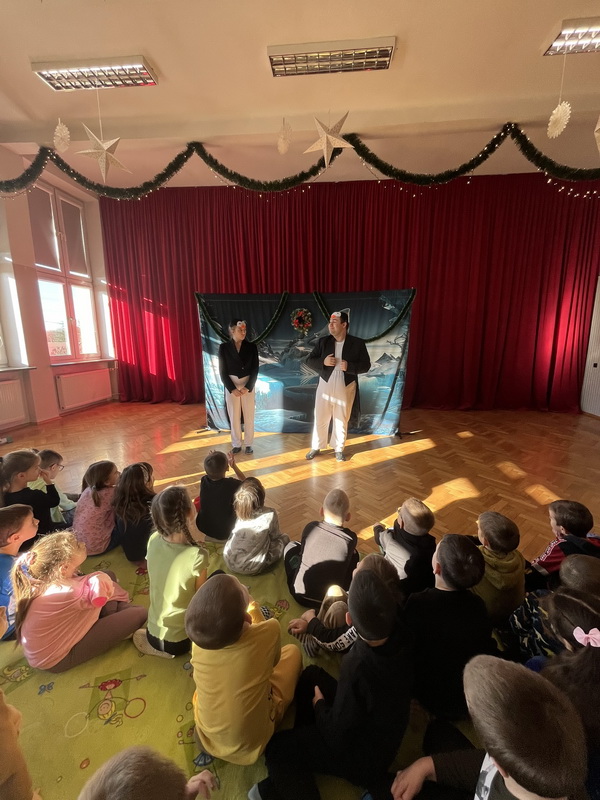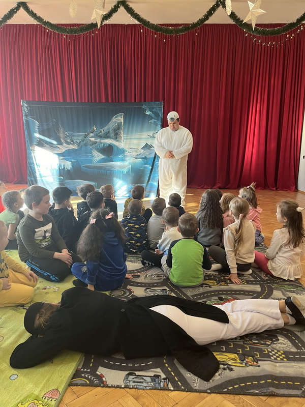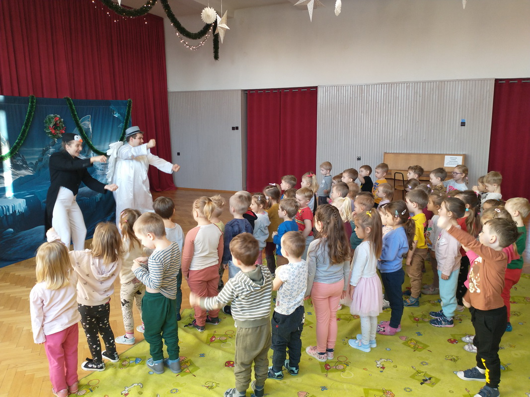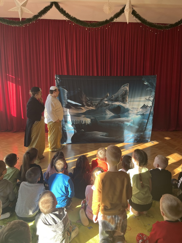 18 grudnia do naszego przedszkola zawitał Teatrzyk „Zielony Melonik”, prezentując spektakl pt. „Mimo wszystko”. Wraz z głównym bohaterem, pingwinkiem Zdzisiem, przenieśliśmy się na chwilę do lodowej krainy. Bohater nie miał pojęcia, co to znaczy „być grzecznym” i nie wiedział, czy św. Mikołaj na pewno go odwiedzi. Pingwinek dość nieoczekiwanie stanął przed dylematem, gdy jego przyjaciółka potrzebowała pomocy. Podjął on decyzję, by samodzielnie odnaleźć swoją koleżankę, pomimo czyhających niebezpieczeństw. Podczas spektaklu dzieci dowiedziały się, czym jest grzeczność, prawdziwa przyjaźń oraz jak odróżnić dobro od zła. Aktorzy umilili przedszkolakom dzień pięknym występem, który dzieci oglądały z wielkim zaciekawieniem.