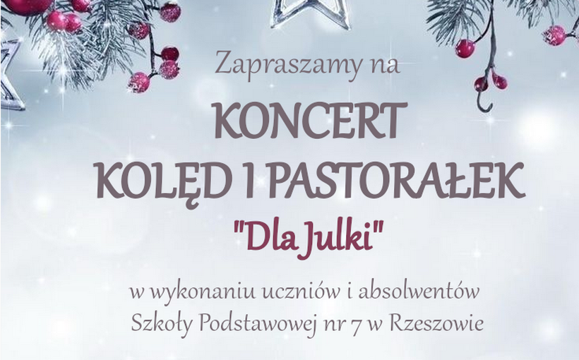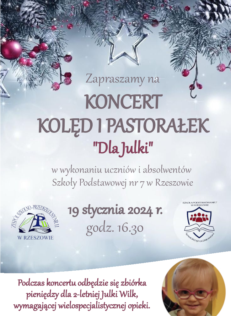 Samorząd Uczniowski Szkoły Podstawowej nr 7 w Rzeszowie serdecznie zaprasza uczniów, rodziców oraz mieszkańców osiedla Zwięczyca na Szkolny Koncert Kolęd i Pastorałek w wykonaniu naszych wychowanków i absolwentów. Odbędzie się on 19 stycznia 2024 r. o godz. 16.30 w sali gimnastycznej Zespołu Szkolno-Przedszkolnego nr 11 w Rzeszowie. Swe umiejętności instrumentalno-wokalne zaprezentują dzieci, młodzież, a także ich rodzice.