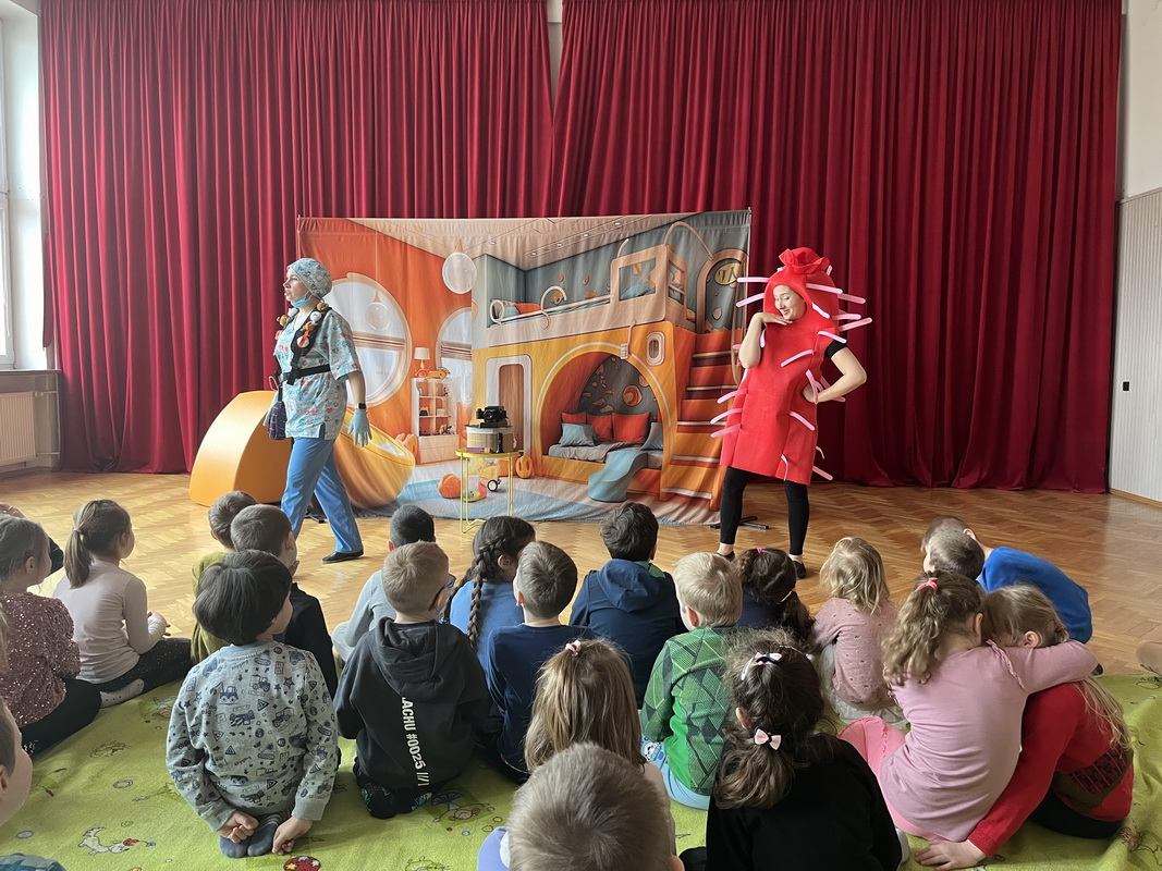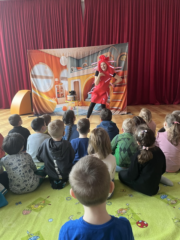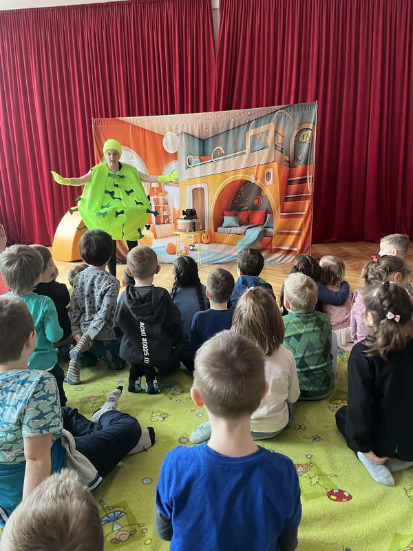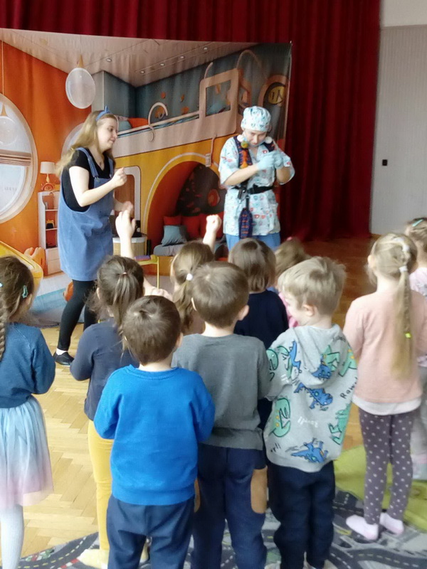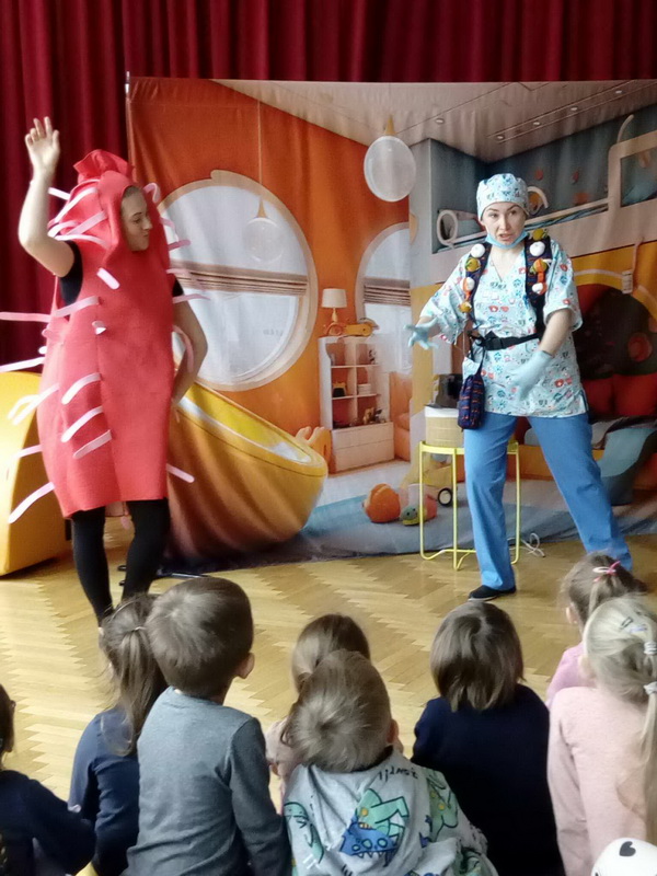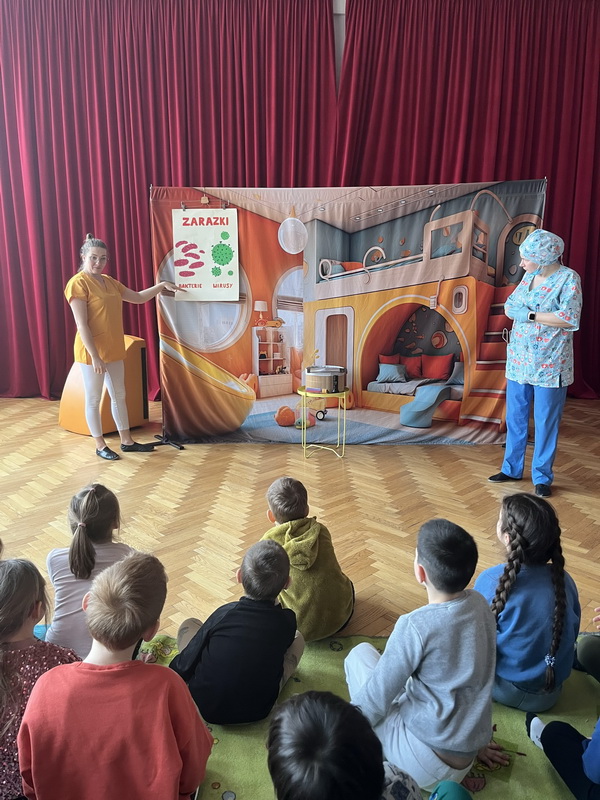 19 lutego br. gościliśmy w naszym przedszkolu Teatrzyk Zielony Melonik, który przybliżył dzieciom kilka kwestii na temat bakterii i wirusów. „Pod lupą” to opowieść o wędrówce zarazków. Ciekawa świata Marta docieka prawdy na temat wirusów i bakterii. Z odpowiedzią na nurtujące dziewczynkę pytania przychodzi tata, który wciela się w rolę szalonego naukowca. W ciekawy sposób rozjaśnia niejednokrotnie trudne zagadnienia. W parze z nim działają: szkło powiększające, lupa, mikroskop, a także światło ultrafioletowe. Jest to prawdziwa uczta dla zmysłów: wzroku i dotyku. Dzieci, wraz z głównymi bohaterami, naturalnie mogły doświadczać różnic między bakteriami a wirusami. Wszystko to pokazane zostało w zabawny sposób po to, by nauka zabrała strach i pozwoliła oswoić się z zarazkami, które przecież są z nami codziennie. Dziękujemy za piękne przedstawienie, które wywołało wśród naszych przedszkolaków duże zaciekawienie oraz sprawiło wiele radości i uśmiechu na twarzach małych widzów.