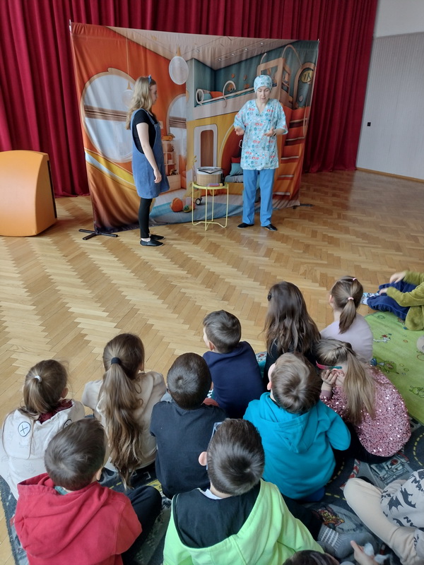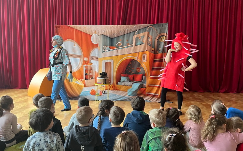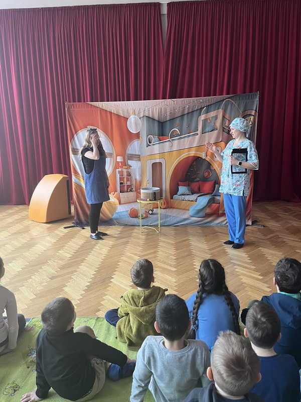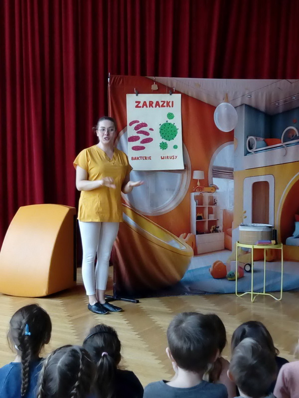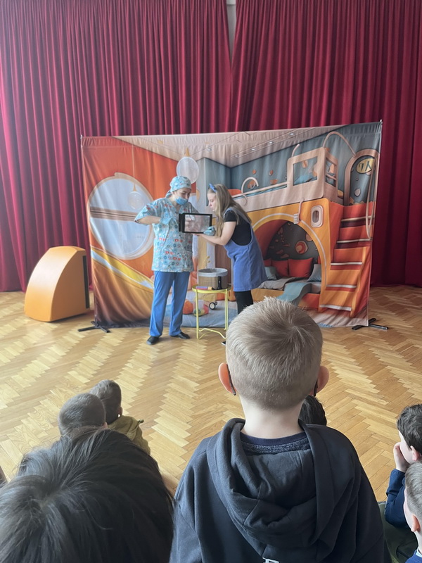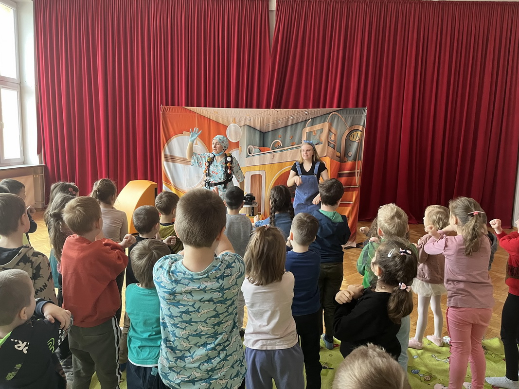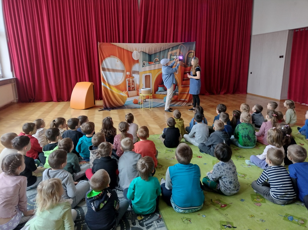19 lutego br. gościliśmy w naszym przedszkolu Teatrzyk Zielony Melonik, który przybliżył dzieciom kilka kwestii na temat bakterii i wirusów. „Pod lupą” to opowieść o wędrówce zarazków. Ciekawa świata Marta docieka prawdy na temat wirusów i bakterii. Z odpowiedzią na nurtujące dziewczynkę pytania przychodzi tata, który wciela się w rolę szalonego naukowca. W ciekawy sposób rozjaśnia niejednokrotnie trudne zagadnienia. W parze z nim działają: szkło powiększające, lupa, mikroskop, a także światło ultrafioletowe. Jest to prawdziwa uczta dla zmysłów: wzroku i dotyku. Dzieci, wraz z głównymi bohaterami, naturalnie mogły doświadczać różnic między bakteriami a wirusami. Wszystko to pokazane zostało w zabawny sposób po to, by nauka zabrała strach i pozwoliła oswoić się z zarazkami, które przecież są z nami codziennie. Dziękujemy za piękne przedstawienie, które wywołało wśród naszych przedszkolaków duże zaciekawienie oraz sprawiło wiele radości i uśmiechu na twarzach małych widzów.