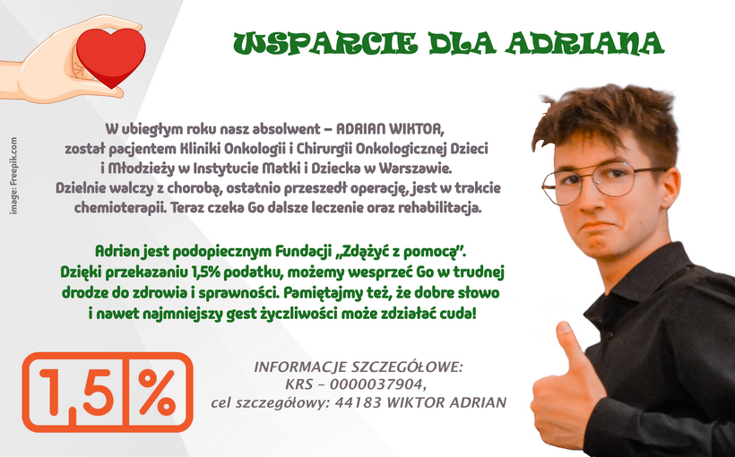 W ubiegłym roku nasz absolwent – ADRIAN WIKTOR, został pacjentem Kliniki Onkologii i Chirurgii Onkologicznej Dzieci i Młodzieży w Instytucie Matki i Dziecka w Warszawie. Dzielnie walczy z chorobą, ostatnio przeszedł operację, jest w trakcie chemioterapii. Teraz czeka Go dalsze leczenie oraz rehabilitacja.