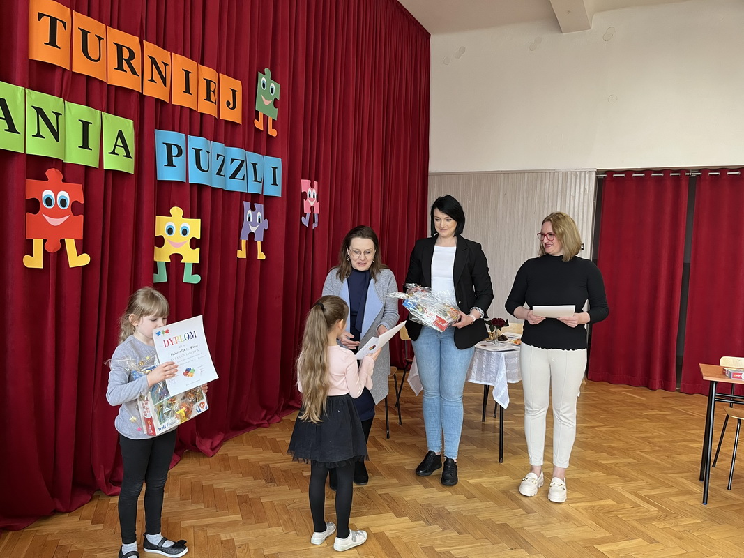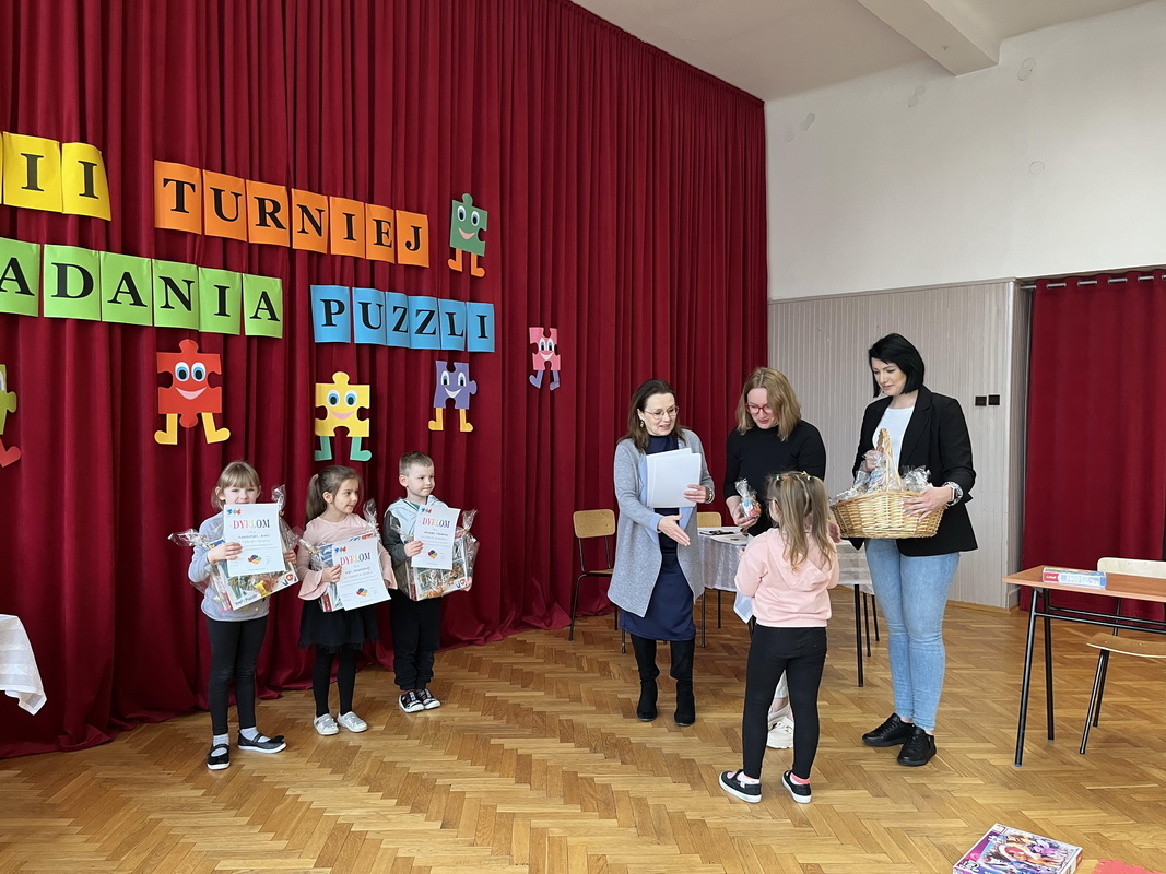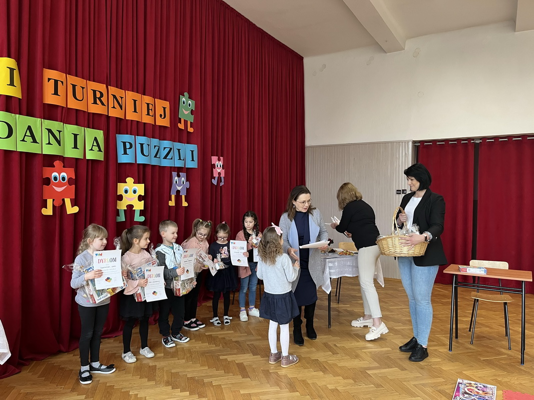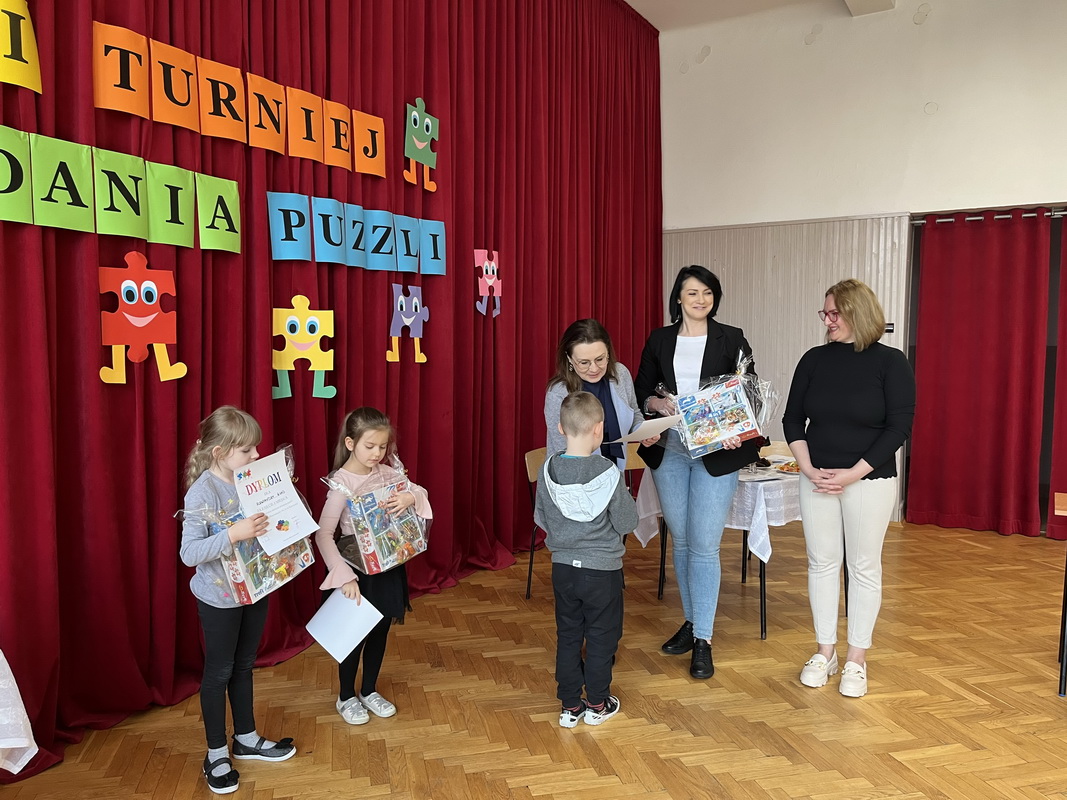 Turniej rozegrany został w dwóch kategoriach wiekowych: 3-4-latki oraz 5-6-latki i przebiegał dwuetapowo. W I etapie dzieci z każdej grupy, w salach przedszkolnych, układały puzzle na czas. Do II etapu turnieju wychowawcy wytypowali 3 zwycięzców eliminacji wewnątrzgrupowych. Uczestników II etapu przywitała pani dyrektor, życząc wszystkim dobrej zabawy oraz jak najlepszych wyników. Nad prawidłowym przebiegiem turnieju czuwała komisja konkursowa. Dzieci 3-4-letnie układały puzzle 24-elementowe, zaś dzieci 5-6-letnie – puzzle 60-elementowe. Podczas układania puzzli panowała cisza, skupienie i pełna mobilizacja, co świadczy o wielkim zaangażowaniu naszych przedszkolaków. Wykazali się oni wspaniałą koncentracją, spostrzegawczością oraz wytrwałością.