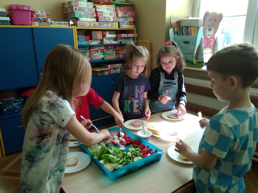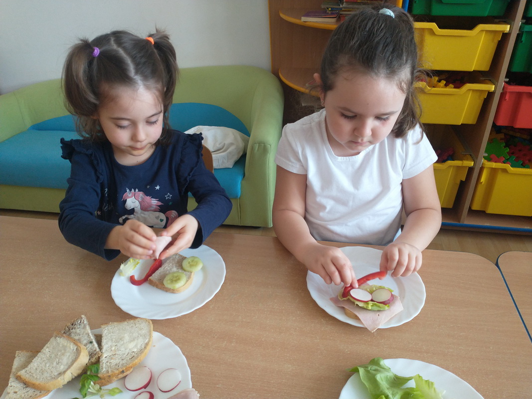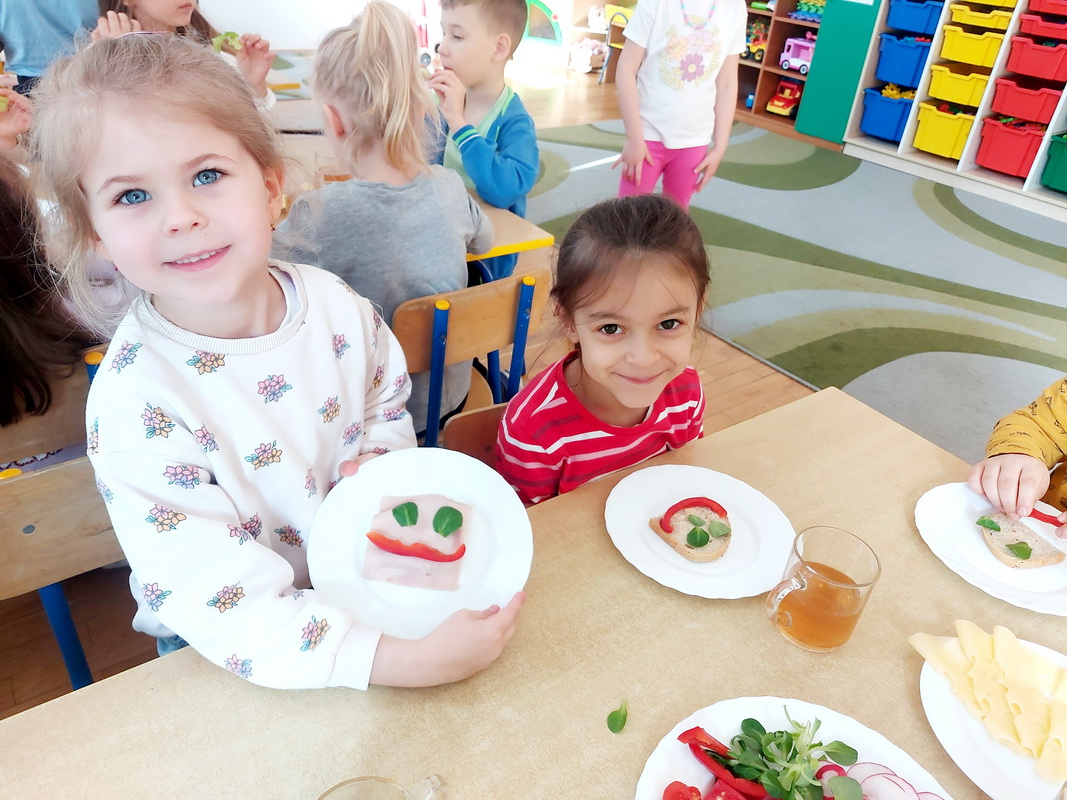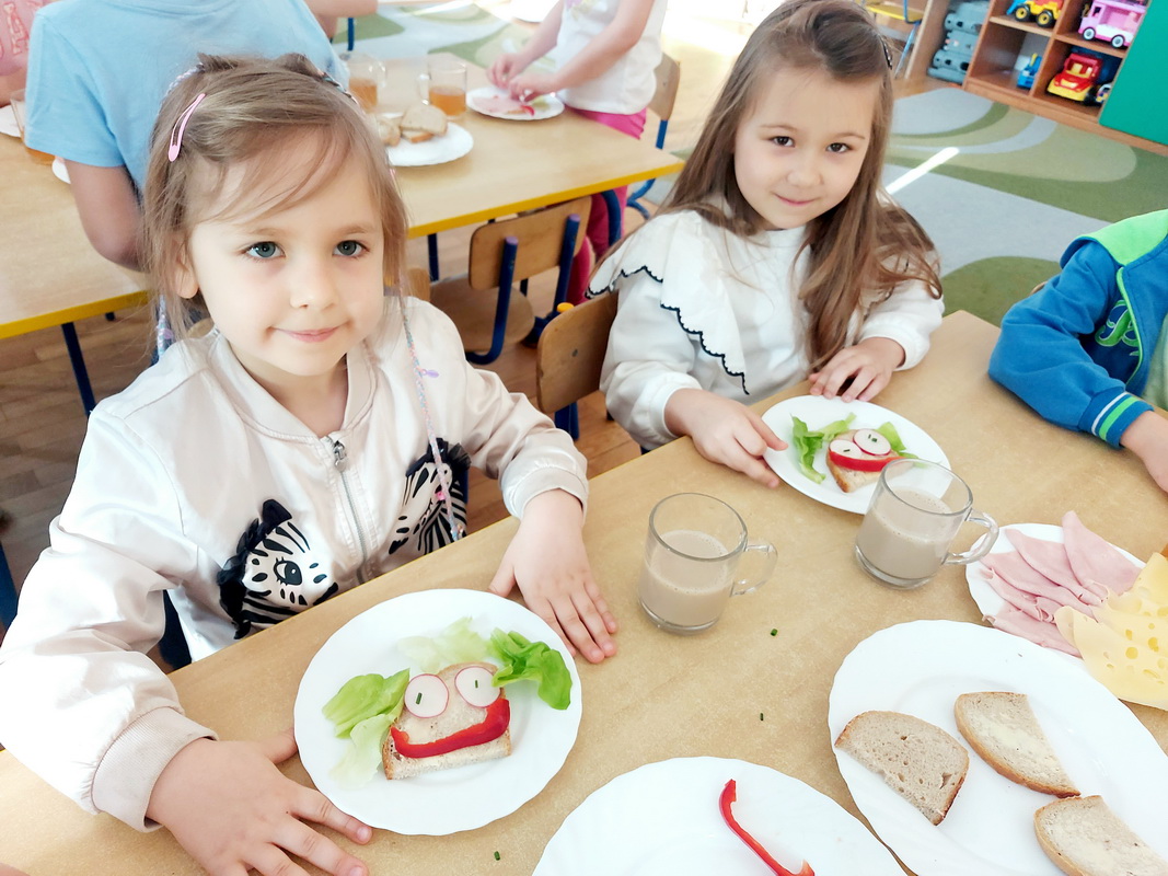 W kolejnych dniach odbyły się zabawy badawcze i eksperymenty związane z wodą i jej rolą w życiu człowieka, a także pogadanki i rozmowy o higienie osobistej czy też o racjonalnym odżywaniu z wykorzystaniem piramidy zdrowia. Śniadanie w formie szwedzkiego stołu sprawiło przedszkolakom najwięcej przyjemności. Kanapki sporządzone według własnego pomysłu smakowały im najlepiej.