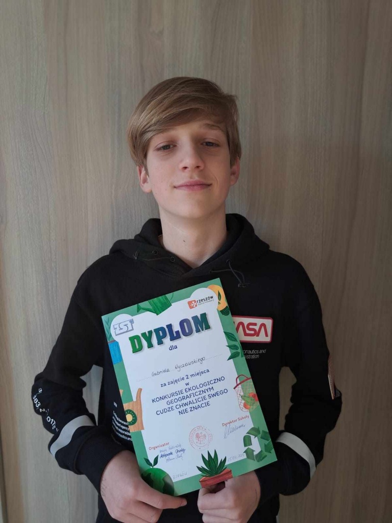 Z przyjemnością informujemy, że Gabriel Wyczawski zajął II miejsce w  V Konkursie Geograficzno-Krajoznawczym „Cudze chwalicie, swego nie znacie” dla uczniów szkół podstawowych, zorganizowanym przez Zespół Szkół Technicznych im. Eugeniusza Kwiatkowskiego w Rzeszowie. Tematyka dwuetapowego  konkursu  obejmowała  zagadnienia z zakresu geografii fizycznej (parki narodowe) i społeczno-ekonomicznej Polski, właściwych postaw proekologicznych oraz znajomości gatunków objętych ochroną w naszym regionie. Serdecznie gratulujemy!
