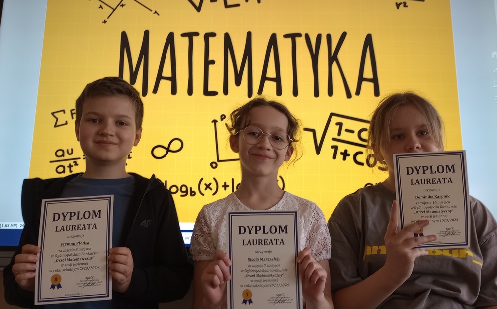 Z radością informujemy, że wśród laureatów Ogólnopolskiego Konkursu „Orzeł Matematyczny” znaleźli się uczniowie naszej szkoły: Nicola Marszałek, Sandra Sierżęga i Kalina Kowal z klasy 4a (opiekun: pani Małgorzata Jamrozy), oraz Dominika Karpiuk z kl. 4b i Szymon Płocica z kl. 5b (opiekun: pani Małgorzata Dronka). Składamy gratulacje, uczniowie wykazali się dużą wiedzą matematyczną.