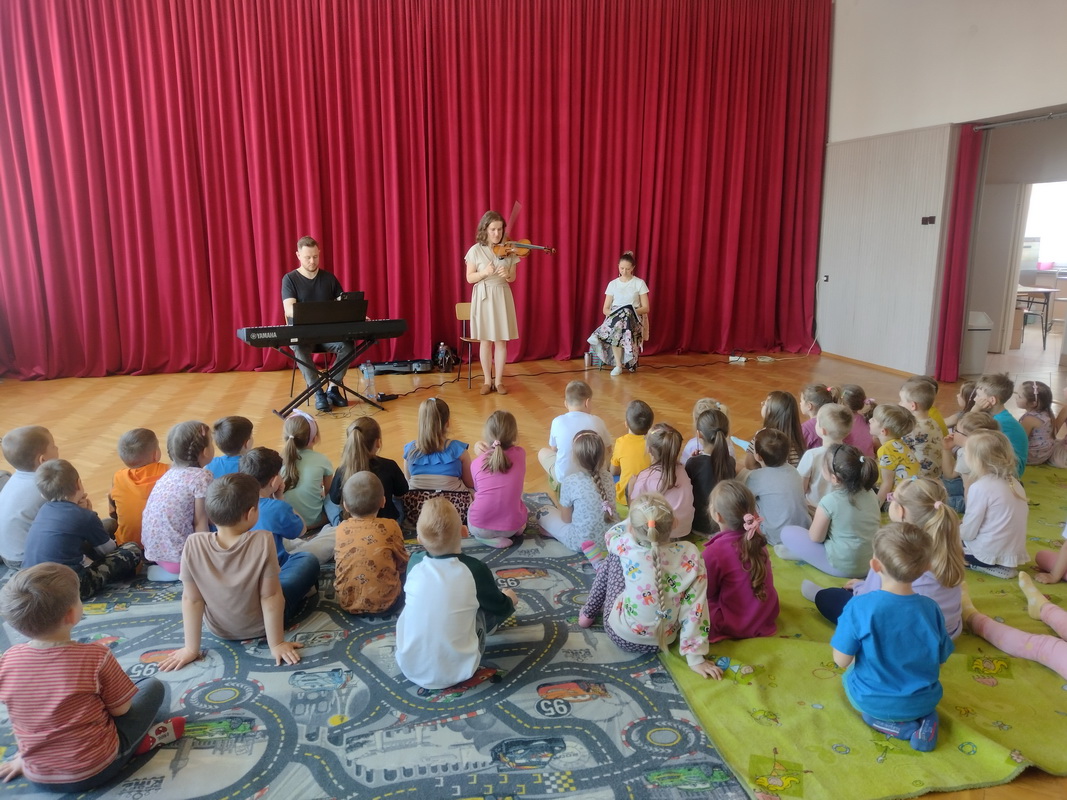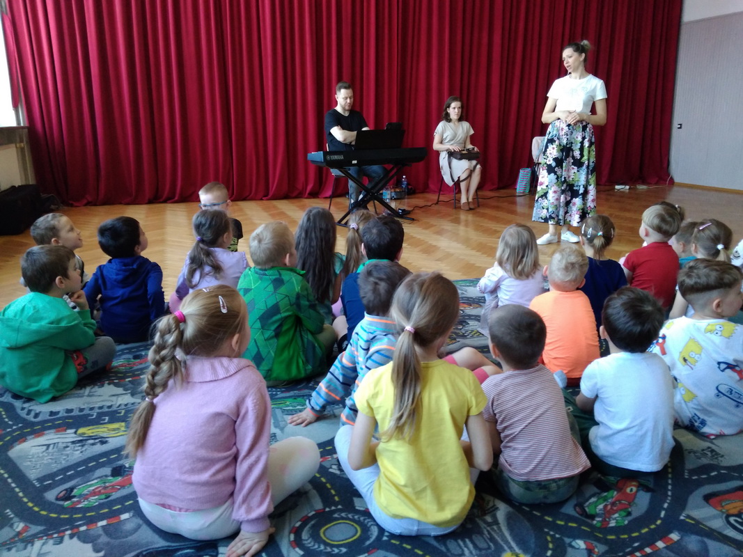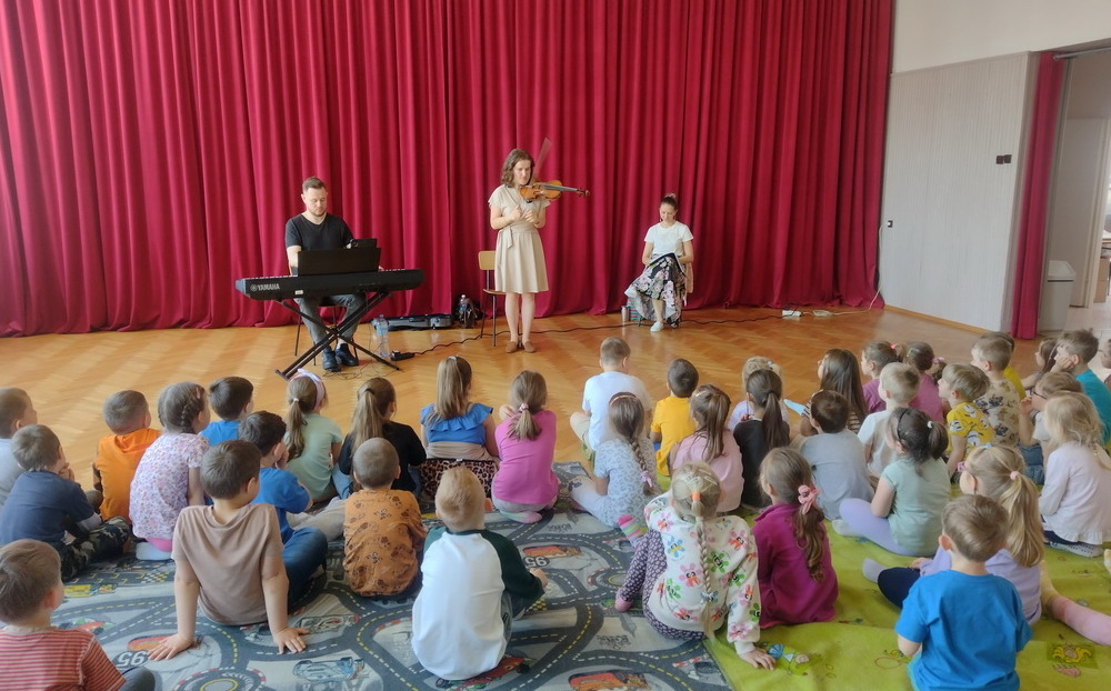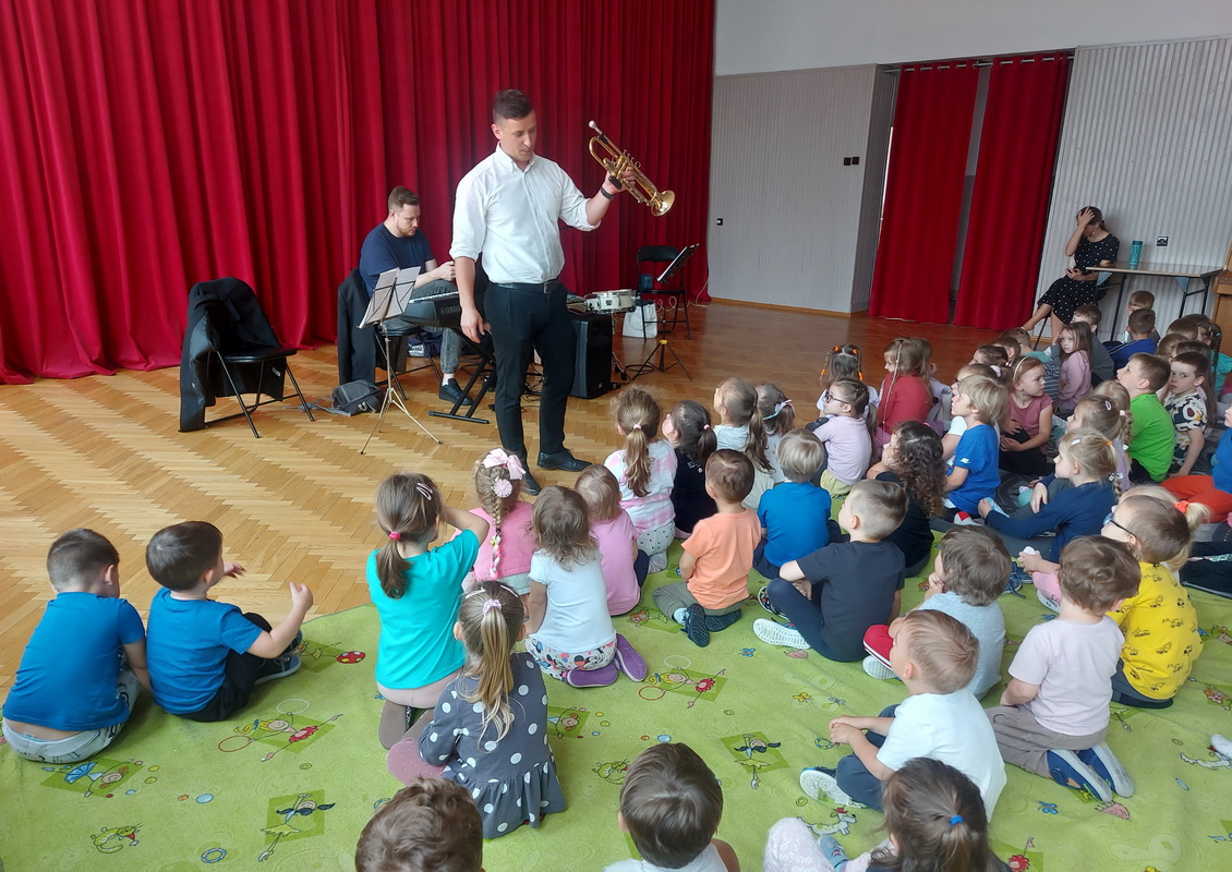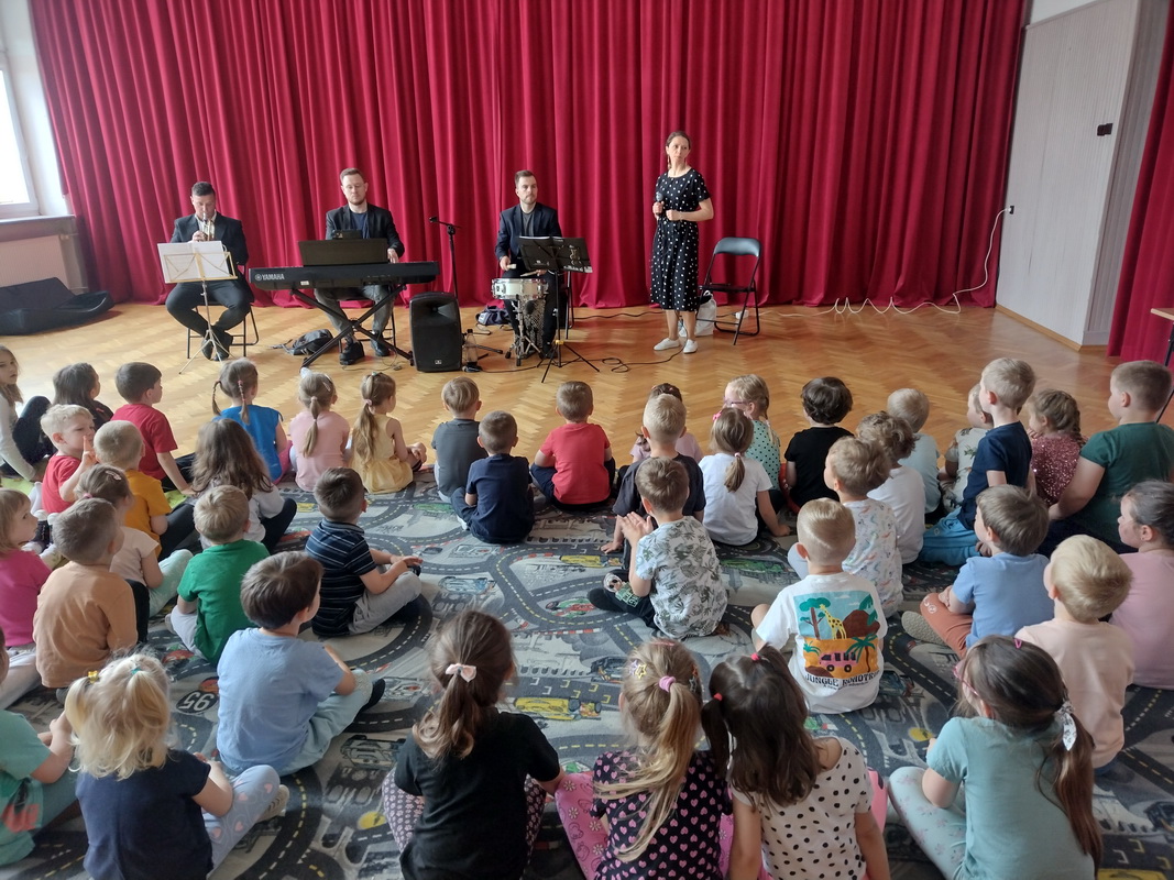 Na przełomie kwietnia i maja dwukrotnie gościliśmy muzyków z Filharmonii Podkarpackiej. Tytuł pierwszego spotkania brzmiał „Piękna nasza Polska cała – poznajemy tańce narodowe”. Podczas audycji dzieci dowiedziały się, jak ważną rolę w dziejach naszego narodu odgrywały tańce narodowe. Mowa tu o polonezie, mazurze, oberku, kujawiaku i krakowiaku. Wszystkie przedszkolaki z powagą, ale też z zaciekawieniem oglądały przygotowany występ.