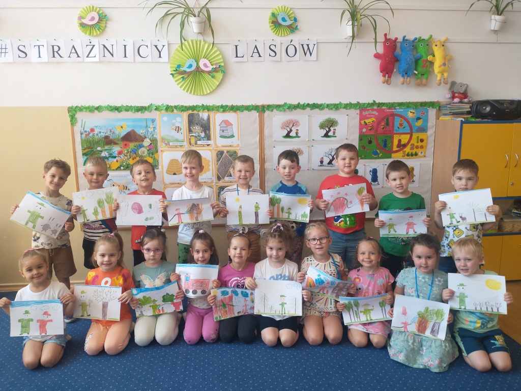 W 2023 roku w naszym kraju było 6900 pożarów lasów! Dlaczego o większości z nich nie słyszeliśmy? Ponieważ strażnicy lasów, czyli strażacy i leśnicy czuwają, aby się one nie rozprzestrzeniały. Z okazji przypadającego 29 maja Dnia Strażników Lasów, przedszkolaki z grupy Misie przystąpiły do udziału w akcji „Cała Polska maluje Giga Laurkę dla Strażników Lasów”.