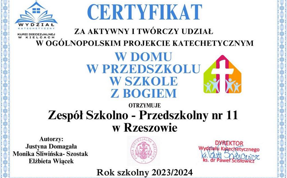 W roku szkolnym 2023/24 nasza szkoła brała udział w Ogólnopolskim Projekcie Katechetycznym „W domu, w przedszkolu, w szkole z Bogiem”, przeznaczonym dla przedszkoli oraz uczniów klas 1-5 szkoły podstawowej. Głównym celem projektu było odkrywanie tajemnicy osobowego Boga, objawiającego ludziom swoją miłość, poprzez współdziałanie z rodzinami, różnymi środowiskami, organizacjami i instytucjami wspierającymi rozwój tożsamości religijnej dziecka. Regulamin powstał w oparciu o Podstawę Programową Katechezy Kościoła Katolickiego w Polsce, Podstawę Programową Kształcenia Ogólnego oraz kierunki polityki oświatowej państwa na rok szkolny 2023/2024.