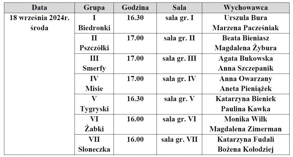 Informujemy, że spotkania wychowawców poszczególnych grup przedszkolnych z rodzicami odbędą się 18 września (środa) według harmonogramu zamieszczonego poniżej: