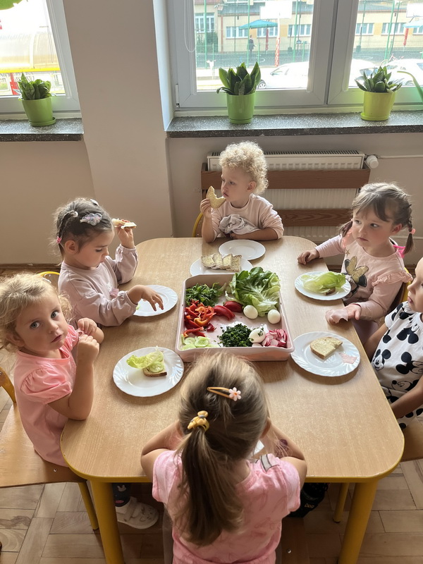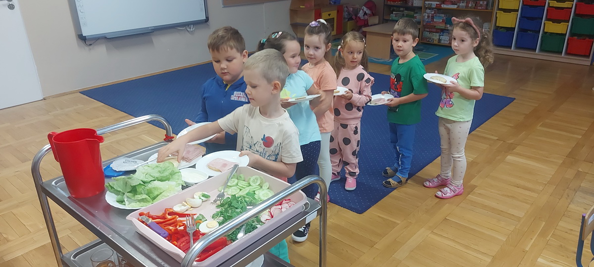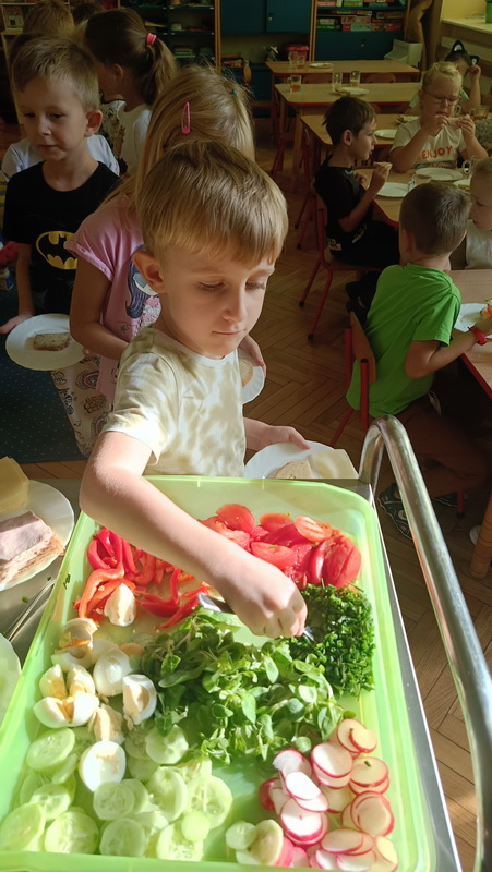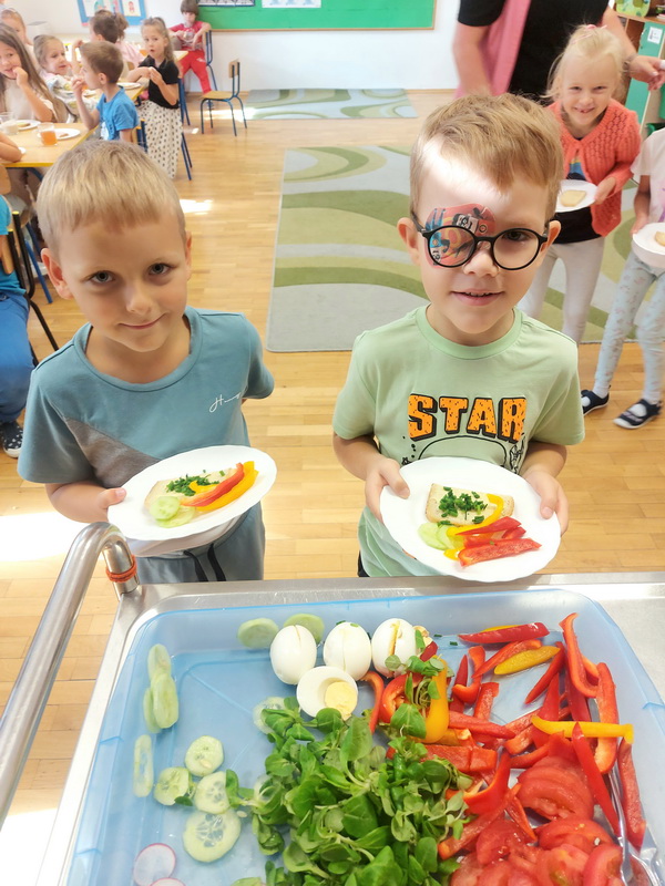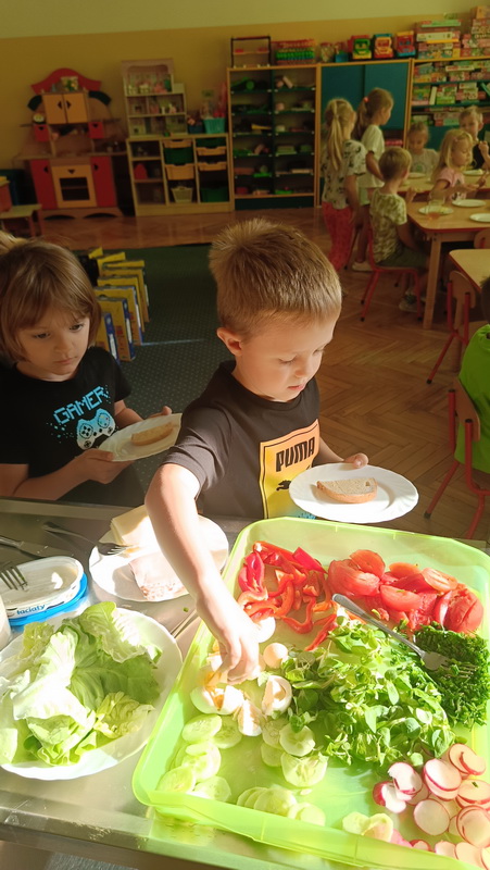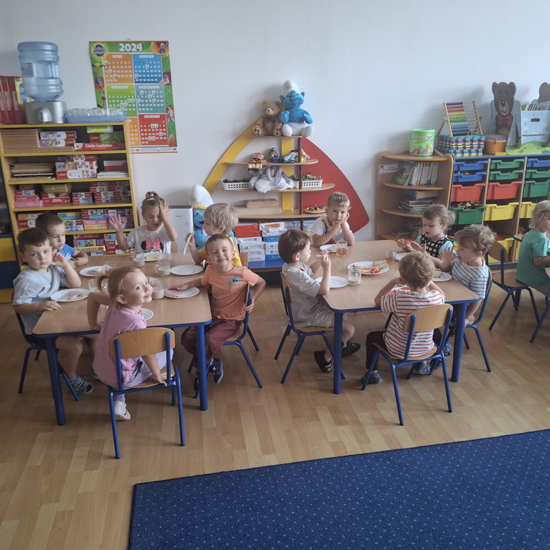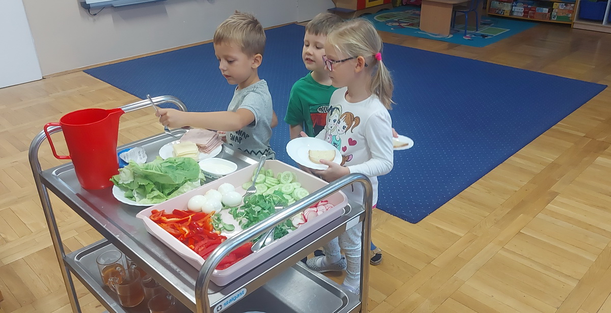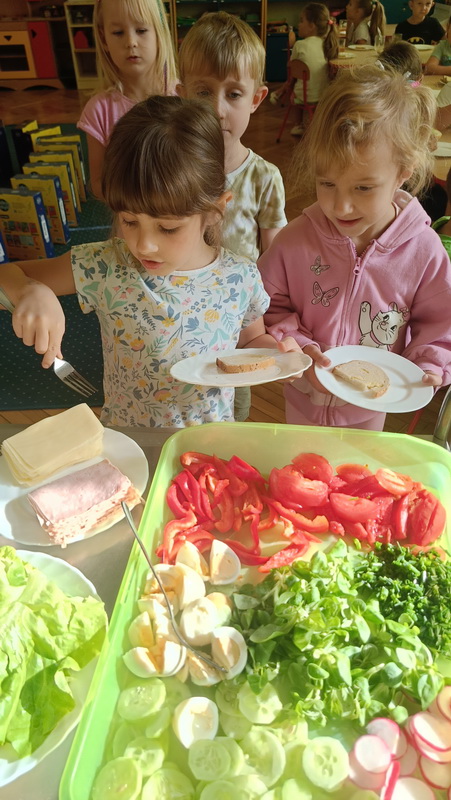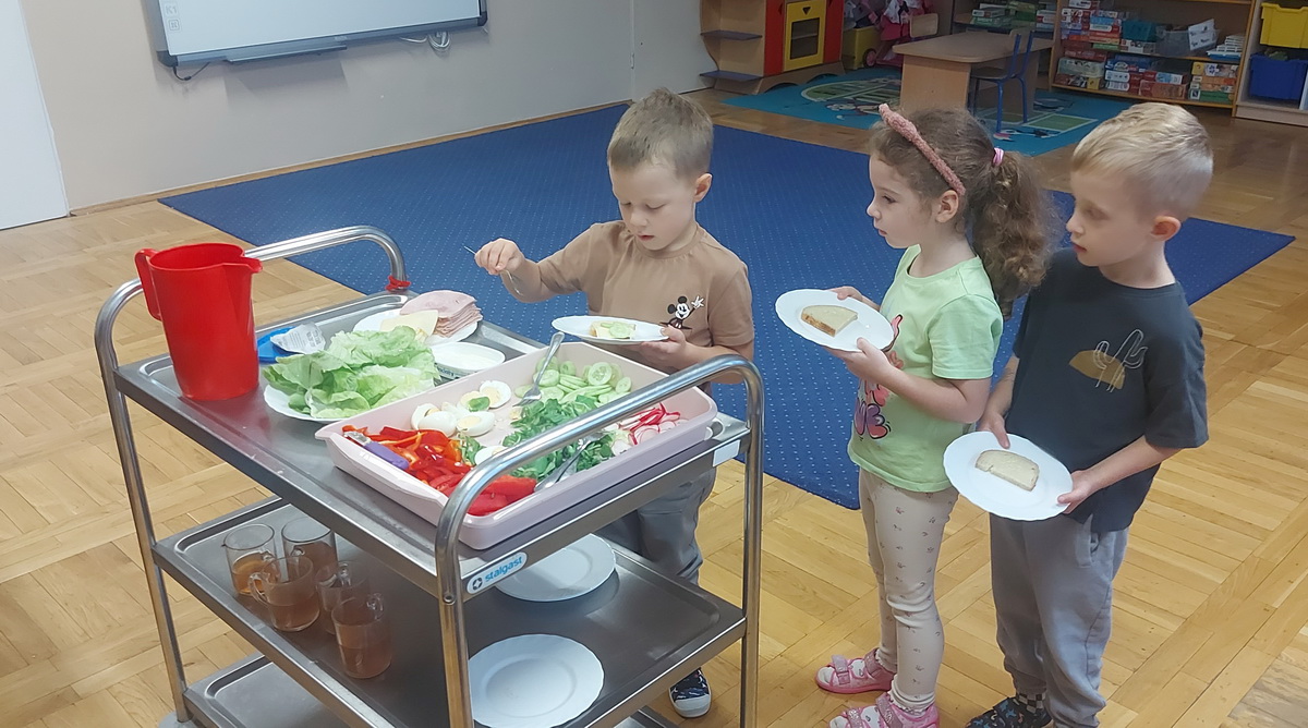 W naszym przedszkolu dbamy o zdrowe nawyki żywieniowe i rozwój samodzielności dzieci, dlatego śniadania serwujemy w formie szwedzkiego stołu! Dzięki temu przedszkolaki uczą się podejmować decyzje i poznają różnorodne smaki. Sezonowe warzywa, takie jak marchewka, papryka czy ogórek, sprzyjają budowaniu odporności. Do tego soczyste owoce, pełne witamin, a także pełnoziarniste pieczywo, sery i inne, zdrowe przekąski. Dzieci mogą również kreatywnie ozdobić swoje talerze, tworząc kolorowe i smaczne kompozycje z wybranych produktów.